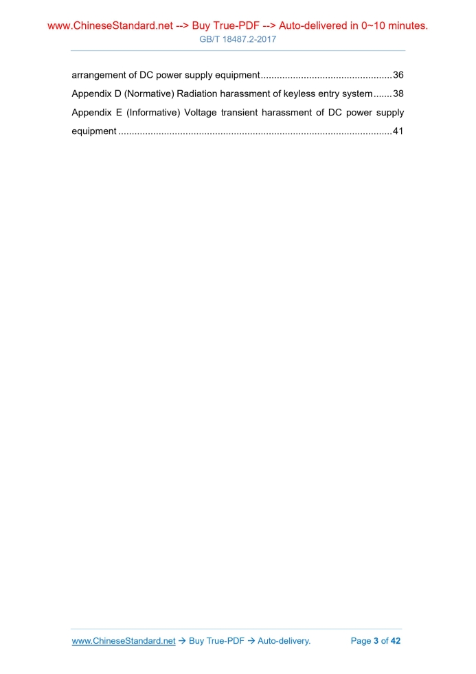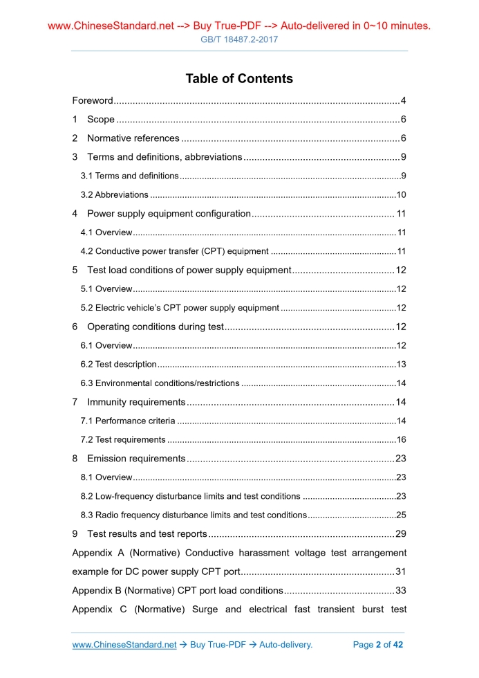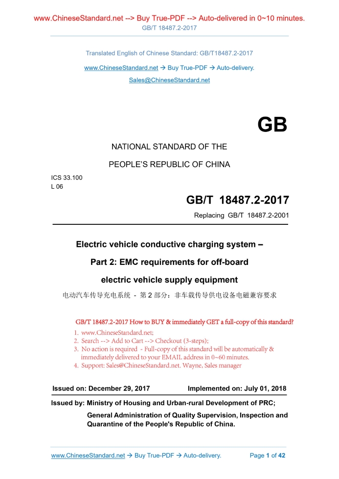 Similar standardsGB/T 18487.2-2017: Electric vehicle conductive charging system - Part 2: EMC requirements for off-board electric vehicle supply equipment---This is an excerpt. Full copy of true-PDF in English version (including equations, symbols, images, flow-chart, tables, and figures etc.), auto-downloaded/delivered in 9 seconds, can be purchased online: https://www.ChineseStandard.net/PDF.aspx/GBT18487.2-2017 GB NATIONAL STANDARD OF THE PEOPLE’S REPUBLIC OF CHINA ICS 33.100 L 06 Replacing GB/T 18487.2-2001 Electric vehicle conductive charging system – Part 2.EMC requirements for off-board electric vehicle supply equipment Issued on: DECEMBER 29, 2017 Implemented on: JULY 01, 2018 Issued by. Ministry of Housing and Urban-rural Development of PRC; General Administration of Quality Supervision, Inspection and Quarantine of the People's Republic of China. Table of ContentsForeword... 4 1 Scope... 6 2 Normative references... 6 3 Terms and definitions, abbreviations... 9 3.1 Terms and definitions... 9 3.2 Abbreviations... 10 4 Power supply equipment configuration... 11 4.1 Overview... 11 4.2 Conductive power transfer (CPT) equipment... 11 5 Test load conditions of power supply equipment... 12 5.1 Overview... 12 5.2 Electric vehicle’s CPT power supply equipment... 12 6 Operating conditions during test... 12 6.1 Overview... 12 6.2 Test description... 13 6.3 Environmental conditions/restrictions... 14 7 Immunity requirements... 14 7.1 Performance criteria... 14 7.2 Test requirements... 16 8 Emission requirements... 23 8.1 Overview... 23 8.2 Low-frequency disturbance limits and test conditions... 23 8.3 Radio frequency disturbance limits and test conditions... 25 9 Test results and test reports... 29 Appendix A (Normative) Conductive harassment voltage test arrangement example for DC power supply CPT port... 31 Appendix B (Normative) CPT port load conditions... 33 Appendix C (Normative) Surge and electrical fast transient burst test arrangement of DC power supply equipment... 36 Appendix D (Normative) Radiation harassment of keyless entry system... 38 Appendix E (Informative) Voltage transient harassment of DC power supply equipment... 411 ScopeThis part of GB/T 18487 specifies the electromagnetic compatibility requirements of the electric vehicle power supply equipment for electrical vehicle off-board conductive charging (hereinafter referred to as the power supply equipment). The maximum rated voltage of the power supply of the power supply equipment is 1000 VAC or 1500 VDC, the maximum rated output voltage is 1000 VAC or 1500 VDC. This part applies to the power supply equipment of the charging mode 2, charging mode 3, charging mode 4 as specified in GB/T 18487.1. This part applies to the electrical vehicle power supply equipment which obtains energy from the field energy storage system (such as buffer battery, etc.). In this part, it considers that the power cables without electronic components or switches (except for manual switch) are passive, which comply with the emission and immunity requirements, so they do not require test any more. This part does not apply to any on-board power supply equipment AND the components and equipment to supply power or charge the electrical vehicle. This part does not apply to the power supply equipment supplying power or charging the electrical vehicle through wireless charging (WPT) method. This part does not apply to trolley buses, railway vehicles, industrial vehicles and the power supply equipment which is mainly for non-road vehicles.2 Normative referencesThe following documents are essential to the application of this document. For the dated documents, only the versions with the dates indicated are applicable to this document; for the undated documents, only the latest version (including all the amendments) are applicable to this document. GB/T 4365 Electrotechnical terminology - Electromagnetic compatibility GB 4824-2013 Industrial, scientific and medical equipment - Radio- frequency disturbance characteristics - Limits and methods of measurement GB/T 6113.102-2008 Specification for radio disturbance and immunity measuring apparatus and methods - Part 1-2.Radio disturbance and immunity measuring apparatus - Ancillary equipment - Conducted disturbance GB/T 6113.201 Specification for radio disturbance and immunity measuring apparatus and methods - Part 2-1.Methods of measurement of disturbances and immunity - Conducted disturbance measurements GB/T 17215.321 Electricity metering equipment (A.C.) - Particular requirements - Part 21.Static meters for active energy (classes 1 and 2) GB 17625.1 Electromagnetic compatibility - Limits - Limits for harmonic current emissions (equipment input current ≤ 16 A per phase) GB/T 17625.2 Electromagnetic compatibility (EMC) - Limits - Limitation of voltage changes, voltage fluctuations and flicker in public low-voltage supply systems, for equipment with rated current ≤ 16 A per phase and not subject to conditional connection GB/T 17625.7 Electromagnetic compatibility - Limits - Limitation of voltage changes, voltage fluctuations and flicker in public low-voltage supply systems for equipment with rated current ≤ 75 A and subject to conditional connection GB/T 17625.8 Electromagnetic compatibility - Limits - Limits for harmonic currents produced by equipment connected to public low-voltage systems with input current >16 A and ≤ 75 A per phase GB/T 17626.2 Electromagnetic compatibility - Testing and measurement techniques - Electrostatic discharge immunity test GB/T 17626.3 Electromagnetic compatibility - Testing and measurement techniques - Radiated radio-frequency electromagnetic field immunity test GB/T 17626.4 Electromagnetic compatibility - Testing and measurement techniques - Electrical fast transient/burst immunity test GB/T 17626.5 Electromagnetic compatibility - Testing and measurement techniques - Surge immunity test GB/T 17626.6 Electromagnetic compatibility - Testing and measurement technique