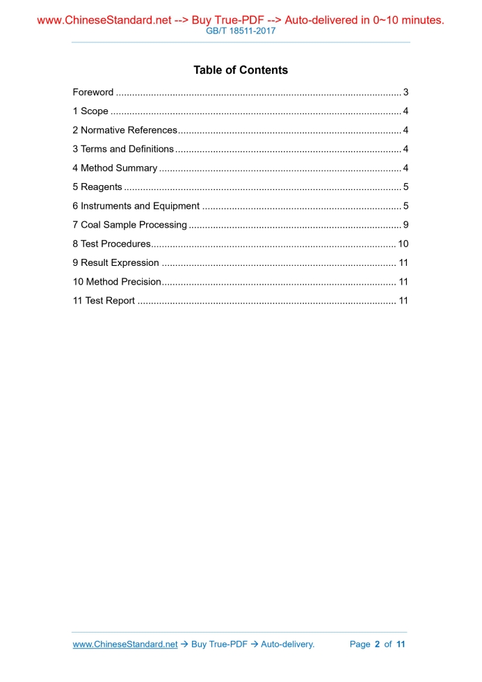 Similar standardsGB/T 18511-2017: Determination of Ignition Temperature of Coal---This is an excerpt. Full copy of true-PDF in English version (including equations, symbols, images, flow-chart, tables, and figures etc.), auto-downloaded/delivered in 9 seconds, can be purchased online: https://www.ChineseStandard.net/PDF.aspx/GBT18511-2017NATIONAL STANDARD OF THE PEOPLE’S REPUBLIC OF CHINA ICS 73.040 D 21 Replacing GB/T 18511-2001 Determination of Ignition Temperature of Coal ISSUED ON: SEPTEMBER 7, 2017 IMPLEMENTED ON: APRIL 1, 2018 Issued by: General Administration of Quality Supervision, Inspection and Quarantine; Standardization Administration of the People’s Republic of China. Table of ContentsForeword ... 3 1 Scope ... 4 2 Normative References ... 4 3 Terms and Definitions ... 4 4 Method Summary ... 4 5 Reagents ... 5 6 Instruments and Equipment ... 5 7 Coal Sample Processing ... 9 8 Test Procedures ... 10 9 Result Expression ... 11 10 Method Precision ... 11 11 Test Report ... 11 Determination of Ignition Temperature of Coal1 ScopeThis Standard specifies the terms and definitions, method summary, reagents, instruments and equipment, coal sample processing, test procedures, result expression, method precision and test report for the determination of ignition temperature of coal. This Standard is applicable to lignite, bituminous and anthracite.2 Normative ReferencesThe following documents are indispensable to the application of this document. In terms of references with a specified date, only versions with a specified date are applicable to this document. In terms of references without a specified date, the latest version (including all the modifications) is applicable to this document. GB/T 483-2007 General Rules for Analytical and Testing Methods of Coal3 Terms and DefinitionsWhat is defined in GB/T 483-2007, and the following terms and definitions are applicable to this document. For ease of use, some terms and definitions in GB/T 483- 2007 are repeatedly listed. 3.1 Ignition Temperature Ignition temperature refers to the minimum combustion temperature, at which, coal emits enough volatiles to form a combustible mixture with the surrounding atmosphere. [GB/T 483-2007, Definition 3.2.35]4 Method SummaryPlace a processed coal sample into the initiation temperature determination device. At a certain rate, heat it up. When it reaches a certain temperature, the coal sample suddenly burns. Record the temperature, at which, the air volume in the determination system suddenly expands or the heating rate suddenly increases as the ignition temperature of the coal.5 ReagentsWarning---since benzidine is a moderately toxic carcinogen, attempts shall be made to minimize its long-term exposure to the air during the test. The operation shall be carried out in a fume hood to avoid direct contact with the human body. Unless it is otherwise stipulated, reagents confirmed to be analytically pure, and distilled water or deionized water, or water of equivalent purity shall merely be used in the analysis. 5.1 Sodium nitrite: before use, it shall be dried in a blast drying oven at 102 °C ~ 105 °C for 1 h. 5.2 Benzidine. 5.3 Reducing agent: weigh-take 0.075 g of sodium nitrite and 0.0025 g of benzidine; evenly mix them up. Prepare it before the test. 5.4 Hydrogen peroxide solution: mass fraction is 30%.6 Instruments and Equipment6.1 Ignition Temperature Determination Device The device is shown in Figure 1. See the requirements for the various parts below: a) Heating furnace: round; can be heated to 600 °C; temperature adjustable. b) Heating body: made of copper or aluminum alloy; 7 holes; see Figure 2. c) Temperature measurement and control instrument: can control the temperature-rising rate from 4.5 °C/min to 5.0 °C/min within the range of 100 °C ~ 500 °C; temperature measurement accuracy is ± 1 °C. d) Buffer ball (see Figure 3). It can control the temperature at 102 °C ~ 105 °C. 6.6 Analytical Balance Division value: 0.1 mg. 6.7 Glass Weighing Bottle Diameter: 40 mm; height: 25 mm; with a tight grinding cover. 6.8 Agate Mortar7 Coal Sample Processing7.1 Raw Coal Sample In the weighing bottle, weigh-take 0.5 g ~ 1.0 g of coal sample for general analysis and test. Place it in a vacuum drying oven at the temperature of 55 °C ~ 60 °C and the pressure of 53 kPa to dry for 2 h. Then, take it out and put it into a desiccator to cool down to the room temperature. Before the test, weigh-take 0.09 g ~ 0.11 g of dried coal sample and 0.075 g of sodium nitrite; gently grind them in an agate mortar for 1 min ~ 2 min; evenly mix it up. 7.2 Oxidized Coal Sample In the weighing bottle, weigh-take 0.5 g ~ 1.0 g of coal sample for general analysis and test. Use a dropper to add drips of hydrogen peroxide solution (add around 0.5 mL per gram of coal); use a glass rod to stir it. Cover it with a lid, then, place it in a dark place for 24 h. Then, open the lid and expose to sunlight or incandescent lamp for 2 h; place it in a vacuum drying oven at the temperature of 55 °C ~ 60 °C and the pressure of 53 kPa to dry for 2 h. Then, take it out and put it into a desiccator to cool down to the room temperature. Before the test, weigh-take 0.09 g ~ 0.11 g of coal sample that goes through the above-mentioned processing and 0.075 g of sodium nitrite; gently grind them in an agate mortar for 1 min ~ 2 min; evenly mix it up. 7.3 Reduced Coal Sample In the weighing bottle, weigh-take 0.5 g ~ 1.0 g of coal sample for general analysis and test. Place it in a vacuum drying oven at the temperature of 55 °C ~ 60 °C and the pressure of 53 kPa to dry for 2 h. Then, take it out and put it into a desiccator to cool down to the room temperature. Before the test, weigh-take 0.09 g ~ 0.11 g of dried coal sample and reducing agent (5.3); gently grind them in an agate mortar for 1 min ~ 2 min; evenly mix it up.8 Test Procedures8.1 Manual Determination 8.1.1 In accordance with Figure 1, connect the various parts of the device. 8