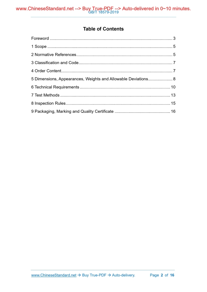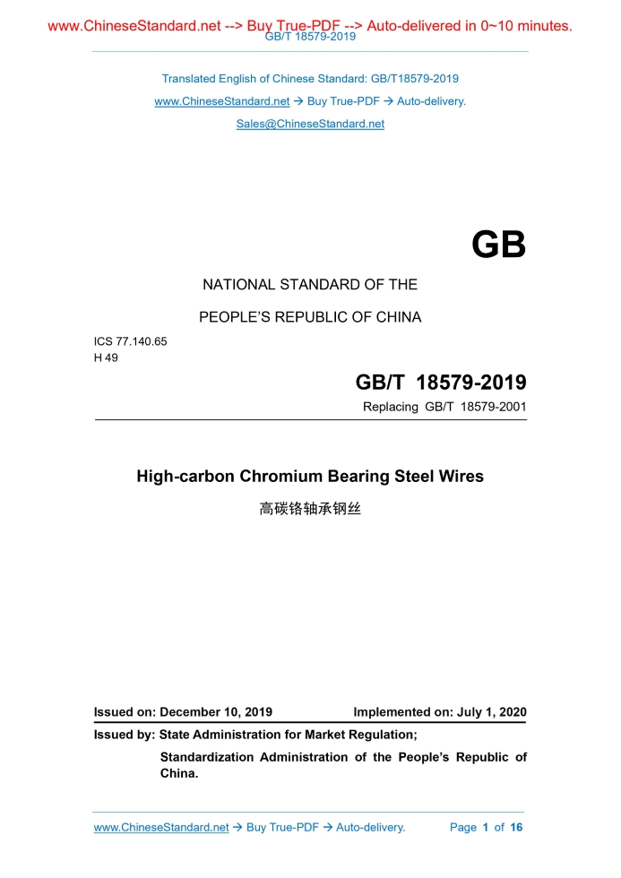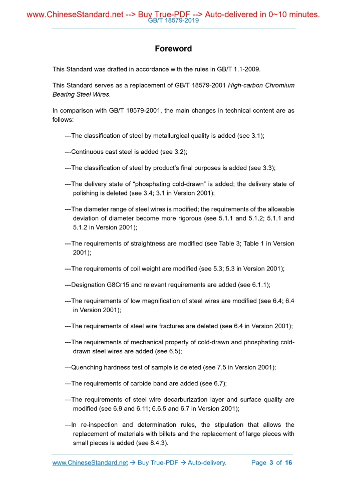Similar standardsGB/T 18579-2019: High-carbon Chromium Bearing Steel Wires---This is an excerpt. Full copy of true-PDF in English version (including equations, symbols, images, flow-chart, tables, and figures etc.), auto-downloaded/delivered in 9 seconds, can be purchased online: https://www.ChineseStandard.net/PDF.aspx/GBT18579-2019NATIONAL STANDARD OF THE PEOPLE’S REPUBLIC OF CHINA ICS 77.140.65 H 49 Replacing GB/T 18579-2001 High-carbon Chromium Bearing Steel Wires Issued on. DECEMBER 10, 2019 Implemented on. JULY 1, 2020 Issued by. State Administration for Market Regulation; Standardization Administration of the People’s Republic of China. Table of ContentsForeword... 3 1 Scope... 5 2 Normative References... 5 3 Classification and Code... 7 4 Order Content... 7 5 Dimensions, Appearances, Weights and Allowable Deviations... 8 6 Technical Requirements... 10 7 Test Methods... 13 8 Inspection Rules... 15 9 Packaging, Marking and Quality Certificate... 16ForewordThis Standard was drafted in accordance with the rules in GB/T 1.1-2009. This Standard serves as a replacement of GB/T 18579-2001 High-carbon Chromium Bearing Steel Wires. In comparison with GB/T 18579-2001, the main changes in technical content are as follows. ---The classification of steel by metallurgical quality is added (see 3.1); ---Continuous cast steel is added (see 3.2); ---The classification of steel by product’s final purposes is added (see 3.3); ---The delivery state of “phosphating cold-drawn” is added; the delivery state of polishing is deleted (see 3.4; 3.1 in Version 2001); ---The diameter range of steel wires is modified; the requirements of the allowable deviation of diameter become more rigorous (see 5.1.1 and 5.1.2; 5.1.1 and 5.1.2 in Version 2001); ---The requirements of straightness are modified (see Table 3; Table 1 in Version 2001); ---The requirements of coil weight are modified (see 5.3; 5.3 in Version 2001); ---Designation G8Cr15 and relevant requirements are added (see 6.1.1); ---The requirements of low magnification of steel wires are modified (see 6.4; 6.4 in Version 2001); ---The requirements of steel wire fractures are deleted (see 6.4 in Version 2001); ---The requirements of mechanical property of cold-drawn and phosphating cold- drawn steel wires are added (see 6.5); ---Quenching hardness test of sample is deleted (see 7.5 in Version 2001); ---The requirements of carbide band are added (see 6.7); ---The requirements of steel wire decarburization layer and surface quality are modified (see 6.9 and 6.11; 6.6.5 and 6.7 in Version 2001); ---In re-inspection and determination rules, the stipulation that allows the replacement of materials with billets and the replacement of large pieces with small pieces is added (see 8.4.3). This Standard was proposed by China Iron and Steel Industry Association. This Standard shall be under the jurisdiction of National Technical Committee 183 on Iron and Steel of Standardization Administration of China (SAC/TC 183). The drafting organizations of this Standard. DONGBEI Special Steel Group Co., Ltd.; Jiangyin XINGCHENG Special Steel Works Co., Ltd.; Luoyang Bearing Research Institute Co., Ltd.; Shandong DONGE Steel Ball Group Co., Ltd.; Wuxi KAIMING Metal Product Co., Ltd.; MCC Construction Research Institute Co., Ltd.; MCC Testing & Certification Co., Ltd.; China Metallurgical Information and Standardization Institute. The main drafters of this Standard. Kangge, Xie Yaping, Gong Chunlin, Baiyun, Lu Changhe, Lei Jianzhong, Yangyong, Zhu Meijuan, Liudong, Mengyu, Zhang Jianfeng, Wang Shanshan, Hanbing, Li Xiaobin, Wang Lingjun, Leng Mingjian, Wangyong. The issuing of the previous versions of the standard replaced by this Standard is as follows. ---GB/T 18579-2001. High-carbon Chromium Bearing Steel Wires1 ScopeThis Standard stipulates the classification and code, order content, dimensions, appearances, weights and allowable deviations, technical requirements, test methods, inspection rules, packaging, marking and quality certificate of high-carbon chromium bearing steel wires. This Standard is applicable to high-carbon chromium bearing steel wires used in the manufacturing of bearing rolling elements and rings (hereinafter referred to as steel wires).2 Normative ReferencesThe following documents are indispensable to the application of this document. In terms of references with a specified date, only versions with a specified date are applicable to this document. In terms of references without a specified date, the latest version (including all the modifications) is applicable to this document. GB/T 223.5 Steel and Iron - Determination of Acid-soluble Silicon and Total Silicon Content - Reduced Molybdosilicate Spectrophotometric Method GB/T 223.9 Iron Steel and Alloy - Determination of Aluminum Content - Chrome Azurol S Photometric Method GB/T 223.11 Iron, Steel and Alloy - Determination of Chromium Content - Visual Titration or Potentiometric Titration Method GB/T 223.23 Iron, Steel and Alloy - Determination of Nickel Content - The Dimethylglyoxime Spectrophotometric Method GB/T 223.26 Iron, Steel and Alloy - Determination of Molybdenum Content - The Thiocyanate Spectrophotometric Method GB/T 223.29 Iron, Steel and Alloy - Determination of Lead Content - Carrier Precipitation-xylenol Orange Spectrophotometric Method GB/T 223.31 Iron, Steel and Alloy - Determination of Arsenic Content - Distillation - molybdenum Blue Spectrophotometric Method GB/T 223.47 Method for Chemical Analysis of Iron, Steel and Alloy - The Carrier Precipitation - Molybdenum Blue Photometric Method for the Determination of Antimony Content3 Classification and Code3.1 By metallurgical quality, steel can be divided into. 3.2 By casting process, steel can be divided into. 3.3 By product’s final purpose, steel can be divided into. 3.4 The classification and code of steel wires by the delivery state are shown in Table 1.When other delivery states are requested, this shall be indicated in the