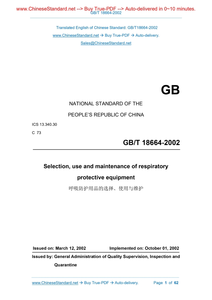 GB/T 18664-2002: Selection, use and maintenance of respiratory protective equipment Delivery: 9 seconds. True-PDF full-copy in English & invoice will be downloaded + auto-delivered via email. See step-by-step procedure Status: Valid GB/T 18664: Historical versions