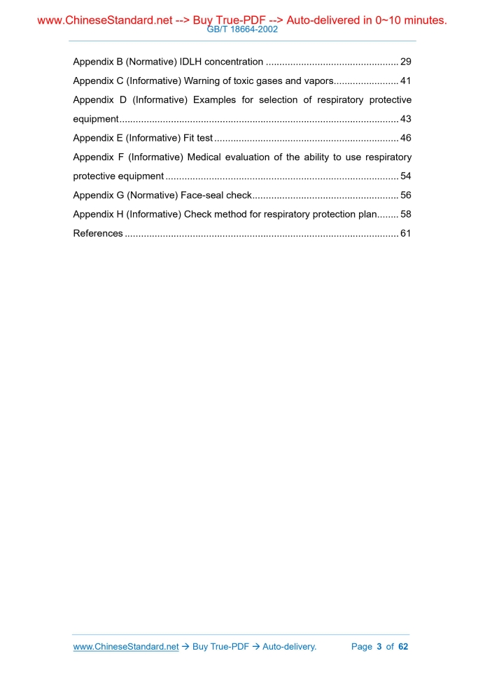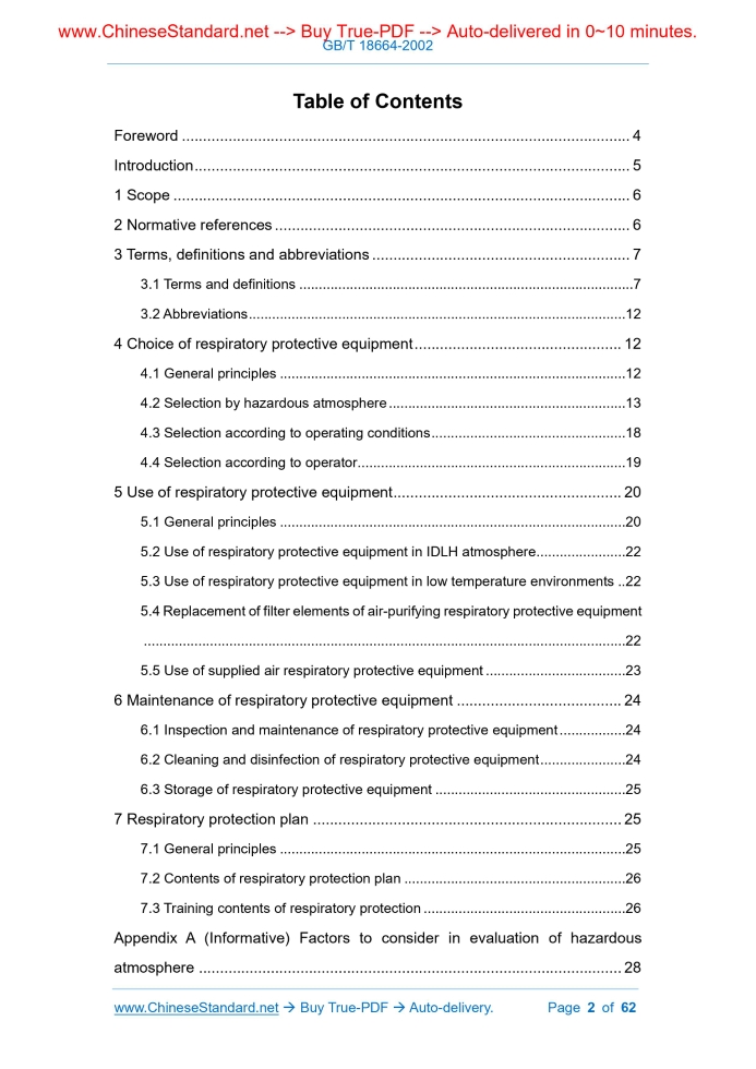 Similar standardsGB/T 18664-2002: Selection, use and maintenance of respiratory protective equipment---This is an excerpt. Full copy of true-PDF in English version (including equations, symbols, images, flow-chart, tables, and figures etc.), auto-downloaded/delivered in 9 seconds, can be purchased online: https://www.ChineseStandard.net/PDF.aspx/GBT18664-2002NATIONAL STANDARD OF THE PEOPLE’S REPUBLIC OF CHINA ICS 13.340.30 C 73 Selection, use and maintenance of respiratory protective equipment ISSUED ON: MARCH 12, 2002 IMPLEMENTED ON: OCTOBER 01, 2002 Issued by: General Administration of Quality Supervision, Inspection and Quarantine Table of ContentsForeword ... 4 Introduction ... 5 1 Scope ... 6 2 Normative references ... 6 3 Terms, definitions and abbreviations ... 7 3.1 Terms and definitions ... 7 3.2 Abbreviations ... 12 4 Choice of respiratory protective equipment ... 12 4.1 General principles ... 12 4.2 Selection by hazardous atmosphere ... 13 4.3 Selection according to operating conditions ... 18 4.4 Selection according to operator ... 19 5 Use of respiratory protective equipment ... 20 5.1 General principles ... 20 5.2 Use of respiratory protective equipment in IDLH atmosphere ... 22 5.3 Use of respiratory protective equipment in low temperature environments .. 22 5.4 Replacement of filter elements of air-purifying respiratory protective equipment ... 22 5.5 Use of supplied air respiratory protective equipment ... 23 6 Maintenance of respiratory protective equipment ... 24 6.1 Inspection and maintenance of respiratory protective equipment ... 24 6.2 Cleaning and disinfection of respiratory protective equipment ... 24 6.3 Storage of respiratory protective equipment ... 25 7 Respiratory protection plan ... 25 7.1 General principles ... 25 7.2 Contents of respiratory protection plan ... 26 7.3 Training contents of respiratory protection ... 26 Appendix A (Informative) Factors to consider in evaluation of hazardous atmosphere ... 28 Appendix B (Normative) IDLH concentration ... 29 Appendix C (Informative) Warning of toxic gases and vapors ... 41 Appendix D (Informative) Examples for selection of respiratory protective equipment ... 43 Appendix E (Informative) Fit test ... 46 Appendix F (Informative) Medical evaluation of the ability to use respiratory protective equipment ... 54 Appendix G (Normative) Face-seal check ... 56 Appendix H (Informative) Check method for respiratory protection plan ... 58 References ... 61 Selection, use and maintenance of respiratory protective equipment1 ScopeThis standard specifies the principles, methods and requirements for the selection, use and maintenance of respiratory protective equipment. This standard applies to respiratory protective equipment used to prevent harm to the human body from oxygen deficiency and airborne contaminants in the workplace. This standard does not apply to breathing equipment for underwater operations, aviation and medical rescue.2 Normative referencesThe provisions in following documents become the provisions of this Standard through reference in this Standard. For the dated references, the subsequent amendments (excluding corrections) or revisions do not apply to this Standard; however, parties who reach an agreement based on this Standard are encouraged to study if the latest versions of these documents are applicable. For undated references, the latest edition of the referenced document applies. GB/T 2891-1995 Performance test methods for facepiece of filter type respirator GB 3836.1 Electrical apparatus for explosive gas atmospheres - Part 1: General requirements GB 3836.2 Electrical apparatus for explosive gas atmospheres - Part 2: Flameproof enclosure “d” GB 3836.4 Electrical apparatus for explosive atmospheres - Intrinsically safe circuits and electrical apparatus GB 8958 Safety regulation for working under hazardous condition of the oxygen deficiency Atmosphere-supplying respiratory protective equipment Respiratory protective equipment capable of isolating the wearer's respiratory organs from the working environment, relying on the air source carried by the wearer or relying on an air pipe to introduce a clean air source other than the working environment. [GB/T 12903-1991, definition 4.1.21] 3.1.7 Supplied air respiratory protective equipment An atmosphere-supplying respiratory protective equipment that introduces in clean air via an airway tube through the breathing of the wearer or by mechanical force. [GB/T 12903-1991, definition 4.2.1.1] 3.1.8 Self-contained breathing apparatus An atmosphere-supplying respiratory protective equipment which uses the air source from the air bottle or oxygen bottle or an oxygen generator as carried by the wearer. [GB/T 12903-1991, definition 4.1.2.2] 3.1.9 Negative-pressure respiratory protective equipment A respiratory protective equipment, the pressure in the facepiece of which in a breathing cycle is less than the atmospheric pressure in the inhalation stage of the user. [GB 16556-1996, definition 3.2] 3.1.10 Positive-pressure respiratory protective equipment A respiratory protective equipment, the pressure in the facepiece of which in a breathing cycle is more than the atmospheric pressure. [GB 16556-1996, definition 3.3] 3.1.11 The tiny solid particles suspended in the air, which are generally produced by the condensation of gas or vapor, whose particle size is usually smaller than that of dust. 3.1.18 Mist Tiny droplets suspended in the air. 3.1.19 Low boiling point organic compound Organic compounds which have a boiling point below 65 °C. 3.1.20 Hazardous atmosphere Anoxic or atmospheric environment in which airborne contaminant concentrations exceed the value as specified by national occupational health standards. 3.1.21 Immediately dangerous to life and health concentration The concentration of airborne contaminants in the hazardous atmosphere reaches a certain dangerous level, which can be fatal, or can permanently damage health, or can make people immediatel