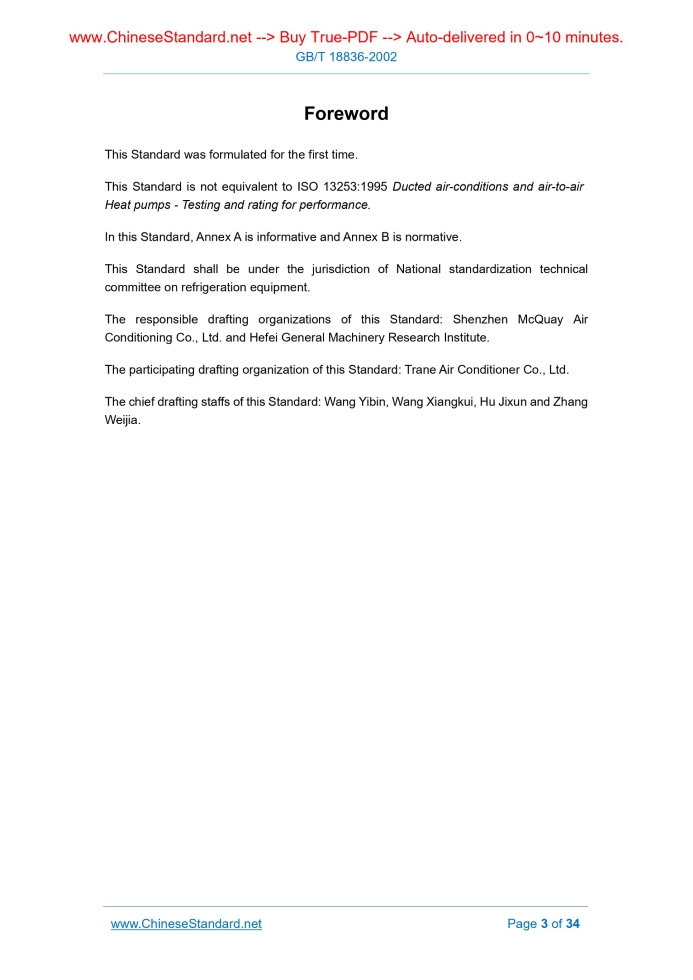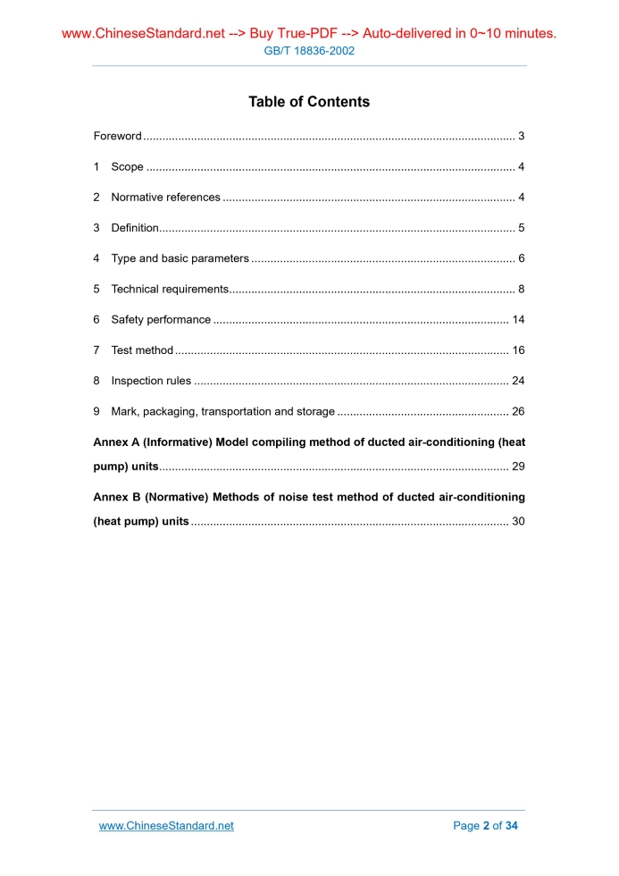 Similar standardsGB/T 18836-2002: Ducted air -- Conditioning (heat pump) units---This is an excerpt. Full copy of true-PDF in English version (including equations, symbols, images, flow-chart, tables, and figures etc.), auto-downloaded/delivered in 9 seconds, can be purchased online: https://www.ChineseStandard.net/PDF.aspx/GBT18836-2002GB NATIONAL STANDARD OF THE PEOPLE’S REPUBLIC OF CHINA ICS 27.200 J 73 Ducted air-conditioning (heat pump) units (ISO 13253.1995, Ducted air-conditions and air-to-air heat pumps – Testing and rating for performance, NEQ) Issued on: SEPTEMBER 11, 2002 Implemented on: APRIL 01, 2003 Issued by. General Administration of Quality Supervision, Inspection and Quarantine of the People's Republic of China; Standardization Administration of the People's Republic of China. Table of ContentsForeword... 3 1 Scope... 4 2 Normative references... 4 3 Definition... 5 4 Type and basic parameters... 6 5 Technical requirements... 8 6 Safety performance... 14 7 Test method... 16 8 Inspection rules... 24 9 Mark, packaging, transportation and storage... 26 Annex A (Informative) Model compiling method of ducted air-conditioning (heat pump) units... 29 Annex B (Normative) Methods of noise test method of ducted air-conditioning (heat pump) units... 30ForewordThis Standard was formulated for the first time. This Standard is not equivalent to ISO 13253.1995 Ducted air-conditions and air-to-air Heat pumps - Testing and rating for performance. In this Standard, Annex A is informative and Annex B is normative. This Standard shall be under the jurisdiction of National standardization technical committee on refrigeration equipment. The responsible drafting organizations of this Standard. Shenzhen McQuay Air Conditioning Co., Ltd. and Hefei General Machinery Research Institute. The participating drafting organization of this Standard. Trane Air Conditioner Co., Ltd. The chief drafting staffs of this Standard. Wang Yibin, Wang Xiangkui, Hu Jixun and Zhang Weijia. Ducted air-conditioning (heat pump) units1 ScopeThis Standard specifies the definition, type and basic parameters, technical requirements, test, inspection rules, mark, packaging, transportation, storage and others of ducted air- conditioning (heat pump) units. This Standard applies to ducted air-conditioning (heat pump) units.2 Normative referencesThe articles contained in the following documents have become part of this document when they are quoted herein. For the dated documents so quoted, all the subsequent modifications (including all corrections) or revisions made thereafter do not apply to this standard. However, the parties who reach an agreement according to this standard are encouraged to study whether the latest versions of these documents may be used. For the undated documents so quoted, the latest versions (including all modification sheets) apply to this document. GB/T 191-2000 Packaging - Pictorial markings for handling of goods GB/T 2423.17-1993 Basic environmental testing procedures for electric and electronic products - Test Ka. Salt mist (eqv IEC 68-2-3.1981) GB/T 2828-1987 Sampling procedures and tables for lot-by-lot inspection by attributes (apply to inspection of successive lots or batches) GB/T 3785-1983 Electric, sonic properties and measuring methods for sound level meters GB 4208-1993 Degrees of protection provided by enclosure (IP code) GB 4706.1-1998 Safety of household and similar electrical appliances - Part 1.General requirements GB 4706.32-1996 Safety of household and similar electrical appliances - Particular requirements for electrical heat pumps, air-conditioners and dehumidifiers GB/T 4798.2-1996 Environmental conditions existing in the application of electric and electronic products - Transportation GB/T 5226.1-1996 Electrical equipment of industrial machines - Part 1.general requirements GB/T 6388-1986 Transport package shipping mark GB 9237-2001 Mechanical refrigerating systems used for cooling and heating - Safety requirements GB/T 13306-1991 Plates GB/T 17758-1999 Unitary air conditioners JB/T 7249- 1994 Terminology of refrigeration equipment JB/T 9066-1999 Cabinet type fan coil unit3 DefinitionFor the purpose of this Standard, the following definitions given in JB/T 7249-1994 shall apply. 3.1 Ducted air-conditioning (heat pump) units Equipment that provides centralized processed air to confined space, room or area through ducts. It mainly includes refrigeration system, air circulation and purification device and also including heating equipment, humidification equipment and ventilation equipment. it is hereinafter referred to as air conditioner. 3.2 Auxiliary electric heater for heating Electric heater that is used for heating with heat pump (including post-installation electric heaters). 3.3 Heat water coil Equipment of which the air, guided by fan, flows through and gets heated by the coil-pipe in which the external heat-water flows through. 3.4 Heating equipment with electric beater 5.1.7 The action of magnetic exchange valves of heat pump air conditioner shall be sensitive and reliable, and be able to ensure the normal operation of air conditioners. 5.1.8 The thermal-protective coating of air conditioners shall have good heat insulation performance, and shall be non-toxic, odor-free and has self-extinguishing function. It shall have no condensation phenomena on the surface in normal operation. 5.1.9 The parts of air conditioner refrigerating system shall be able to ensure the normal operation of the whole unit without degradation under the affection of refrigerants, lubricants and their mixture. 5.1.10 The compressor of air conditioners shall be equipped with measures against vibration or be equipped with anti-vibration spring washers when being fixed. 5.1.11 Salt-frog resistance of electroplated parts After the test to electroplated parts is done according to the method in 7.3.22, each rust spot in the electroplated layer shall not exceed 1 mm2; the electroplated layer of each 1