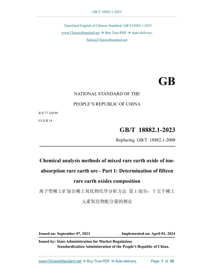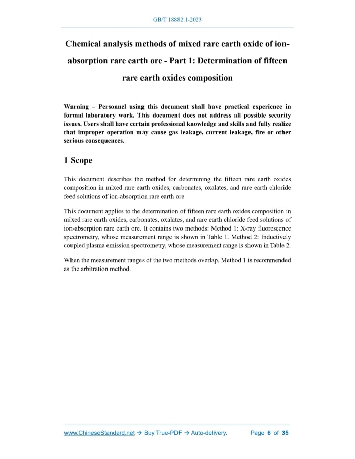Similar standardsGB/T 18882.1-2023: Chemical analysis methods of mixed rare earth oxide of ion-absorption rare earth ore - Part 1: Determination of fifteen rare earth oxides composition---This is an excerpt. Full copy of true-PDF in English version (including equations, symbols, images, flow-chart, tables, and figures etc.), auto-downloaded/delivered in 9 seconds, can be purchased online: https://www.ChineseStandard.net/PDF.aspx/GBT18882.1-2023 GB NATIONAL STANDARD OF THE PEOPLE’S REPUBLIC OF CHINA ICS 77.120.99 CCS H 14 Replacing GB/T 18882.1-2008 Chemical analysis methods of mixed rare earth oxide of ion- absorption rare earth ore - Part 1.Determination of fifteen rare earth oxides composition Issued on. SEPTEMBER 07, 2023 Implemented on. APRIL 01, 2024 Issued by. State Administration for Market Regulation; Standardization Administration of the People’s Republic of China. Table of ContentsForeword... 3 Introduction... 5 1 Scope... 6 2 Normative references... 7 3 Terms and definitions... 7 4 Method 1.X-ray fluorescence spectrometry... 7 5 Method 2.Inductively coupled plasma optical emission spectroscopy... 21 Chemical analysis methods of mixed rare earth oxide of ion- absorption rare earth ore - Part 1.Determination of fifteen rare earth oxides composition Warning – Personnel using this document shall have practical experience in formal laboratory work. This document does not address all possible security issues. Users shall have certain professional knowledge and skills and fully realize that improper operation may cause gas leakage, current leakage, fire or other serious consequences.1 ScopeThis document describes the method for determining the fifteen rare earth oxides composition in mixed rare earth oxides, carbonates, oxalates, and rare earth chloride feed solutions of ion-absorption rare earth ore. This document applies to the determination of fifteen rare earth oxides composition in mixed rare earth oxides, carbonates, oxalates, and rare earth chloride feed solutions of ion-absorption rare earth ore. It contains two methods. Method 1.X-ray fluorescence spectrometry, whose measurement range is shown in Table 1.Method 2.Inductively coupled plasma emission spectrometry, whose measurement range is shown in Table 2. When the measurement ranges of the two methods overlap, Method 1 is recommended as the arbitration method. 4.2.16 Lutetium oxide w (REO) ≥ 99.50%, w (Lu2O3/REO) > 99.99%, calcined at 950 ℃ for 1 h, cooled to room temperature. 4.2.17 Hydrochloric acid (ρ = 1.19 g/mL). 4.2.18 Nitric acid (ρ = 1.42 g/mL). 4.2.19 Hydrogen peroxide [w (H2O2) ≥ 30%]. 4.2.20 Hydrochloric acid solution (1+1). 4.2.21 Hydrochloric acid solution (1+19). 4.2.23 Standard stock solution B. Weigh 0.100 0 g of praseodymium oxide (4.2.5) in a 100 mL beaker; use a small amount of water (4.2.1) to moisten; add 10 mL of hydrochloric acid solution (4.2.20); heat and dissolve until clear; cool and transfer to a 200 mL volumetric flask; use hydrochloric acid solution (4.2.21) to dilute to the mark; mix well. This solution contains 0.5 mg of praseodymium oxide in 1 mL. 4.2.24 Standard stock solution C~O. Weigh each single rare earth oxide according to 4.5.3 Preparation of test material sample 4.5.3.1 Mixed rare earth oxide of ion-absorption rare earth ore. Place the test material (4.5.1) in a 100 mL beaker; add 5 mL of hydrochloric acid (4.2.20) [add 5 mL of nitric acid (4.2.18) for samples with high cerium content]; add 0.5 mL of hydrogen peroxide (4.2.19); heat to decompose and evaporate to near dryness. After cooling to room temperature, add 5.00 mL of scandium internal standard solution (4.2.25) or vanadium internal standard solution (4.2.26); dissolve to clear; mix well. 4.5.3.2 Mixed rare earth oxalate of ion-absorption rare earth ore. Calcine the test material (4.5.1) at 950 ℃ for 1 h; then cool it to room temperature in a desiccator. Follow the subsequent steps as in 4.5.3.1. 4.5.3.1. 4.5.3.5 Take 0.30 mL of the solution (see 4.5.3.1 ~ 4.5.3.4); drop it evenly on the filter paper (4.2.27) spread on the glass plate; leave it for 20 min; dry it under an infrared lamp before determination. 4.5.4 Preparation of series standard samples According to Table 6, respectively transfer the standard stock solution into 12 100 mL beakers; evaporate until almost dry; cool to room temperature; add 5.0 mL of scandium internal standard solution (4.2.25) or vanadium internal standard solution (4.2.26); dissolve to clear; mix well. Prepare standard samples according to the steps in 4.5.3.5. The distribution values of the series standard samples are shown in Table 7. and transfer to a 100 mL volumetric flask; use water (5.2.1) to dilute to the mark; mix well. This solution contains 1.00 mg of yttrium oxide in 1 mL. 5.2.21 Lanthanum oxide standard stock solution. Weigh 0.500 0 g of lanthanum oxide (5.2.3) into a 100 mL beaker; use water (5.2.1) to moisten; add 5 mL of hydrochloric acid (5.2.17) and 1 mL of hydrogen peroxide (5.2.19); heat and decompose until clear; cool and transfer to a 100 mL volumetric flask; use water (5.2.1) to dilute to the mark; mix well. 5.2.23 Praseodymium oxide standard stock solution. Weigh 0.500 0 g of praseodymium oxide (5.2.5) into a 100 mL beaker; use water (5.2.1) to moisten; add 5 mL of hydrochloric acid (5.2.17) and 1 mL of hydrogen peroxide (5.2.19); heat and decompose until clear; cool and transfer to a 100 mL volumetric flask; use water (5.2.1) to dilute to the mark; mix well. This solution contains 5.00 mg of praseodymium oxide in 1 mL. 5.2.27 Gadolinium oxide standard stock solution. Weigh 0.500 0 g of gadolinium oxide (5.2.9) into a 100 mL beaker; use water (5.2.1) to moisten; add 5 mL of hydrochloric acid (5.2.17) and 1 mL of hydrogen peroxide (5.2.19); heat and decompose until clear; cool and transfer to a 100 mL volumetric flask; use water (5.2.1) to dilute to the mark; mix well. This solution contains 5.00 mg of gadolinium oxide in 1 mL. 5.2.28 Terbium oxide standard