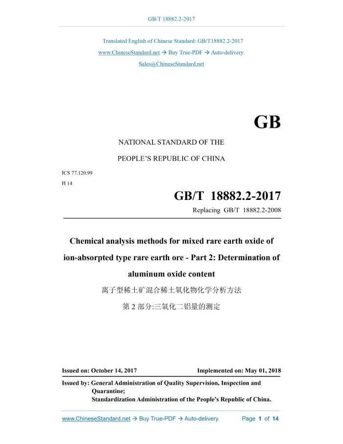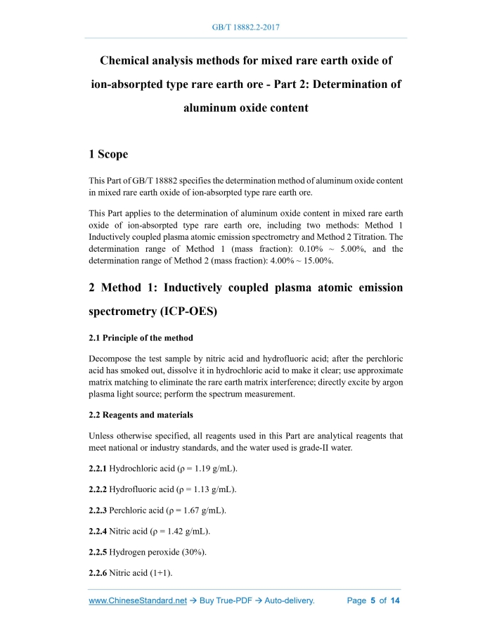 Similar standardsGB/T 18882.2-2017: Chemical analysis methods for mixed rare earth oxide of ion-absorbed type rare earth ore - Part 2: Determination of aluminum oxide content---This is an excerpt. Full copy of true-PDF in English version (including equations, symbols, images, flow-chart, tables, and figures etc.), auto-downloaded/delivered in 9 seconds, can be purchased online: https://www.ChineseStandard.net/PDF.aspx/GBT18882.2-2017 GB NATIONAL STANDARD OF THE PEOPLE’S REPUBLIC OF CHINA ICS 77.120.99 H 14 Replacing GB/T 18882.2-2008 Chemical analysis methods for mixed rare earth oxide of ion-absorpted type rare earth ore - Part 2: Determination of aluminum oxide content ISSUED ON: OCTOBER 14, 2017 IMPLEMENTED ON: MAY 01, 2018 Issued by: General Administration of Quality Supervision, Inspection and Quarantine; Standardization Administration of the People’s Republic of China. Table of ContentsForeword ... 3 1 Scope ... 5 2 Method 1: Inductively coupled plasma atomic emission spectrometry (ICP-OES) .. 5 3 Method 2: Titration ... 9 Chemical analysis methods for mixed rare earth oxide of ion-absorpted type rare earth ore - Part 2: Determination of aluminum oxide content1 ScopeThis Part of GB/T 18882 specifies the determination method of aluminum oxide content in mixed rare earth oxide of ion-absorpted type rare earth ore. This Part applies to the determination of aluminum oxide content in mixed rare earth oxide of ion-absorpted type rare earth ore, including two methods: Method 1 Inductively coupled plasma atomic emission spectrometry and Method 2 Titration. The determination range of Method 1 (mass fraction): 0.10% ~ 5.00%, and the determination range of Method 2 (mass fraction): 4.00% ~ 15.00%.2 Method 1: Inductively coupled plasma atomic emissionspectrometry (ICP-OES) 2.1 Principle of the method Decompose the test sample by nitric acid and hydrofluoric acid; after the perchloric acid has smoked out, dissolve it in hydrochloric acid to make it clear; use approximate matrix matching to eliminate the rare earth matrix interference; directly excite by argon plasma light source; perform the spectrum measurement. 2.2 Reagents and materials Unless otherwise specified, all reagents used in this Part are analytical reagents that meet national or industry standards, and the water used is grade-II water. 2.2.1 Hydrochloric acid (ρ = 1.19 g/mL). 2.2.2 Hydrofluoric acid (ρ = 1.13 g/mL). 2.2.3 Perchloric acid (ρ = 1.67 g/mL). 2.2.4 Nitric acid (ρ = 1.42 g/mL). 2.2.5 Hydrogen peroxide (30%). 2.2.6 Nitric acid (1+1). 2.3 Instruments and equipment 2.3.1 Inductively coupled plasma atomic emission spectrometer, resolution < 0.006 nm (at 200 nm). 2.3.2 Light source: argon plasma light source. 2.4 Test sample 2.4.1 The particle size of the test sample is less than 0.074 mm. 2.4.2 Pre-dry the sample at 105 ℃ ~ 110 ℃ for 2 h; then, place it in a desiccator to cool to room temperature. 2.5 Procedure 2.5.1 Test material Weigh 0.1g of test sample (2.4), accurate to 0.000 1 g. 2.5.2 Number of determinations Independently perform two determinations; take the average value. 2.5.3 Blank test Carry out a blank test together with the test material (2.5.1). 2.5.4 Preparation of analytical solution Place the test materials (2.5.1) in a 150 mL polytetrafluoroethylene beaker; add a small amount of water; add 2 mL of nitric acid (2.2.6); heat to decompose for 3 min ~ 5 min; add 2 mL of hydrofluoric acid (2.2.2) and continue to decompose for 3 min ~ 5 min; add 3 mL of perchloric acid (2.2.3) to smoke and evaporate to nearly dry; remove and cool slightly; add 10 mL of hydrochloric acid (2.2.7) and add 3 ~ 5 drops of hydrogen peroxide (2.2.5); heat to dissolve until clear; transfer the test solution into a 100 mL volumetric flask; use water to dilute to the mark; mix well; test. 2.5.5 Series standard configuration According to Table 2, transfer the standard stock solution into six 100 mL volumetric flasks; use water to dilute to the mark; mix well; test. Unless otherwise specified, all reagents used in this Part are analytical reagents that meet national or industry standards, and the water used is grade-II water. 3.2.1 Hydrochloric acid (ρ = 1.19 g/mL). 3.2.2 Hydrofluoric acid (ρ = 1.13 g/mL). 3.2.3 Hydrogen peroxide (30%). 3.2.4 Perchloric acid (ρ = 1.67 g/mL). 3.2.5 Nitric acid (ρ = 1.42 g/mL). 3.2.6 Oxalic acid solution (100 g/L). 3.2.7 Sodium hydroxide solution (200 g/L). 3.2.8 Hydrochloric acid (1+1). 3.2.9 Hydrochloric acid (1+4). 3.2.10 Ammonia water (1+1). 3.2.11 EDTA (Ethylene Diamine Tetraacetic Acid) solution (about 0.05 mol/L): Weigh 20 g of EDTA and dissolve it in a small amount of water; transfer it into a 1 000 mL volumetric flask; use water to fix the volume; mix well. 3.2.12 Cresol red indicator (2 g/L): Weigh 0.2 g of cresol red and dissolve it in 100 mL of ethanol solution (1+1). 3.2.13 Phenolphthalein ethanol solution (10 g/L). 3.2.14 Acetic acid-sodium acetate buffer solution (pH 5.5): Weigh 200 g of sodium acetate and dissolve it in a small amount of water; transfer it into a 1 000 mL volumetric flask; add 10 mL of glacial acetic acid (w ≥ 99.5%); use water to fix the volume; mix well. 3.2.15 Xylenol orange indicator (4 g/L): Weigh 0.4 g of xylenol orange and 20 g of potassium nitrate; dissolve in a small amount of water; transfer to a 100 mL volumetric flask; use water to fix the volume; mix well. Store in a brown bottle. 3.2.16 Sodium fluoride solution (40 g/L). 3.2.17 Aluminum standard solution: Weigh 1.000 0 g of metallic aluminum (spectrally pure, remove all surface oxides before use) into a 500 mL beaker; add 50 mL of water; then, add 40 mL of hydrochloric acid (3.2.1); dissolve at low temperature until clear (add hydrochloric acid and water in between); cool. Transfer to a 1 000 mL volumetric flask; use hydrochloric acid (5+95) to dilute to the mark; mix well. This standard solution contains 1 mg of aluminum in 1 mL. 3.2.18 Zinc sulfate solution (about 0.1 mol/L): Weigh 30 g of zi