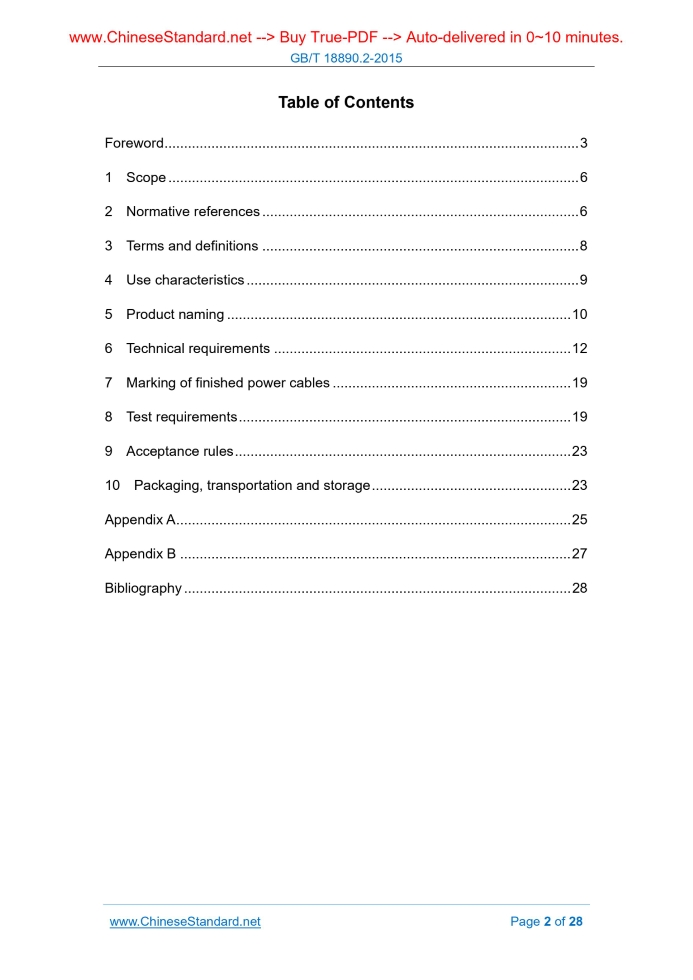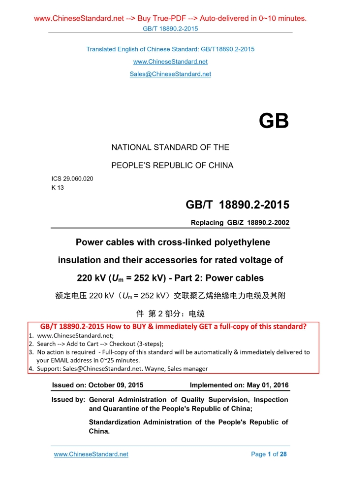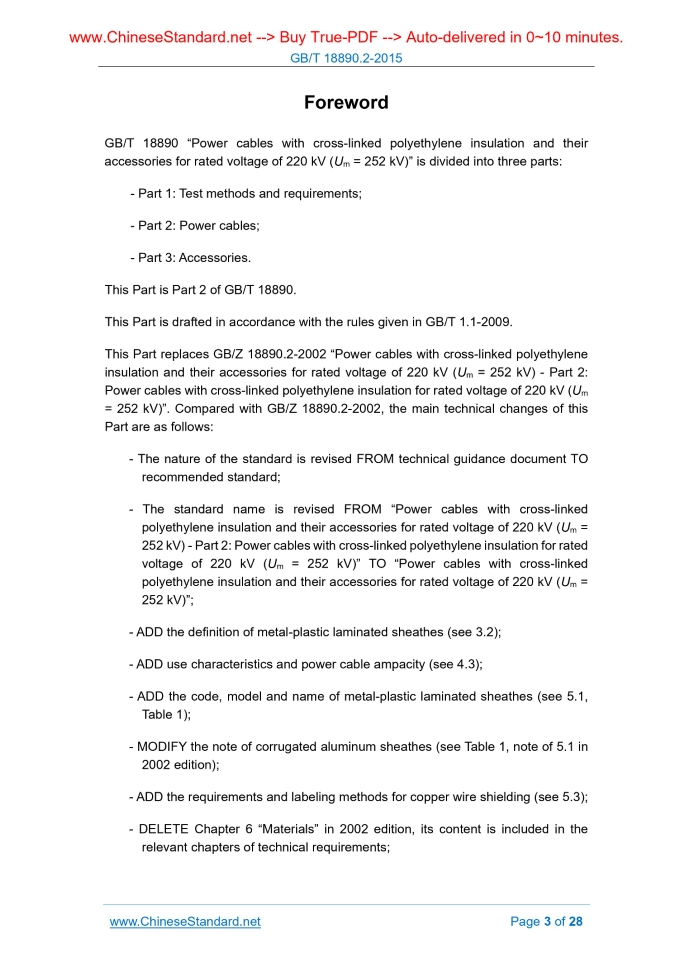 Similar standardsGB/T 18890.2-2015: Power cables with cross-linked polyethylene insulation and their accessories for rated voltage of 220 kV (Um = 252 kV) - Part 2: Power cables---This is an excerpt. Full copy of true-PDF in English version (including equations, symbols, images, flow-chart, tables, and figures etc.), auto-downloaded/delivered in 9 seconds, can be purchased online: https://www.ChineseStandard.net/PDF.aspx/GBT18890.2-2015 GB NATIONAL STANDARD OF THE PEOPLE’S REPUBLIC OF CHINA ICS 29.060.020 K 13 Replacing GB/Z 18890.2-2002 Power cables with cross-linked polyethylene insulation and their accessories for rated voltage of 220 kV (Um = 252 kV) - Part 2. Power cables Issued on: OCTOBER 09, 2015 Implemented on: MAY 01, 2016 Issued by. General Administration of Quality Supervision, Inspection and Quarantine of the People's Republic of China; Standardization Administration of the People's Republic of China. Table of ContentsForeword ... 3 1 Scope ... 6 2 Normative references ... 6 3 Terms and definitions ... 8 4 Use characteristics ... 9 5 Product naming ... 10 6 Technical requirements ... 12 7 Marking of finished power cables ... 19 8 Test requirements ... 19 9 Acceptance rules ... 23 10 Packaging, transportation and storage ... 23 Appendix A ... 25 Appendix B ... 27 Bibliography ... 28ForewordGB/T 18890 “Power cables with cross-linked polyethylene insulation and their accessories for rated voltage of 220 kV (Um = 252 kV)” is divided into three parts. - Part 1. Test methods and requirements; - Part 2. Power cables; - Part 3. Accessories. This Part is Part 2 of GB/T 18890. This Part is drafted in accordance with the rules given in GB/T 1.1-2009. This Part replaces GB/Z 18890.2-2002 “Power cables with cross-linked polyethylene insulation and their accessories for rated voltage of 220 kV (Um = 252 kV) - Part 2. Power cables with cross-linked polyethylene insulation for rated voltage of 220 kV (Um = 252 kV)”. Compared with GB/Z 18890.2-2002, the main technical changes of this Part are as follows. - The nature of the standard is revised FROM technical guidance document TO recommended standard; - The standard name is revised FROM “Power cables with cross-linked polyethylene insulation and their accessories for rated voltage of 220 kV (Um = 252 kV) - Part 2. Power cables with cross-linked polyethylene insulation for rated voltage of 220 kV (Um = 252 kV)” TO “Power cables with cross-linked polyethylene insulation and their accessories for rated voltage of 220 kV (Um = 252 kV)”; - ADD the definition of metal-plastic laminated sheathes (see 3.2); - ADD use characteristics and power cable ampacity (see 4.3); - ADD the code, model and name of metal-plastic laminated sheathes (see 5.1, Table 1); - MODIFY the note of corrugated aluminum sheathes (see Table 1, note of 5.1 in 2002 edition); - ADD the requirements and labeling methods for copper wire shielding (see 5.3); - DELETE Chapter 6 “Materials” in 2002 edition, its content is included in the relevant chapters of technical requirements; Power cables with cross-linked polyethylene insulation and their accessories for rated voltage of 220 kV (Um = 252 kV) - Part 2. Power cables1 ScopeThis Part of GB/T 18890 specifies the model, naming, technical requirements, test and inspection rules, packaging, transportation and storage of fixedly installed power cables with cross-linked polyethylene insulation for rated voltage of 220 kV (Um = 252 kV). This Part applies to single-core power cables used under normal installation and operating conditions; it is not applicable to the cables used under special conditions, such as submarine power cables.2 Normative referencesThe following documents are essential to the application of this document. For the dated documents, only the versions with the dates indicated are applicable to this document; for the undated documents, only the latest version (including all the amendments) are applicable to this document. GB/T 494-2010 Asphalt used in roofing GB/T 2951.11-2008 Common test methods for insulating and sheathing materials of electric and optical cables - Part 11. Methods for general application - Measurement of thickness and overall dimensions - Tests for determining the mechanical properties GB/T 2951.12-2008 Common test methods for insulating and sheathing materials of electric and optical cables - Part 12. Methods for general application - Thermal aging methods GB/T 2951.14-2008 Common test methods for insulating and sheathing materials of electric and optical cables - Part 14. Common test methods - Low Temperature Test GB/T 2951.21-2008 Common test methods for insulating and sheathing materials of electric and optical cables - Part 21. Methods specific to elastomeric compounds - Ozone resistance, hot set and mineral oil immersion tests GB/T 2951.31-2008 Common test methods for insulating and sheathing materials of electric and optical cables - Part 31. Methods specific to PVC compounds - Pressure test at high temperature - Test for resistance to cracking GB/T 2951.32-2008 Common test methods for insulating and sheathing materials of electric and optical cables - Part 32. Methods specific to PVC compounds - Loss of mass test - Thermal stability test GB/T 2951.41-2008 Common test methods for insulating and sheathing materials of electric and optical cables - Part 41. Methods specific to polyethylene and polypropylene compounds - Resistance to environmental stress cracking - Measurement of the melt flow index - Carbon black GB/T 3048.4-2007 Test methods for electrical properties of electric cables and wires - Part 4. Test of DC resistance of conductors GB/T 3048.8-2007 Test methods for electrical properties of electric cables and wires - Part 8. AC voltage test GB/T 3048.11-2007 Test methods for electrical properties of electric cables and wires - Part 11. Test for dielectric dissipation factor GB/T 3048.12-2007 Test methods for electrical properties of electric cables and wires - Part 