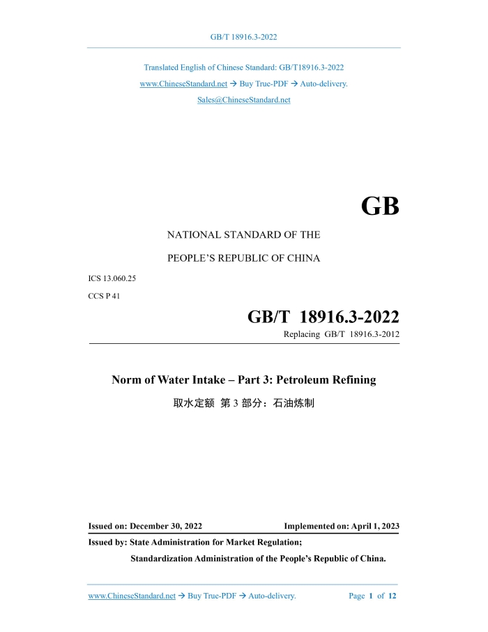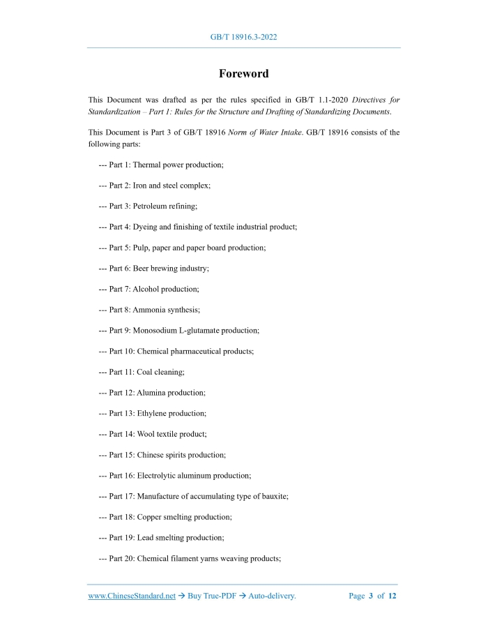 Similar standardsGB/T 18916.3-2022: Norm of water intake - Part 3: Petroleum refining---This is an excerpt. Full copy of true-PDF in English version (including equations, symbols, images, flow-chart, tables, and figures etc.), auto-downloaded/delivered in 9 seconds, can be purchased online: https://www.ChineseStandard.net/PDF.aspx/GBT18916.3-2022GB NATIONAL STANDARD OF THE PEOPLE’S REPUBLIC OF CHINA ICS 13.060.25 CCS P 41 Replacing GB/T 18916.3-2012 Norm of Water Intake – Part 3: Petroleum Refining ISSUED ON: DECEMBER 30, 2022 IMPLEMENTED ON: APRIL 1, 2023 Issued by: State Administration for Market Regulation; Standardization Administration of the People’s Republic of China. Table of ContentsForeword ... 3 Introduction ... 7 1 Scope ... 10 2 Normative References ... 10 3 Terms and Definitions ... 10 4 Calculation Method ... 11 5 Norm of Water Intake ... 12 6 Norm Management Requirements ... 12ForewordThis Document was drafted as per the rules specified in GB/T 1.1-2020 Directives for Standardization – Part 1: Rules for the Structure and Drafting of Standardizing Documents. This Document is Part 3 of GB/T 18916 Norm of Water Intake. GB/T 18916 consists of the following parts: --- Part 1: Thermal power production; --- Part 2: Iron and steel complex; --- Part 3: Petroleum refining; --- Part 4: Dyeing and finishing of textile industrial product; --- Part 5: Pulp, paper and paper board production; --- Part 6: Beer brewing industry; --- Part 7: Alcohol production; --- Part 8: Ammonia synthesis; --- Part 9: Monosodium L-glutamate production; --- Part 10: Chemical pharmaceutical products; --- Part 11: Coal cleaning; --- Part 12: Alumina production; --- Part 13: Ethylene production; --- Part 14: Wool textile product; --- Part 15: Chinese spirits production; --- Part 16: Electrolytic aluminum production; --- Part 17: Manufacture of accumulating type of bauxite; --- Part 18: Copper smelting production; --- Part 19: Lead smelting production; --- Part 20: Chemical filament yarns weaving products;IntroductionThe verification of quantity of water intake is the basis for the implementation of the water intake permit system, planned water use management and water resource demonstration. The standard for norm of water intake is an important basis for verifying the quantity of water intake, one of the main indicators for the state to assess the water resource utilization efficiency of industries and enterprises and evaluate the water conservation level of enterprises, and an important means to implement the most stringent water resource management system. GB/T 18916 will clarify the range for quantity of water intake, supply range for quantity of water intake and water intake measurement according to the water use characteristics of different industrial industries; stipulate the calculation method of norm of water intake, divide the norm index level, and make requirements for norm management. GB/T 18916 is proposed to be consisted of the following parts: --- Part 1: Thermal power production; --- Part 2: Iron and steel complex; --- Part 3: Petroleum refining; --- Part 4: Dyeing and finishing of textile industrial product; --- Part 5: Pulp, paper and paper board production; --- Part 6: Beer brewing industry; --- Part 7: Alcohol production; --- Part 8: Ammonia synthesis; --- Part 9: Monosodium L-glutamate production; --- Part 10: Chemical pharmaceutical products; --- Part 11: Coal cleaning; --- Part 12: Alumina production; --- Part 13: Ethylene production; --- Part 14: Wool textile product; --- Part 15: Chinese spirits production; --- Part 16: Electrolytic aluminum production; Norm of Water Intake – Part 3: Petroleum Refining1 ScopeThis Document specifies the calculation method for norm of water intake, norm of water intake and norm management requirements for oil refining. This Document applies to the management of quantity of water intake for existing, newly built and expanded oil refining enterprises.2 Normative ReferencesThe provisions in following documents become the essential provisions of this Document through reference in this Document. For the dated documents, only the versions with the dates indicated are applicable to this Document; for the undated documents, only the latest version (including all the amendments) is applicable to this Document. GB/T 12452 General principles of water balance test GB/T 18820 General principles of drafting norm of water intake for industry GB/T 21534 Water saving – Terminology GB/T 24789 General rules for equipping and managing of the water measuring instrument in water-use organization3 Terms and DefinitionsFor the purposes of this Document, the terms and definitions given in GB/T 18820 and GB/T 21534 and the following apply. 3.1 Petroleum refining The whole process of using petroleum as raw material to process and produce fuel oil, lubricating oil and other products. 3.2 Quantity of water intake for per ton crude oil The quantity of water intake per ton crude oil during the production process of an oil refining enterprise within a certain measuring time. ......Source: Above contents are excerpted from the full-copy PDF -- translated/reviewed by: www.ChineseStandard.net / Wayne Zheng et al. Tips & Frequently Asked Questions:Question 1: How long will the true-PDF of English version of GB/T 18916.3-2022 be delivered?Answer: The full copy PDF of English version of GB/T 18916.3-2022 can be downloaded in 9 seconds, and it will also be emailed to you in 9 seconds (double mechanisms to ensure the delivery reliably), with PDF-invoice.Question 2: Can I share the purchased PDF of GB/T 18916.3-2022_English with my colleagues?Answer: Yes. The purchased PDF of GB/T 18916.3-2022_English will be deemed to be sold to your employer/organization who actually paid for it, including your colleagues and your employer's intranet.Question 3: Does the price include tax/VAT?Answer: Yes. Our tax invoice, downloaded/delivered in 9 seconds, includes all tax/VAT and complies with 10