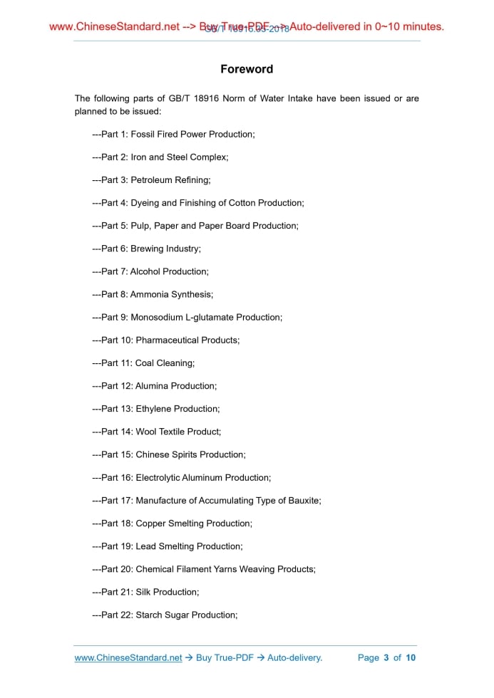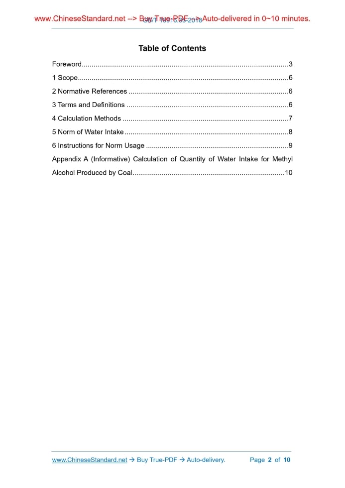 Similar standardsGB/T 18916.35-2018: Norm of Water Intake - Part 35: Methyl Alcohol Produced by Coal---This is an excerpt. Full copy of true-PDF in English version (including equations, symbols, images, flow-chart, tables, and figures etc.), auto-downloaded/delivered in 9 seconds, can be purchased online: https://www.ChineseStandard.net/PDF.aspx/GBT18916.35-2018GB NATIONAL STANDARD OF THE PEOPLE’S REPUBLIC OF CHINA ICS 13.060.25 P 41 Norm of Water Intake - Part 35. Methyl Alcohol Produced by Coal Issued on: MAY 14, 2018 Implemented on: DECEMBER 1, 2018 Issued by. State Administration for Market Regulation; Standardization Administration of the People’s Republic of China. Table of ContentsForeword ... 3 1 Scope ... 6 2 Normative References ... 6 3 Terms and Definitions ... 6 4 Calculation Methods ... 7 5 Norm of Water Intake ... 8 6 Instructions for Norm Usage ... 9 Appendix A (Informative) Calculation of Quantity of Water Intake for Methyl Alcohol Produced by Coal ... 10ForewordThe following parts of GB/T 18916 Norm of Water Intake have been issued or are planned to be issued. ---Part 1. Fossil Fired Power Production; ---Part 2. Iron and Steel Complex; ---Part 3. Petroleum Refining; ---Part 4. Dyeing and Finishing of Cotton Production; ---Part 5. Pulp, Paper and Paper Board Production; ---Part 6. Brewing Industry; ---Part 7. Alcohol Production; ---Part 8. Ammonia Synthesis; ---Part 9. Monosodium L-glutamate Production; ---Part 10. Pharmaceutical Products; ---Part 11. Coal Cleaning; ---Part 12. Alumina Production; ---Part 13. Ethylene Production; ---Part 14. Wool Textile Product; ---Part 15. Chinese Spirits Production; ---Part 16. Electrolytic Aluminum Production; ---Part 17. Manufacture of Accumulating Type of Bauxite; ---Part 18. Copper Smelting Production; ---Part 19. Lead Smelting Production; ---Part 20. Chemical Filament Yarns Weaving Products; ---Part 21. Silk Production; ---Part 22. Starch Sugar Production; ---Part 23. Citrate Acid Production; ---Part 24. Long Vegetable Fiber Production; ---Part 25. Chinese Spirits Production; ---Part 26. Soda Ash; ---Part 27. Urea; ---Part 28. Sulphuric Acid for Industrial Use; ---Part 29. Caustic Soda; ---Part 30. Coking; ---Part 31. Sintering and Pelletizing for Iron and Steel Industry; ---Part 32. Iron Ore Mineral Processing; ---Part 33. Indirect Coal Liquefaction; ---Part 34. Direct Coal Liquefaction; ---Part 35. Methyl Alcohol Produced by Coal; ---Part 36. Ethylene Glycol Produced with Coal as Raw Material; ---Part 37. Phosphoric Acid by Wet Process; ---Part 38. Polyvinyl Chloride; ---Part 39. Natural Gas Produced by Coal. This is Part 35 of GB/T 18916. This Part is drafted in accordance with stipulations in GB/T 1.1-2009. This Part was proposed by The Ministry of Water Resources of the People’s Republic of China, National Development and Reform Commission. This Part shall be under the jurisdiction of National Technical Committee (442) on Water Conservation of Standardization Administration of China (SAC/TC 442). The drafting organizations of this Part. China Petroleum and Chemical Industry Federation, China Nitrogen Fertilizer Industry Association, Shandong Hualu- Hengsheng Chemical Co., Ltd., China National Institute of Standardization, YANKUANG Group Guohong Chemical Co., Ltd. The main drafters of this Part. Cao Zhangao, Wang Liqing, Xu Lihe, Li Dongsheng, Hu Mengting, Wanghui, Chen Chengmin, Sun Shaohua, Zhangjie, Wang Yujie, Wang Wenfu, Zhou Junhua, Li Yongliang, Wang Zhenping, Chen Yongxian, Wangwei. Norm of Water Intake - Part 35. Methyl Alcohol Produced by Coal1 ScopeThis Part of GB/T 18916 specifies the terms and definitions, calculation methods and norm of water intake of methyl alcohol produced by coal. This Part is applicable to the management of water intake of the existing, newly constructed, reorganized and expanded enterprises in the production of methyl alcohol produced by coal (including synthetic ammonia combined methanol whose capacity exceeds 10% of total ammonia).2 Normative ReferencesThe following documents are indispensable to the application of this Standard. In terms of references with a specified date, only versions with a specified date are applicable to this Standard. The latest version (including all the modifications) of references without a specified date is also applicable to this Standard. GB/T 12452 The General Principles of Water Balance Test in Enterprises GB/T 18820 General Principles of Stipulation of Water Intake Norm for Industrial Product GB/T 21534 Industrial Water Usage and Conservation - Terminology GB 24789 General Provisions on Equipping and Managing of the Measuring Instrument of Water in Organization of Water Using3 Terms and DefinitionsWhat is defined in GB/T 18820 and GB/T 21534, and the following terms and definitions are applicable to this document. 3.1 Methyl Alcohol Produced by Coal Methyl alcohol produced by coal refers to the production process of air separation oxygen production, coal-to-gas, gas purification, methanol synthesis and methanol refining, in which, coal, water and air are the main raw materials. 3.2 Methyl Alcohol Product Produced by Coal Methyl alcohol product produced by coal refers to products that are obtained through the production process of air separation oxygen production, coal-to-gas, gas purification, methanol synthesis and methanol refining, in which, coal, water and air are the main raw materials. 3.3 Quantity of Water Intake for Per Ton Methyl Alcohol Produced by Coal Quantity of water intake for per ton methyl alcohol produced by coal refers to the quantity of water that enterprises need to extract from various water resources for the production of per ton methyl alcohol product produced by coal.4 Calculation Methods4.1 General Stipulations 4.1.1 Scope of water intake Range of water intake refers to the quantity of water that enterprises extract from various conventional water resources, including water extracted from surface water (calculated by water 