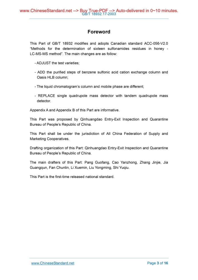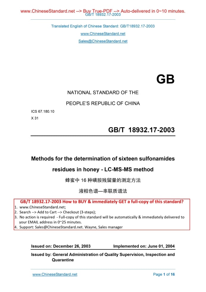 GB/T 18932.17-2003: Method for the determination of sixteen sulfonamides residues in honey -- LC-MS-MS method Delivery: 9 seconds. True-PDF full-copy in English & invoice will be downloaded + auto-delivered via email. See step-by-step procedure Status: Valid
