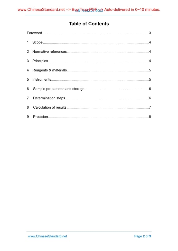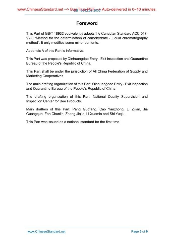 Similar standardsGB/T 18932.22-2003: Method for the determination of fructose, glucose, sucrose, maltose contents in honey -- Liquid chromatography refractive index detection method---This is an excerpt. Full copy of true-PDF in English version (including equations, symbols, images, flow-chart, tables, and figures etc.), auto-downloaded/delivered in 9 seconds, can be purchased online: https://www.ChineseStandard.net/PDF.aspx/GBT18932.22-2003 GB ICS 67.180.10 X 31 NATIONAL STANDARD OF THE PEOPLE’S REPUBLIC OF CHINA Method for the determination of fructose, glucose, sucrose, maltose contents in honey - Liquid chromatography refractive index detection method Issued on: DECEMBER 26, 2003 Implemented on: JUNE 1, 2004 Issued by. General Administration of Quality Supervision, Inspection and Quarantine of the People’s Republic of China Table of ContentsForeword ... 3 1 Scope ... 4 2 Normative references ... 4 3 Principles ... 4 4 Reagents & materials ... 5 5 Instruments ... 5 6 Sample preparation and storage ... 6 7 Determination steps ... 6 8 Calculation of results ... 7 9 Precision ... 8ForewordThis Part of GB/T 18932 equivalently adopts the Canadian Standard ACC-017- V2.0 “Method for the determination of carbohydrate - Liquid chromatography method”. It only modifies some minor contents. Appendix A of this Part is informative. This Part was proposed by Qinhuangdao Entry - Exit Inspection and Quarantine Bureau of the People's Republic of China. This Part shall be under the jurisdiction of All China Federation of Supply and Marketing Cooperatives. The main drafting organization of this Part. Qinhuangdao Entry - Exit Inspection and Quarantine Bureau of the People's Republic of China. The drafting organization of this Part. National Quality Supervision and Inspection Center for Bee Products. Main drafters of this Part. Pang Guofang, Cao Yanzhong, Li Zijian, Jia Guangqun, Fan Chunlin, Zhang Jinjie, Li Xuemin and Shi Yuqiu. This Part was issued as a national standard for the first time. Method for the determination of fructose, glucose, sucrose, maltose contents in honey - Liquid chromatography refractive index detection method1 ScopeThis Part of GB/T 18932 specifies the method for the determination of fructose, glucose, sucrose, maltose contents in honey. This Part is applicable to the determination of fructose, glucose, sucrose, maltose contents in honey. The method detection limit of this Part. fructose, glucose, and sucrose are 0.5%; maltose is 0.2%.2 Normative referencesThe following standards contain the provisions which, through reference in this Part of the GB/T18932, constitute the provisions of this Part. For the dated references, all subsequent amendments (excluding corrections) or revisions do not apply to this Part. However, the parties who enter into agreement based on this Part are encouraged to investigate whether the latest versions of these standards are applicable. For undated reference documents, the latest versions apply to this Part. GB/T 6379 Precision of test methods - Determination of repeatability and reproducibility for a standard test method by inter-laboratory tests (GB/T 6379-1986, neq ISO 5725.1981) GB/T 6682 Water for analytical laboratory use - Specification and test methods (GB/T 6682-1992, neq ISO 3696.1987)3 PrinciplesUse water to dissolve the sample. After acetonitrile volume is constant, filter it with 0.45 μm filterable membrane. Use the liquid chromatography refractive index detector to determine. And adopt the external standard method to quantify. 5.2 Analytical balance. two balances of which one’s sensitivity is 0.1 mg, and the other’s sensitivity is 0.01 g. 5.3 Injector. 10 mL. 5.4 Organic phase filtration membrane. 0.45 μm. 5.5 Sample flask. 1.5 mL. 5.6 Volumetric flasks. 10mL, 25 mL, 50 mL, 100 mL. 6 Sample preparation and storage 6.1 Sample preparation For non-crystalized laboratory sample, stir it evenly. For crystalized sample, in a closed circumstance, place the crystalized sample in the water bath at no more than 60°C; warm it; oscillate it till it is totally melted; stir it and cool it to room temperature. Take 0.5 kg as the sample. Place the prepared sample in the sample flask, seal and mark it. 6.2 Sample storage Store the sample at room temperature. 7 Determination steps 7.1 Extraction Weigh 5 g of sample, accurate to 0.001 g. Place it into a 50 mL beaker; add 30 mL of water. Use a glass rod to stir and make the sample completely dissolved. Transfer it to a 100 mL flask. Use 10 mL of water to wash the beaker for three times. Then transfer it to the aforementioned 100 mL flask. Use acetonitrile to make the constant volume; mix it evenly. Use 0.45 μm filter membrane to filter the sample solution into the sample flask for liquid chromatography. 7.2 Determination 7.2.1 Liquid chromatography conditions a) Chromatographic column. carbohydrate analysis column 10μm, 300mm×3.9 mm (i.d); b) Mobile phase. acetonitrile + water (77+23); c) Flow rate. 1.0 mL/min; Where, X - component content in the determined sample, in grams per 100 grams (g/100 g); c - solution concentration of determined components, obtained from the standard work curve, in grams per 100 milliliters (g/100 mL); V - constant volume of sample solution, in milliliters (mL); m - mass of weighed sample, in grams (g). Note. The blank value shall be deducted from the result. 9 Precision The precision data in this Part is determined in accordance with the provisions of GB/T 6379. The repeatability and reproducibility values are calculated in 95% confidence. 9.1 Repeatability Under conditions of repeatability, the absolute difference between two independent test results obtained shall not exceed the repeatability limit (r). The content range of fructose, glucose, sucrose and maltose in honey and repeatability equation are shown in Table 2. Table 2 The Content Range, Repeatability Equation and Reproducibility Equation Name Content Range (g/100g) Repeatability Limit (r) Reproducibili
