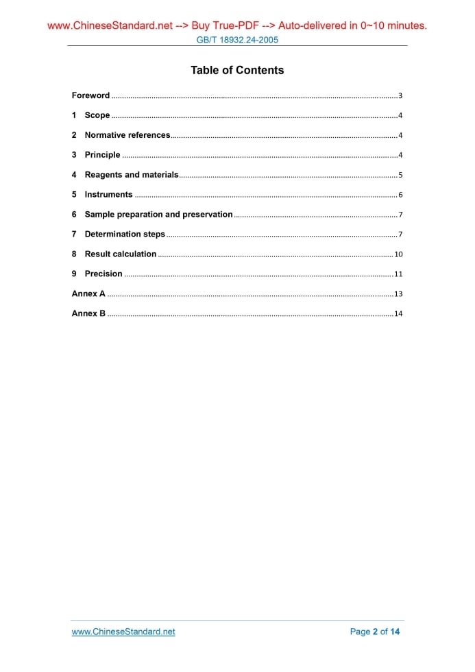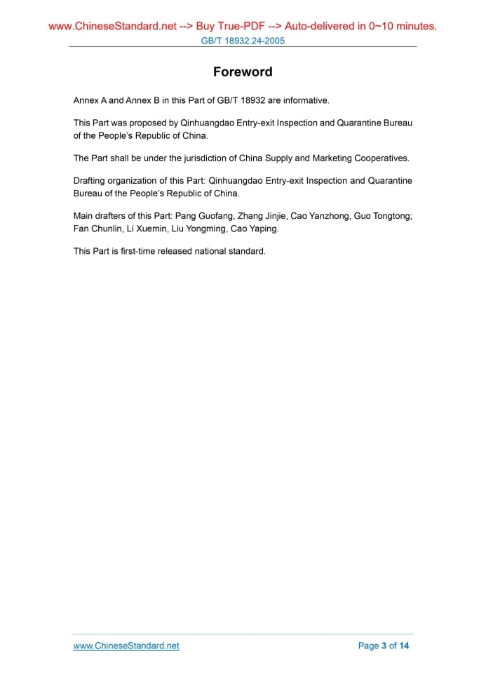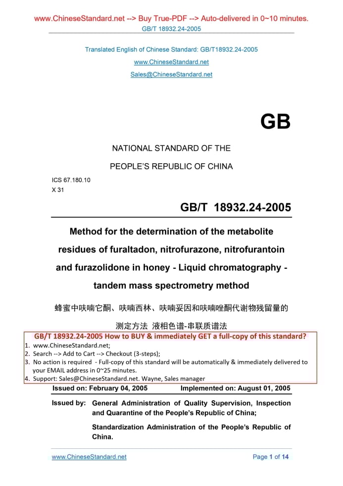 Similar standardsGB/T 18932.24-2005: Method for the determination of the metabolite residues of furaltadon, nitrofurazone, nitrofurantoin and furazolidone in honey - Liquid chromatography-tandem mass spectrometry method---This is an excerpt. Full copy of true-PDF in English version (including equations, symbols, images, flow-chart, tables, and figures etc.), auto-downloaded/delivered in 9 seconds, can be purchased online: https://www.ChineseStandard.net/PDF.aspx/GBT18932.24-2005 GB NATIONAL STANDARD OF THE PEOPLE’S REPUBLIC OF CHINA ICS 67.180.10 X 31 Method for the determination of the metabolite residues of furaltadon, nitrofurazone, nitrofurantoin and furazolidone in honey - Liquid chromatography - tandem mass spectrometry method Issued on: FEBRUARY 04, 2005 Implemented on: AUGUST 01, 2005 Issued by. General Administration of Quality Supervision, Inspection and Quarantine of the People’s Republic of China; Standardization Administration of the People’s Republic of China. Table of ContentsForeword... 3 1 Scope... 4 2 Normative references... 4 3 Principle... 4 4 Reagents and materials... 5 5 Instruments... 6 6 Sample preparation and preservation... 7 7 Determination steps... 7 8 Result calculation... 10 9 Precision... 11 Annex A... 13 Annex B... 14ForewordAnnex A and Annex B in this Part of GB/T 18932 are informative. This Part was proposed by Qinhuangdao Entry-exit Inspection and Quarantine Bureau of the People’s Republic of China. The Part shall be under the jurisdiction of China Supply and Marketing Cooperatives. Drafting organization of this Part. Qinhuangdao Entry-exit Inspection and Quarantine Bureau of the People’s Republic of China. Main drafters of this Part. Pang Guofang, Zhang Jinjie, Cao Yanzhong, Guo Tongtong; Fan Chunlin, Li Xuemin, Liu Yongming, Cao Yaping. This Part is first-time released national standard. Method for the determination of the metabolite residues of furaltadon, nitrofurazone, nitrofurantoin and furazolidone in honey - Liquid chromatography - tandem mass spectrometry method1 ScopeThis Part of GB/T 18932 specifies the liquid chromatography - tandem mass spectrometry determination method for the metabolite residues of 5-methylmorpholine- 3-amino-2-yl alkyl ketones in furaltadon, semicarbazide in nitrofurazone, 1-amino-2- hydantoin in nitrofurantoin and 3-amino-2-yl alkyl ketones in furazolidone in honey. This Part applies to the determination of the residues of 5-methylmorpholine-3-amino- 2-yl alkyl ketones, semicarbazide, 1-amino-2-hydantoin and 3-amino-2-yl alkyl ketones in honey. The detection limit of the method in this Part. 0.2μg/kg for 5-methylmorpholine-3- amino-2-yl alkyl ketones and 3-amino-2-yl alkyl ketones; 0.5μg/kg for semicarbazide and 1-amino-2-hydantoin.2 Normative referencesThe provisions in following documents become the provisions of this Part through reference in this Part of GB/T 18932.For dated references, the subsequent amendments (excluding corrections) or revisions do not apply to this Part, however, parties who reach an agreement based on this Part are encouraged to study if the latest versions of these documents are applicable. For undated references, the latest edition of the referenced document applies. GB/T 6379 Precision of test methods - Determination of repeatability and reproducibility for a standard test method by interlaboratory tests (GB/T 6379-1986, neq ISO 5725.1981) GB/T 6682 Water for analytical laboratory use - Specification and test methods (GB/T 6682-1992, neq ISO 3696.1987)3 Principlecolumn moist. 4.16 0.45μm filter membrane. 4.17 5-methylmorpholine-3-amino-2-yl alkyl ketones, semicarbazide, 1-amino-2- hydantoin and 3-amino-2-yl alkyl ketones reference material. Purity ≥99%. 4.18 5-methylmorpholin-3-amino-2-yl alkyl ketone, semicarbazide, 1-amino-2- hydantoin and 3-amino-2-yl alkyl ketones standard stock solution. 1.0mg/mL. WEIGH appropriate amount of the reference material of four kinds of nitrofuran metabolites (4.17); USE methanol to prepare 1.0mg/mL standard stock solution. The stock solution shall be stored in a freezer of -18°C, away from lights; the storage period is three months. 4.19 5-methylmorpholin-3-amino-2-yl alkyl ketone, semicarbazide, 1-amino-2- hydantoin and 3-amino-2-yl alkyl ketone mixed standard working solution. 1.0μg/mL. PIPETTE appropriate amount of the standard stock solution of four kinds of nitrofuran metabolites (4.18); USE methanol to prepare 1.0μg/mL mixed standard working solution. The standard working solution shall be stored in a freezer of -18°C, away from lights; the storage period is three months; RESUME to room temperature before use. 4.20 5-methylmorpholin-3-amino-2-yl alkyl ketone, semicarbazide, 1-amino-2- hydantoin and 3-amino-2-yl alkyl ketone mixed matrix standard calibration solution. WEIGH 7 honey blank samples (the sample weight is 4g) in 50mL brown centrifuge tubes; ADD appropriate amount of the mixed standard working solution of four kinds of nitrofuran metabolites (4.19) in 6 blank samples respectively; OPERATE synchronously in accordance with the sample operation procedures. So that the concentration of 5-methylmorpholin-3-amino-2-yl alkyl ketone and 3-amino-2-yl alkyl ketones are respectively 0ng/mL, 0.5ng/mL, 1.0ng/mL, 2.0ng/mL, 5.0ng/mL, 10.0ng/mL and 20.0ng/mL; the concentration of semicarbazide and 1-amino-2- hydantoin are respectively 0ng/mL, 1.0ng/mL, 2.0ng/mL, 5.0ng/mL, 10.0ng/mL, 20.0ng/mL and 50.0ng/mL in the final sample solutions; take them as matrix standard calibration solution. This matrix standard calibration solution is prepared when it is to be used.5 Instruments5.1 Liquid chromatography - tandem quadrupole mass spectrometer, equipped with electrospray ion source. 5.2 Analytical balances. 2 balances with sensitivity of 0.1mg and 0.01g respectively. 5.3 Liquid mixer. 5.4 Solid phase extraction device. to wash solid phase extraction column; DISCARD all of the effluent. USE a vacuum pump (5.7) to drain the Oasis HLB solid phase ex