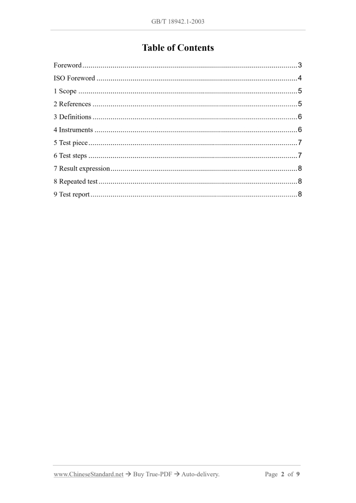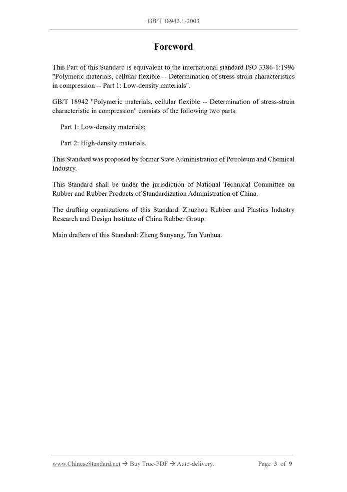 Similar standardsGB/T 18942.1-2003: Polymeric materials, cellular flexible -- Determination of stress-strain characteristic in compression -- Part 1: Low-density materials---This is an excerpt. Full copy of true-PDF in English version (including equations, symbols, images, flow-chart, tables, and figures etc.), auto-downloaded/delivered in 9 seconds, can be purchased online: https://www.ChineseStandard.net/PDF.aspx/GBT18942.1-2003 GB NATIONAL STANDARD OF THE PEOPLE’S REPUBLIC OF CHINA ICS 83.100 G 44 idt ISO 3386-1.1986 Polymeric materials, cellular flexible -- Determination of stress-strain characteristic in compression -- Part 1.Low- density materials 材料 Issued on: JANUARY 10, 2003 Implemented on: JULY 01, 2003 Issued by. General Administration of Quality Supervision, Inspection and Quarantine of the People's Republic of China. Table of ContentsForeword... 3 ISO Foreword... 4 1 Scope... 5 2 References... 5 3 Definitions... 6 4 Instruments... 6 5 Test piece... 7 6 Test steps... 7 7 Result expression... 8 8 Repeated test... 8 9 Test report... 8ForewordThis Part of this Standard is equivalent to the international standard ISO 3386-1.1996 "Polymeric materials, cellular flexible -- Determination of stress-strain characteristics in compression -- Part 1.Low-density materials". GB/T 18942 "Polymeric materials, cellular flexible -- Determination of stress-strain characteristic in compression" consists of the following two parts. Part 1.Low-density materials; Part 2.High-density materials. This Standard was proposed by former State Administration of Petroleum and Chemical Industry. This Standard shall be under the jurisdiction of National Technical Committee on Rubber and Rubber Products of Standardization Administration of China. The drafting organizations of this Standard. Zhuzhou Rubber and Plastics Industry Research and Design Institute of China Rubber Group. Main drafters of this Standard. Zheng Sanyang, Tan Yunhua. Polymeric materials, cellular flexible -- Determination of stress-strain characteristic in compression -- Part 1.Low- density materials WARNING. Personnel using this standard should be familiar with formal laboratory operating procedures. This standard does not purport to address all safety issues that may arise from its use. It is the user's responsibility to establish appropriate safety and health systems and ensure compliance with national regulations.1 ScopeThis Part of the standard specifies the method for determining the compressive stress- strain characteristics of low-density porous elastic materials with a mass fraction of less than 250 kg/m3.It also describes the method for calculating the compressive stress value of such materials. Although such materials may not necessarily have the ability to withstand long-term loads, the compressive stress-strain characteristics can be used as a measure of the material's load-bearing performance. The compressive stress-strain characteristics are different from the indentation hardness characteristics (measured according to GB/T 12825), which are affected by the thickness and tensile properties of the tested porous elastic material, the shape of the compression plate, and the shape and size of the test piece. Part 2 of this Standard specifies the method for determining compressive stress and strain in high-density materials and differs from Part 1 in the following respects. - Primarily relevant for materials with densities above 250 kg/m³. - Compressive stress values have been eliminated. - Cylindrical test pieces are not permitted.2 ReferencesThe provisions contained in the following standards constitute the provisions of this Standard through reference in this Standard. The versions shown are valid at the time of publication of this standard. All standards are subject to revision, and parties using this standard should investigate the possibility of using the latest versions of the following standards. GB/T 6342, Cellular plastics and rubbers. Determination of linear dimensions GB/T 12825, Polymeric materials, cellular flexible -- Determination of hardness by indentation technique3 DefinitionsThis Standard uses the following definitions. 3.1 Compressive stress-strain characteristics (C). The stress required to compress to a specified deformation at a constant deformation rate during the fourth loading period of a specified test, expressed as a function of the compression deformation. The unit of stress is kPa. 3.2 Compressive stress value (CV40). Compressive stress-strain characteristics when compressed to 40%.4 Instruments4.1 Testing machine The testing machine should be capable of compressing the test piece between the support surface (see 4.2) and the compression plate (see 4.3). The relative speed of the testing machine in the vertical direction should always be maintained at (100±20) mm/min. The testing machine should be capable of measuring the force required to produce the specified compression deformation to an accuracy of ±2%, and the ability to measure the thickness of the test piece under load to an accuracy of ±0.2 mm. The testing machine should be equipped with a device for automatically recording stress and strain values. 4.2 Supporting surface Unless otherwise specified, the test piece should be placed on a smooth, flat, horizontal, and rigid support surface. The support surface should be larger than the test piece. The surface should have vent holes with a diameter of 6 mm and a spacing of approximately 20 mm to allow air to escape from under the test piece.5 Test piece5.1 Shape and size The test piece should be a parallelepiped or cylinder. The selected test piece thickness should be 50 mm±1 mm and should never be less than 10 mm. Test pieces less than 10 mm thick should be overlapped to achieve the specified range, but the thickness of each layer must be at least 10 micropore diameters. The area of the test piece shall not be less than 2500 m2 and the test piece and the compression plate shall not ov