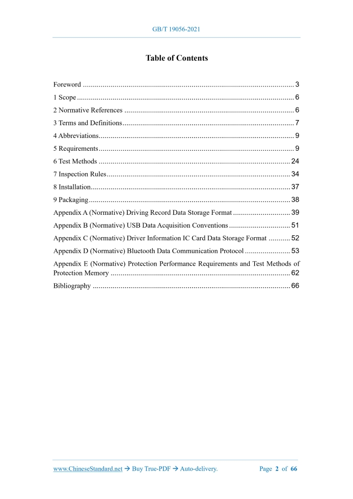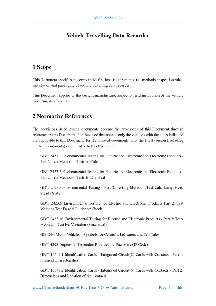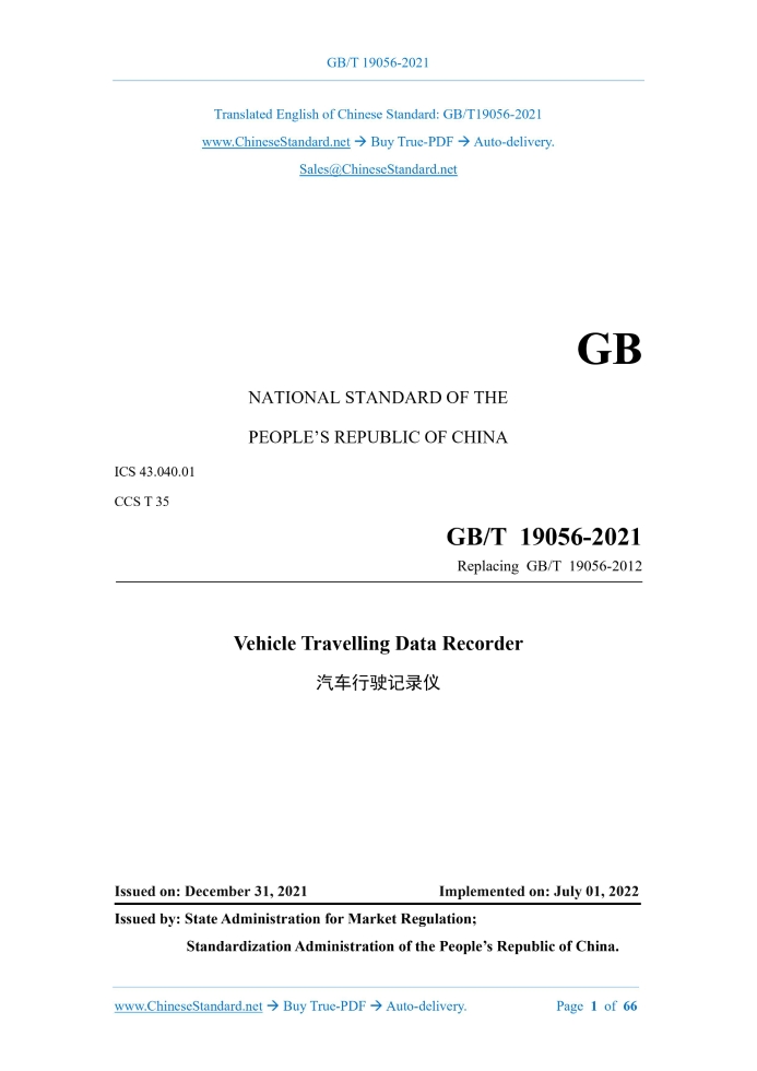 Similar standardsGB/T 19056-2021: Vehicle travelling data recorder---This is an excerpt. Full copy of true-PDF in English version (including equations, symbols, images, flow-chart, tables, and figures etc.), auto-downloaded/delivered in 9 seconds, can be purchased online: https://www.ChineseStandard.net/PDF.aspx/GBT19056-2021NATIONAL STANDARD OF THE PEOPLE’S REPUBLIC OF CHINA ICS 43.040.01 CCS T 35 Replacing GB/T 19056-2012 Vehicle Travelling Data Recorder Issued on. DECEMBER 31, 2021 Implemented on. JULY 01, 2022 Issued by. State Administration for Market Regulation; Standardization Administration of the People’s Republic of China. Table of ContentsForeword... 3 1 Scope... 6 2 Normative References... 6 3 Terms and Definitions... 7 4 Abbreviations... 9 5 Requirements... 9 6 Test Methods... 24 7 Inspection Rules... 34 8 Installation... 37 9 Packaging... 38 Appendix A (Normative) Driving Record Data Storage Format... 39 Appendix B (Normative) USB Data Acquisition Conventions... 51 Appendix C (Normative) Driver Information IC Card Data Storage Format... 52 Appendix D (Normative) Bluetooth Data Communication Protocol... 53 Appendix E (Normative) Protection Performance Requirements and Test Methods of Protection Memory... 62 Bibliography... 661 ScopeThis Document specifies the terms and definitions, requirements, test methods, inspection rules, installation and packaging of vehicle travelling data recorder. This Document applies to the design, manufacture, inspection and installation of the vehicle travelling data recorder.2 Normative ReferencesThe provisions in following documents become the provisions of this Document through reference in this Document. For the dated documents, only the versions with the dates indicated are applicable to this Document; for the undated documents, only the latest version (including all the amendments) is applicable to this Document. GB/T 2423.1 Environmental Testing for Electric and Electronic and Electronic Products - Part 2.Test Methods - Tests A. Cold GB/T 2423.2 Environmental Testing for Electric and Electronic and Electronic Products - Part 2.Test Methods - Tests B. Dry Heat GB/T 2423.3 Environmental Testing - Part 2.Testing Method - Test Cab. Damp Heat, Steady State GB/T 2423.5 Environmental Testing for Electric and Electronic Products Part 2.Test Methods Test Ea and Guidance. Shock GB/T 2423.10 Environmental Testing for Electric and Electronic Products - Part 2.Tests Methods - Test Fc. Vibration (Sinusoidal) GB 4094 Motor Vehicles - Symbols for Controls, Indicators and Tell-Tales GB/T 4208 Degrees of Protection Provided by Enclosure (IP Code) GB/T 16649.1 Identification Cards - Integrated Circuit(S) Cards with Contacts - Part 1. Physical Characteristics GB/T 16649.2 Identification Cards - Integrated Circuit(S) Cards with Contacts - Part 2. Dimensions and Location of the Contacts3 Terms and DefinitionsFor the purposes of this Document, the following terms and definitions apply. 3.1 Vehicle travelling data recorder A digital electronic recording device that records and stores data such as vehicle speed, time, location, and audio and video data, and can output data through data communication. 3.2 Impulse ratio The number of pulse signals generated by the vehicle speed sensor when the vehicle travels a distance of 1km. 3.3 Start time of travelling The time before 10s when the vehicle changes from the parking state to the running state (the speed is greater than 0 km/h and lasts for more than 10s). 3.4 End time of travelling The time before 10s when the vehicle changes from the running state to the parking state (the speed is equal to 0 km/h and lasts for more than 10s). 3.5 Continuous driving time The driving time of the same driver between two adjacent parking rest periods of no less than 20 min 3.6 Start time of continuous driving The first start time of travelling after the parking rest period of no less than 20 minutes.4 AbbreviationsThe following abbreviations are applicable to this Document. AAC. Advanced Audio Coding; ABS. Antilock Brake System; AVI. Audio Video Interleave; CAN. Controller Area Network; FTP. File Transfer Protocol; IC. Integrated Circuit; MP4.MPEG-4 Part 4; MFT. Modulation Transfer Function; QTFF. QucikTime File Format; SPP. Serial Port Profile; SSP. Secure Simple Paring; USB. Universal Serial Bus; VIN. Vehicle Identification Number;5 Requirements5.1 General requirements 5.1.1 Composition The vehicle travelling recorder (hereinafter referred to as "recorder") is mainly composed of the following parts. 5.1.2 Appearance structure The recorder host shall adopt an integrated standard single-spindle structure; and each component module shall be located in the host body. The size of the front panel of the host shall meet the requirements of (188mm±2mm) × (60mm±2mm); and the opening size of the recorder host using the embedded installation method of the vehicle instrument panel shall be no larger than 182+0.8 0 mm × 53+0.5 0 mm. 5.1.3 Text, graphics, signs The text, graphics and signs used by the recorder shall meet the following requirements. 5.1.4 Nameplate The recorder shall have a nameplate, which shall meet the following requirements. 5.2 Electrical components 5.2.1 Power supply The power supply of the recorder shall be the vehicle power supply. 5.2.2 Connectors and signals 5.2.3 Connection wires The connection wire of the recorder shall use a flame-retardant low-voltage wire with a temperature characteristic grade of no lower than -40℃~105℃. 5.2.4 Fuses If the recorder uses a fuse, the rated current value of the fuse shall be clearly marked on the outer surface of the fuse. The installation and replacement of fuses shall be convenient. 5.3 Electrical performance 5.3.1 Adaptability of power supply voltage Carry out the voltage adaptability test within the fluctuation range of power supply voltage specified in Table 2.After the test, the data recording, display, data communication and other functions of the recorder shall b
