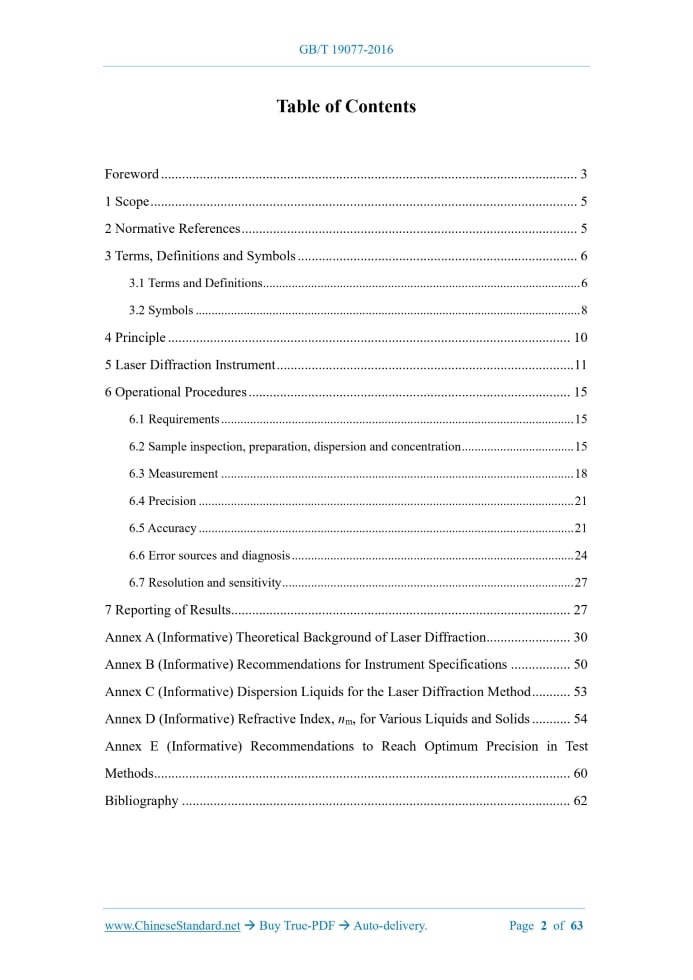 Similar standardsGB/T 19077-2016: Particle size analysis -- Laser diffraction methods---This is an excerpt. Full copy of true-PDF in English version (including equations, symbols, images, flow-chart, tables, and figures etc.), auto-downloaded/delivered in 9 seconds, can be purchased online: https://www.ChineseStandard.net/PDF.aspx/GBT19077-2016NATIONAL STANDARD OF THE PEOPLE’S REPUBLIC OF CHINA ICS 19.120 A 28 GB/T 19077-2016 / ISO 13320.2009 Replacing GB/T 19077.1-2008 Particles Size Analysis – Laser Diffraction Methods (ISO 13320.2009, IDT) Issued on: FEBRUARY 24, 2016 Implemented on: JUNE 01, 2016 Issued by. General Administration of Quality Supervision, Inspection and Quarantine; Standardization Administration of the People’s Republic of China. Table of ContentsForeword... 3 1 Scope... 5 2 Normative References... 5 3 Terms, Definitions and Symbols... 6 3.1 Terms and Definitions... 6 3.2 Symbols... 8 4 Principle... 10 5 Laser Diffraction Instrument... 11 6 Operational Procedures... 15 6.1 Requirements... 15 6.2 Sample inspection, preparation, dispersion and concentration... 15 6.3 Measurement... 18 6.4 Precision... 21 6.5 Accuracy... 21 6.6 Error sources and diagnosis... 24 6.7 Resolution and sensitivity... 27 7 Reporting of Results... 27 Annex A (Informative) Theoretical Background of Laser Diffraction... 30 Annex B (Informative) Recommendations for Instrument Specifications... 50 Annex C (Informative) Dispersion Liquids for the Laser Diffraction Method... 53 Annex D (Informative) Refractive Index, nm, for Various Liquids and Solids... 54 Annex E (Informative) Recommendations to Reach Optimum Precision in Test Methods... 60 Bibliography... 62ForewordThis Standard was drafted as per the rules specified in GB/T 1.1-2009. This Standard replaced GB/T 19077.1-2008 Particle Size Analysis - Laser Diffraction Methods - Part 1.General Principles. Compared with GB/T 19077.1-2008, the major changes of this Standard are as follows. --- Corresponding to ISO 13320, combine the contents of Part 1 and Part 2 under this Standard; --- Add and modify some terms and symbols; --- Add some test methods and procedures for accurate measurement; --- Add part of the theoretical background of laser diffraction in Annex A; --- Add Annex E; --- Modify the partial refractive index of solid particles in Annex D. This Standard uses translation method to equivalently adopt ISO 13320.2009 Particle Size Analysis – Laser Diffraction Methods. The Chinese documents that have a consistent correspondence with the international documents normatively cited in this Standard are as follows. --- GB/T 15445.1-2008 Representation of Results of Particle Size Analysis - Part 1. Graphical Representation (ISO 9276-1.1998, IDT); --- GB/T 15445.2-2006 Representation of Results of Particle Size Analysis - Part 2. Calculation of Average Particle Size/Diameters and Moments from Particle Size Distributions (ISO 9276-2.2001, IDT); --- GB/T 15445.4-2006 Representation of Results of Particle Size Analysis - Part 4. Characterization of a Classification Process (ISO 9276-4.2001, IDT); --- GB/T 20099-2006 Sample Preparation - Dispersing Procedures for Powders in Liquids (ISO 14887.2000, IDT). This Standard was proposed by and under the jurisdiction of National Technical Committee for Standardization of Particle Characterization, Sorting and Screening (SAC/TC 168). Drafting organizations of this Standard. Shanghai Institute of Measurement and Testing Technology; University of Shanghai for Science and Technology; China Productivity Center for Machinery; Dandong Bettersize Instruments Ltd.; Zhuhai OMEC Instruments Co., Ltd.; and Particles Size Analysis – Laser Diffraction Methods1 ScopeThis Standard provides guidance on instrument qualification and size distribution measurement of particles in many two-phase systems (e.g., powders, sprays, aerosols, suspensions, emulsions and gas bubbles in liquids) through the analysis of their light-scattering properties. It does not address the specific requirements of particle size measurement of specific materials. This Standard is applicable to particle sizes ranging from approximately 0.1μm to 3 mm. With special instrumentation and conditions, the applicable size range can be extended above 3 mm and below 0.1μm. For non-spherical particles, a size distribution is reported, where the predicted scattering pattern for the volumetric sum of spherical particles matches the measured scattering pattern. This is because the technique assumes a spherical particle shape in its optical model. The resulting particle size distribution is different from that obtained by methods based on other physical principles (e.g., sedimentation, sieving).2 Normative ReferencesThe following documents are essential to the application of this document. For the dated documents, only the versions with the dates indicated are applicable to this document; for the undated documents, only the latest version (including all the amendments) is applicable to this document. ISO 9276-1 Representation of Results of Particle Size Analysis – Part 1.Graphical Representation ISO 9276-2 Representation of Results of Particle Size Analysis – Part 2.Calculation of Average Particle Size/Diameters and Moments from Particle Size Distributions ISO 9276-4 Representation of Results of Particle Size Analysis – Part 4.Characterization of A Classification Process ISO 14887 Sample Preparation – Dispersing Procedures for Powders in Liquids ISO 14488 Particulate Materials – Sampling and Sample Splitting for the Determination of Particulate Properties ......Source: Above contents are excerpted from the full-copy PDF -- translated/reviewed by: www.ChineseStandard.net / Wayne Zheng et al. |