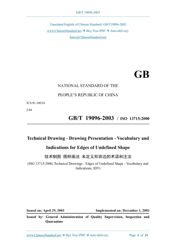 GB/T 19096-2003: Technical drawing -- Drawing presentation -- Vocabulary and indications for edges of undefined shape Delivery: 9 seconds. True-PDF full-copy in English & invoice will be downloaded + auto-delivered via email. See step-by-step procedure Status: Valid