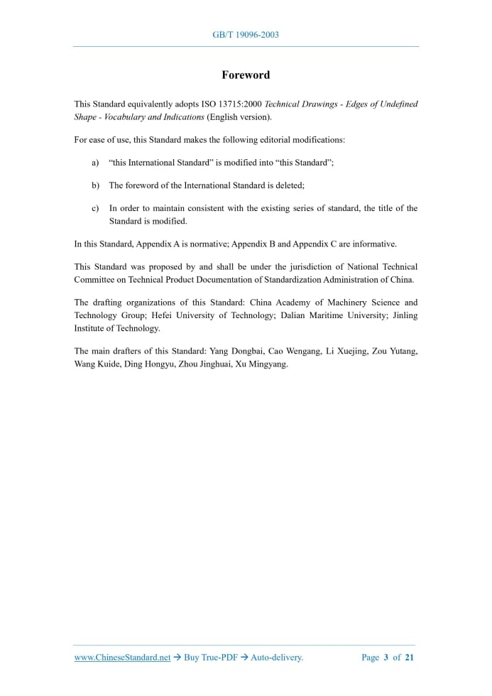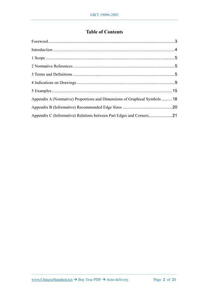 Similar standardsGB/T 19096-2003: Technical drawing -- Drawing presentation -- Vocabulary and indications for edges of undefined shape---This is an excerpt. Full copy of true-PDF in English version (including equations, symbols, images, flow-chart, tables, and figures etc.), auto-downloaded/delivered in 9 seconds, can be purchased online: https://www.ChineseStandard.net/PDF.aspx/GBT19096-2003 GB NATIONAL STANDARD OF THE PEOPLE’S REPUBLIC OF CHINA ICS 01.100.01 J 04 GB/T 19096-2003 / ISO 13715:2000 Technical Drawing - Drawing Presentation - Vocabulary and Indications for Edges of Undefined Shape (ISO 13715:2000, Technical Drawings - Edges of Undefined Shape - Vocabulary and Indications, IDT) ISSUED ON: APRIL 29, 2003 IMPLEMENTED ON: DECEMBER 1, 2003 Issued by: General Administration of Quality Supervision, Inspection and Quarantine Table of ContentsForeword ... 3 Introduction ... 4 1 Scope ... 5 2 Normative References ... 5 3 Terms and Definitions ... 5 4 Indications on Drawings ... 9 5 Examples ... 15 Appendix A (Normative) Proportions and Dimensions of Graphical Symbols ... 18 Appendix B (Informative) Recommended Edge Sizes ... 20 Appendix C (Informative) Relations between Part Edges and Corners ... 21ForewordThis Standard equivalently adopts ISO 13715:2000 Technical Drawings - Edges of Undefined Shape - Vocabulary and Indications (English version). For ease of use, this Standard makes the following editorial modifications: a) “this International Standard” is modified into “this Standard”; b) The foreword of the International Standard is deleted; c) In order to maintain consistent with the existing series of standard, the title of the Standard is modified. In this Standard, Appendix A is normative; Appendix B and Appendix C are informative. This Standard was proposed by and shall be under the jurisdiction of National Technical Committee on Technical Product Documentation of Standardization Administration of China. The drafting organizations of this Standard: China Academy of Machinery Science and Technology Group; Hefei University of Technology; Dalian Maritime University; Jinling Institute of Technology. The main drafters of this Standard: Yang Dongbai, Cao Wengang, Li Xuejing, Zou Yutang, Wang Kuide, Ding Hongyu, Zhou Jinghuai, Xu Mingyang. Technical Drawing - Drawing Presentation - Vocabulary and Indications for Edges of Undefined Shape1 ScopeThis Standard defines the terms defining the states of edges and specifies rules for representing states of edges of undefined shape in technical drawings. The proportions and dimensions of the graphical symbols to be used are also specified. In cases where the geometrically defined shape of an edge (1 x 45°, for example) is required, the general dimensioning principles given in GB/T 4458.4 and GB/T 16675.2 apply.2 Normative ReferencesThe following normative documents contain provisions which, through reference in this text, constitute provisions of this Standard. For dated references, subsequent amendments to or revisions of, any of these publications do not apply. However, parties to agreements based on this Standard are encouraged to investigate the possibility of applying the most recent editions of the normative documents indicated below. For undated references, the latest edition of the normative document referred to applies. GB/T 4458.4 Mechanical Drawings; Dimensioning GB/T 4458.5 Mechanical Drawings - Indication of Tolerances for Size and of Fits GB/T 14691 (eqv ISO 3098-1) Technical Drawings - Lettering GB/T 16675.2 Technical Drawings - Simplified Representation - Part 2: Dimensioning GB/T 17450 (idt ISO 128-20) Technical Drawings - Basic Conventions for Lines GB/T 4457.2 (ISO 128-22, IDT) Technical Drawing - Drawing Presentation - General Principles of Leader Lines and Reference Lines3 Terms and DefinitionsFor the purposes of this Standard, the following terms and definitions apply. 3.1 Edge intersection of two surfaces ......Source: Above contents are excerpted from the full-copy PDF -- translated/reviewed by: www.ChineseStandard.net / Wayne Zheng et al. Tips & Frequently Asked Questions:Question 1: How long will the true-PDF of English version of GB/T 19096-2003 be delivered?Answer: The full copy PDF of English version of GB/T 19096-2003 can be downloaded in 9 seconds, and it will also be emailed to you in 9 seconds (double mechanisms to ensure the delivery reliably), with PDF-invoice.Question 2: Can I share the purchased PDF of GB/T 19096-2003_English with my colleagues?Answer: Yes. The purchased PDF of GB/T 19096-2003_English will be deemed to be sold to your employer/organization who actually paid for it, including your colleagues and your employer's intranet.Question 3: Does the price include tax/VAT?Answer: Yes. Our tax invoice, downloaded/delivered in 9 seconds, includes all tax/VAT and complies with 100+ countries' tax regulations (tax exempted in 100+ countries) -- See Avoidance of Double Taxation Agreements (DTAs): List of DTAs signed between Singapore and 100+ countriesQuestion 4: Do you accept my currency other than USD?Answer: Yes. www.ChineseStandard.us -- GB/T 19096-2003 -- Click this link and select your country/currency to pay, the exact amount in your currency will be printed on the invoice. Full PDF will also be downloaded/emailed in 9 seconds.How to buy and download a true PDF of English version of GB/T 19096-2003?A step-by-step guide to download PDF of GB/T 19096-2003_EnglishStep 1: Visit website https://www.ChineseStandard.net (Pay in USD), or https://www.ChineseStandard.us (Pay in any currencies such as Euro, KRW, JPY, AUD).Step 2: Search keyword "GB/T 19096-2003". Step 3: Click "Add to Cart". If multiple PDFs are required, repeat steps 2 and 3 to add up to 12 PDFs to cart. Step 4: Select payment option (Via payment agents Stripe or PayPal). Step 5: Customize Tax Invoice -- Fill up your email etc. Step 6: Click "Checkout". Step 7: Make payment by credit card, PayPal, Google Pay etc. After the payment