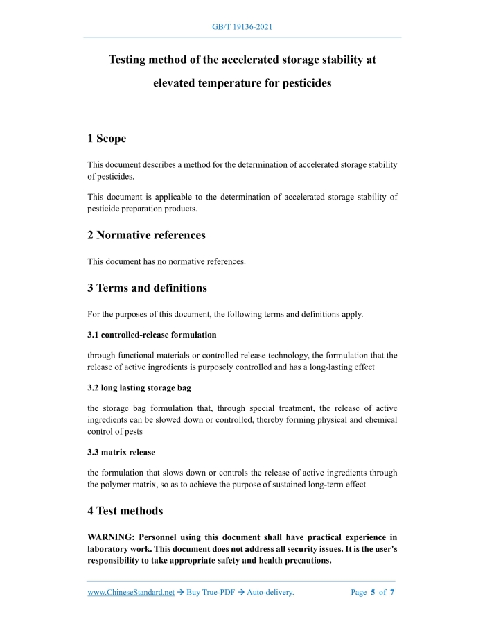 Similar standardsGB/T 19136-2021: Testing method of the accelerated storage stability at elevated temperature for pesticides---This is an excerpt. Full copy of true-PDF in English version (including equations, symbols, images, flow-chart, tables, and figures etc.), auto-downloaded/delivered in 9 seconds, can be purchased online: https://www.ChineseStandard.net/PDF.aspx/GBT19136-2021 GB NATIONAL STANDARD OF THE PEOPLE’S REPUBLIC OF CHINA ICS 65.100 CCS G 23 Replacing GB/T 19136-2003 Testing method of the accelerated storage stability at elevated temperature for pesticides ISSUED ON: DECEMBER 31, 2021 IMPLEMENTED ON: JULY 01, 2022 Issued by: State Administration for Market Regulation; Standardization Administration of the People's Republic of China. Table of ContentsForeword ... 3 1 Scope ... 5 2 Normative references ... 5 3 Terms and definitions ... 5 4 Test methods ... 5 Testing method of the accelerated storage stability at elevated temperature for pesticides1 ScopeThis document describes a method for the determination of accelerated storage stability of pesticides. This document is applicable to the determination of accelerated storage stability of pesticide preparation products.2 Normative referencesThis document has no normative references.3 Terms and definitionsFor the purposes of this document, the following terms and definitions apply. 3.1 controlled-release formulation through functional materials or controlled release technology, the formulation that the release of active ingredients is purposely controlled and has a long-lasting effect 3.2 long lasting storage bag the storage bag formulation that, through special treatment, the release of active ingredients can be slowed down or controlled, thereby forming physical and chemical control of pests 3.3 matrix release the formulation that slows down or controls the release of active ingredients through the polymer matrix, so as to achieve the purpose of sustained long-term effect4 Test methodsWARNING: Personnel using this document shall have practical experience in laboratory work. This document does not address all security issues. It is the user's responsibility to take appropriate safety and health precautions. 4.1 General Accelerated storage stability test conditions are generally 14 days at 54℃ ± 2℃. The test conditions may be changed when the preparation is neither suitable nor intended for use in hot climates, and when high temperatures have a negative effect on the preparation. Alternative conditions are: 50°C±2°C, 4 weeks; 45°C±2°C, 6 weeks; 40°C±2°C, 8 weeks; 35°C±2°C, 12 weeks; 30°C±2°C, 18 weeks. The sample size of accelerated storage test shall be determined according to the specified items after accelerated storage. Sampling shall be carried out according to the characteristics of different dosage forms. 4.2 Method summary After storing the specimen at 54°C±2°C for 14 days, measure the specified items. 4.3 Instruments 4.3.1 Thermostat: 54°C±2°C, an explosion-proof thermostat shall be used for the aerosol. 4.3.2 Storage containers shall meet the following conditions: a) Liquid preparations, powder preparations, granular preparations, long-term mosquito nets and long-term storage bags shall be in screw-top glass bottles with polytetrafluoroethylene seals or original packaging; b) Aerosols, anti-mosquito nets, dispersing wicks and electric heating mosquito- repellent coils are in original packaging; c) The matrix releases are packaged in aluminum foil paper or in the original commodity packaging; d) For other formulations, a storage container or original product packaging that has no effect on the specimen and can be sealed shall be selected. 4.4 Test steps 4.4.1 Liquid, powder and granule formulations Place the specimen in a glass bottle and seal it. Store in an incubator at 54°C±2°C for 14 d. Take out. Put in a desiccator. Cool to room temperature. Complete the determination of the specified items such as the mass fraction of active ingredients within 24 h. The accelerated storage test can also be carried out directly using the original package of the commodity. 4.4.2 Aerosol ......Source: Above contents are excerpted from the full-copy PDF -- translated/reviewed by: www.ChineseStandard.net / Wayne Zheng et al. Tips & Frequently Asked Questions:Question 1: How long will the true-PDF of English version of GB/T 19136-2021 be delivered?Answer: The full copy PDF of English version of GB/T 19136-2021 can be downloaded in 9 seconds, and it will also be emailed to you in 9 seconds (double mechanisms to ensure the delivery reliably), with PDF-invoice.Question 2: Can I share the purchased PDF of GB/T 19136-2021_English with my colleagues?Answer: Yes. The purchased PDF of GB/T 19136-2021_English will be deemed to be sold to your employer/organization who actually paid for it, including your colleagues and your employer's intranet.Question 3: Does the price include tax/VAT?Answer: Yes. Our tax invoice, downloaded/delivered in 9 seconds, includes all tax/VAT and complies with 100+ countries' tax regulations (tax exempted in 100+ countries) -- See Avoidance of Double Taxation Agreements (DTAs): List of DTAs signed between Singapore and 100+ countriesQuestion 4: Do you accept my currency other than USD?Answer: Yes. www.ChineseStandard.us -- GB/T 19136-2021 -- Click this link and select your country/currency to pay, the exact amount in your currency will be printed on the invoice. Full PDF will also be downloaded/emailed in 9 seconds.Question 5: Should I purchase the latest version GB/T 19136-2021?Answer: Yes. Unless special scenarios such as technical constraints or academic study, you should always prioritize to purchase the latest version GB/T 19136-2021 even if the enforcement date is in future. Complying with the latest version means that, by default, it also complies with all the earlier versions, technically.How to buy and download a true PDF of English version of GB/T 19136-2021?A step-by-step gu