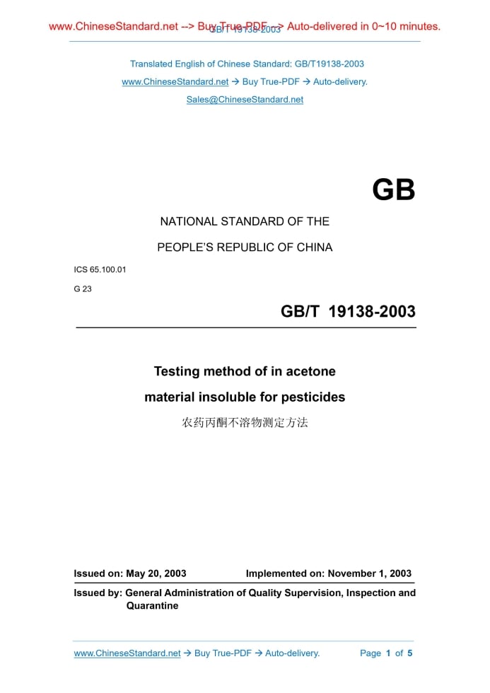 GB/T 19138-2003: Testing method of material insoluble in acetone for pesticides Delivery: 9 seconds. True-PDF full-copy in English & invoice will be downloaded + auto-delivered via email. See step-by-step procedure Status: Valid