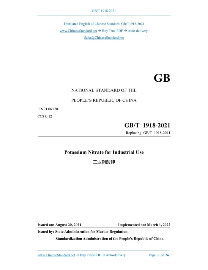 GB/T 1918-2021: Potassium nitrate for industrial use Delivery: 9 seconds. True-PDF full-copy in English & invoice will be downloaded + auto-delivered via email. See step-by-step procedure Status: Valid GB/T 1918: Historical versions