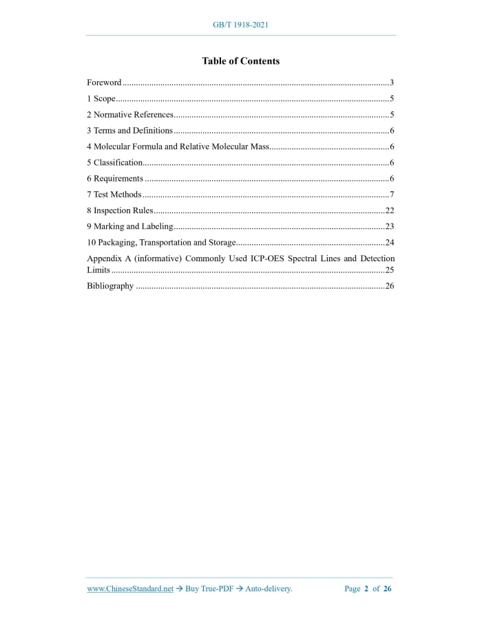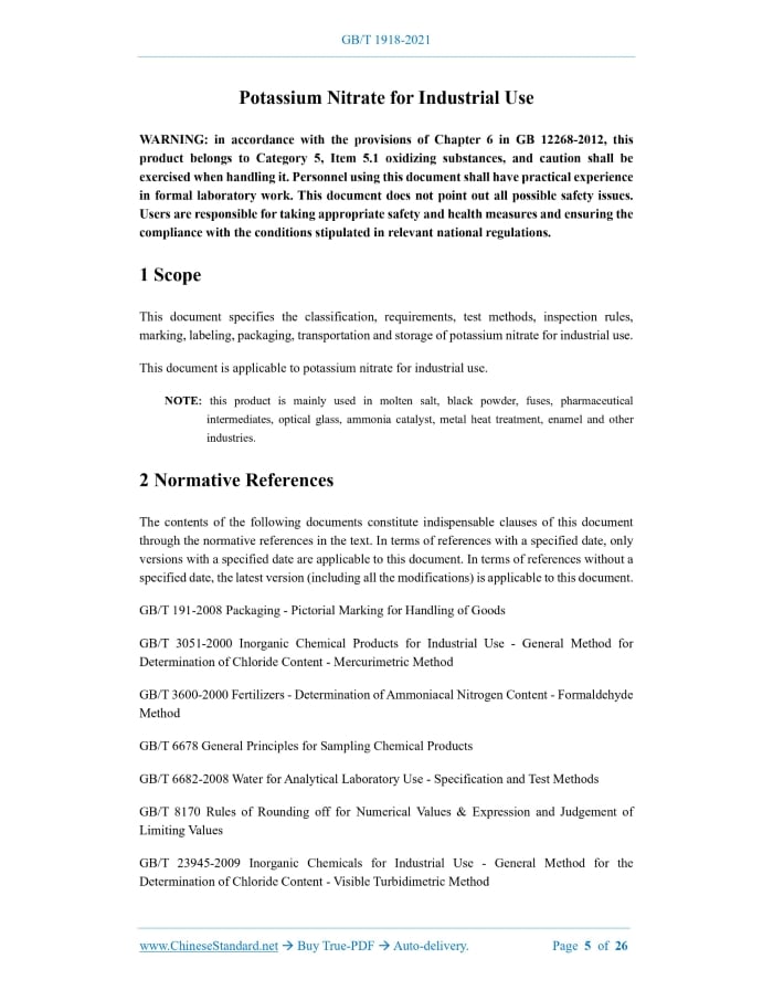 GB/T 1918-2021: Potassium nitrate for industrial use---This is an excerpt. Full copy of true-PDF in English version (including equations, symbols, images, flow-chart, tables, and figures etc.), auto-downloaded/delivered in 9 seconds, can be purchased online: https://www.ChineseStandard.net/PDF.aspx/GBT1918-2021GB NATIONAL STANDARD OF THE PEOPLE’S REPUBLIC OF CHINA ICS 71.060.50 CCS G 12 Replacing GB/T 1918-2011 Potassium Nitrate for Industrial Use 工业硝酸钾 ISSUED ON: AUGUST 20, 2021 IMPLEMENTED ON: MARCH 1, 2022 Issued by: State Administration for Market Regulation; Standardization Administration of the People’s Republic of China. Table of ContentsForeword ... 3 1 Scope ... 5 2 Normative References ... 5 3 Terms and Definitions ... 6 4 Molecular Formula and Relative Molecular Mass ... 6 5 Classification ... 6 6 Requirements ... 6 7 Test Methods ... 7 8 Inspection Rules ... 22 9 Marking and Labeling ... 23 10 Packaging, Transportation and Storage ... 24 Appendix A (informative) Commonly Used ICP-OES Spectral Lines and Detection Limits ... 25 Bibliography ... 26 Potassium Nitrate for Industrial Use WARNING: in accordance with the provisions of Chapter 6 in GB 12268-2012, this product belongs to Category 5, Item 5.1 oxidizing substances, and caution shall be exercised when handling it. Personnel using this document shall have practical experience in formal laboratory work. This document does not point out all possible safety issues. Users are responsible for taking appropriate safety and health measures and ensuring the compliance with the conditions stipulated in relevant national regulations.1 ScopeThis document specifies the classification, requirements, test methods, inspection rules, marking, labeling, packaging, transportation and storage of potassium nitrate for industrial use. This document is applicable to potassium nitrate for industrial use. NOTE: this product is mainly used in molten salt, black powder, fuses, pharmaceutical intermediates, optical glass, ammonia catalyst, metal heat treatment, enamel and other industries.2 Normative ReferencesThe contents of the following documents constitute indispensable clauses of this document through the normative references in the text. In terms of references with a specified date, only versions with a specified date are applicable to this document. In terms of references without a specified date, the latest version (including all the modifications) is applicable to this document. GB/T 191-2008 Packaging - Pictorial Marking for Handling of Goods GB/T 3051-2000 Inorganic Chemical Products for Industrial Use - General Method for Determination of Chloride Content - Mercurimetric Method GB/T 3600-2000 Fertilizers - Determination of Ammoniacal Nitrogen Content - Formaldehyde Method GB/T 6678 General Principles for Sampling Chemical Products GB/T 6682-2008 Water for Analytical Laboratory Use - Specification and Test Methods GB/T 8170 Rules of Rounding off for Numerical Values & Expression and Judgement of Limiting Values GB/T 23945-2009 Inorganic Chemicals for Industrial Use - General Method for the Determination of Chloride Content - Visible Turbidimetric Method HG/T 3696.1 Inorganic Chemicals for Industrial Use - Preparations of Standard and Reagent Solutions for Chemical Analysis - Part 1: Preparations of Standard Volumetric Solutions HG/T 3696.2 Inorganic Chemicals for Industrial Use - Preparations of Standard and Reagent Solutions for Chemical Analysis - Part 2: Preparations of Standard Solutions for Impurity HG/T 3696.3 Inorganic Chemicals for Industrial Use - Preparations of Standard and Reagent Solutions for Chemical Analysis - Part 3: Preparations of Reagent Solutions JT/T 617 (all parts) Regulations Concerning Road Transportation of Dangerous Goods3 Terms and DefinitionsThis document does not have terms or definitions that need to be defined.4 Molecular Formula and Relative Molecular MassMolecular formula: KNO3 Relative molecular mass: 101.10 (in accordance with the international relative atomic mass in 2018)5 ClassificationPotassium nitrate for industrial use is classified into three categories. The main purposes are as follows: ---Category I products are mainly used for molten salt manufacturing; ---Category II products are divided into two types. Type I products are mainly used for the manufacturing of black powder, fuses, pharmaceutical intermediates and glass clarifiers, etc. Type II products are mainly used for metal heat treatment and the manufacturing of enamel paint, etc.; ---Category III products are products added inorganic salts as anti-caking agents and are mainly used as fluxes for glass and ceramics.6 Requirements6.1 Appearance: potassium nitrate for industrial use is white crystal or spherical particles. 6.2 Potassium nitrate for industrial use shall be tested in accordance with the test methods specified in this document and shall comply with the stipulations of Table 1. 3696.1, HG/T 3696.2 and HG/T 3696.3. 7.2 Appearance Inspection Under natural light, adopt the method of visual inspection for determination. 7.3 Determination of Potassium Nitrate Content 7.3.1 Principle In neutral medium, potassium ions react with sodium tetraphenylborate to generate potassium tetraphenylborate precipitate. If ammonium ions are present, formaldehyde solution can be added to eliminate the interference of ammonium ions. In accordance with the mass of the generated potassium tetraphenylborate, determine the potassium nitrate content. Its main reaction formula is as follows: 7.3.2 Reagents or materials 7.3.2.1 Absolute ethanol. 7.3.2.2 Formaldehyde solution: filter before use. 7.3.2.3 Acetic acid solution: 1 + 100. 7.3.2.4 Sodium hydroxide solution: 4 g/L. 7.3.2.5 Sodium tetraphenylborate ethanol solution. 7.3.2.6 Saturated ethanol solution of potassium tetraphenylborate. 7.3.2.7 Methyl orange indicator solution: 1 g/L. 7.3.2.8 Phenolphthalein indicator solution: 10 g/L. 7.3.3 Instruments and equipment 7.3.3.1 Electric thermost