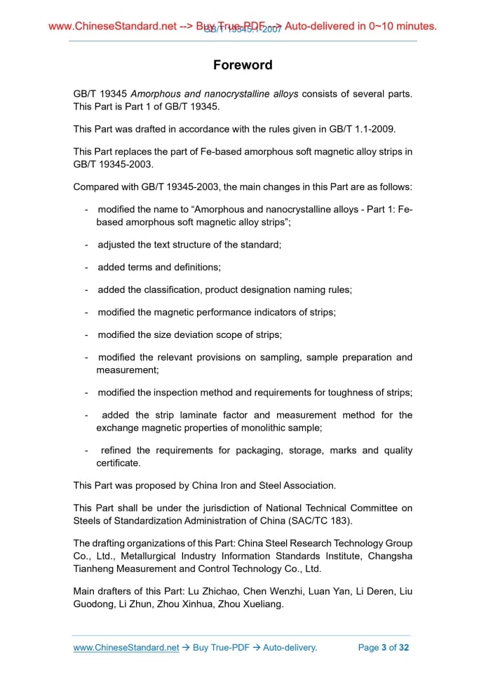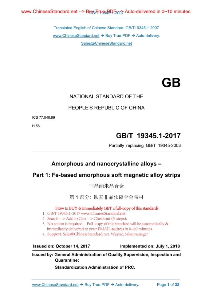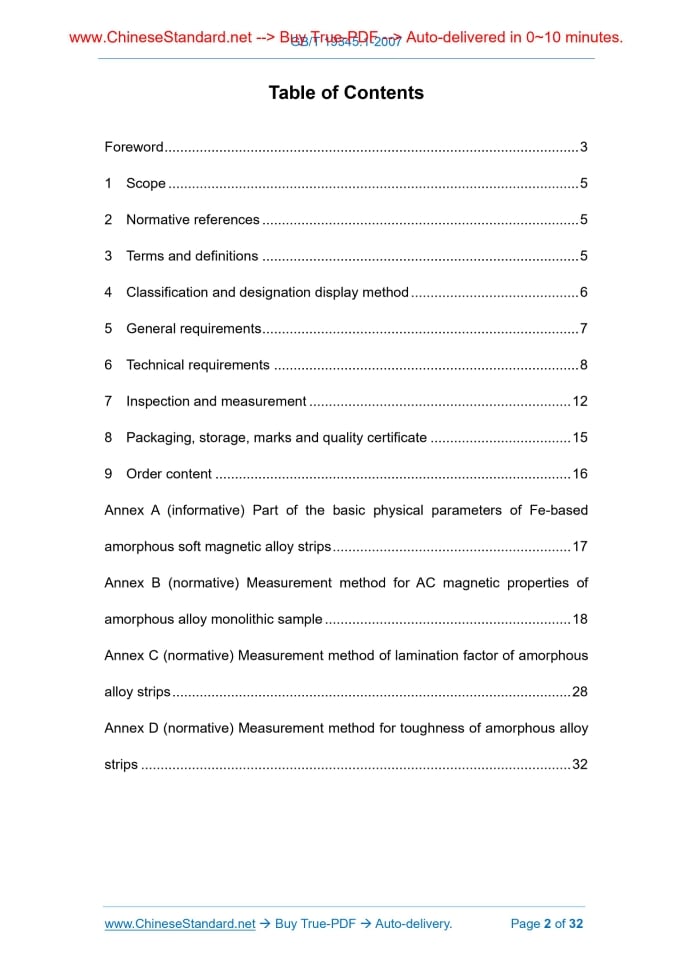 Similar standardsGB/T 19345.1-2017: Amorphous and nanocrystalline alloys - Part 1: Fe-based amorphous soft magnetic alloy strips---This is an excerpt. Full copy of true-PDF in English version (including equations, symbols, images, flow-chart, tables, and figures etc.), auto-downloaded/delivered in 9 seconds, can be purchased online: https://www.ChineseStandard.net/PDF.aspx/GBT19345.1-2017 GB NATIONAL STANDARD OF THE PEOPLE’S REPUBLIC OF CHINA ICS 77.040.99 H 58 GB/T 19345.1-2017 Partially replacing GB/T 19345-2003 Amorphous and nanocrystalline alloys – Part 1.Fe-based amorphous soft magnetic alloy strips Issued on. OCTOBER 14, 2017 Implemented on. JULY 1, 2018 Issued by. General Administration of Quality Supervision, Inspection and Quarantine; Standardization Administration of PRC. Table of ContentsForeword... 3 1 Scope... 5 2 Normative references... 5 3 Terms and definitions... 5 4 Classification and designation display method... 6 5 General requirements... 7 6 Technical requirements... 8 7 Inspection and measurement... 12 8 Packaging, storage, marks and quality certificate... 15 9 Order content... 16 Annex A (informative) Part of the basic physical parameters of Fe-based amorphous soft magnetic alloy strips... 17 Annex B (normative) Measurement method for AC magnetic properties of amorphous alloy monolithic sample... 18 Annex C (normative) Measurement method of lamination factor of amorphous alloy strips... 28 Annex D (normative) Measurement method for toughness of amorphous alloy strips... 321 ScopeThis Part specifies the terms and definitions, classification and display method of designation, general requirements, technical requirements, inspection and measurement, packaging, storage, marks and quality certificate of Fe-based amorphous soft magnetic alloy strips manufactured with fast quenching process. This Part is applicable to Fe-based amorphous soft magnetic alloy strips used for iron core of distribution transformer, medium frequency transformer, reactor, filter inductor (hereinafter referred to as the strips).2 Normative referencesThe following referenced documents are indispensable for the application of this document. For dated references, only the edition cited applies. For undated references, the latest edition of the referenced document (including any amendments) applies. GB/T 2900.1, Electrotechnical terminology Fundamental terms GB/T 9637, Electrotechnical terminology - Magnetic materials and components3 Terms and definitionsFor the purposes of this document, the terms and definitions specified in GB/T 2900.1, GB/T 9637 and GB/T 15019 as well as the followings apply. 3.1 specific total loss the total power absorbed by the homogeneous magnetized material per unit mass, in watts per kilogram (W/kg) 3.2 specific apparent power the apparent power the total apparent power delivered to a unit mass of uniform magnetized material, in volt-amperes per kilogram (VA/kg) 3.3 lamination factor the ratio of the cross-sectional area of the magnetic material to the total cross- sectional area of the stack4 Classification and designation display methodThe designation of the strips uses chemical element symbols and English letters combined with the Arabic numerals by a connector. The general form of the strip designation is.5 General requirements5.1 Production process The production process and chemical composition of the strips are decided by the supplier. 5.2 Delivery form 5.2.5 The strips shall be wound tightly, no local relaxation, no wrinkles, no collapse, no falling off during handling due to self-weight, no lateral offset during unwinding. 5.2.6 The strips may be spliced by removing defects. The front and back parts of splicing shall be of same designation, same nominal width. The part of splicing shall be marked. 5.2.7 The particular requirements for strip delivery form shall be determined by the supplier and the purchaser. 5.3 Delivery conditions The strips are normally delivered in non-sheared semi-processed state (prepared state) with the absence of a top coat. The particular requirements for strip delivery form shall be determined by the supplier and the purchaser. 5.4 Surface quality 5.4.1 The surface of the strips shall not have rusts, greases, fingerprints, foreign materials or the continuous visible oxidation. 5.5 Shear adaptability When using suitable equipment for cutting, any part of the strips shall be able to be cut into the usual shape.6 Technical requirements6.1 Physical properties 6.1.1 The strips delivered in the semi-processed state (prepared state) shall be heat-treated properly to obtain the desired magnetic properties. 6.1.2 The magnetic properties of the strips shall comply with the provisions of Table 1, Table 2, Table 3, respectively. The heat treatment process is provided by the supplier and indicated in the quality certificate. Any particular requirements for magnetic properties may be determined by the supplier and the purchaser. 6.1.3 See Table A.1 for other basic physical parameters of the strips. 6.2 Geometric characteristics 6.2.1 Thickness and allowable deviation 6.2.1.1 The nominal thicknesses of the strips are 0.020 mm, 0.025 mm, 0.030 mm. 6.2.2 Width and allowable deviation 6.2.2.1 The width scope of the strips is 10mm ~ 300mm. The specific size shall be determined in the contract. 6.3 Technical characteristics 6.3.1 Density The density used for the calculations of strip magnetic properties and lamination factor is supplied by the supplier. 6.3.2 Lamination factor The strip lamination factor shall comply with Table 1.7 Inspection and measurement7.1 General requirements 7.1.1 The strips shall be submitted for inspection and measurement. Each casting furnace is an acceptance batch. 7.1.2 When the strips are supplied in divided coils. The measurement results on the original acceptance batch apply to this divided coil. 7.2 Sampling 7.2.1 It shall extract a sample respectively on the head, the end of each batch of the strips. When more than one co