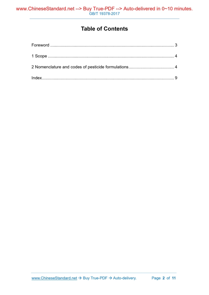 Similar standardsGB/T 19378-2017: Nomenclature and codes of pesticide formulations---This is an excerpt. Full copy of true-PDF in English version (including equations, symbols, images, flow-chart, tables, and figures etc.), auto-downloaded/delivered in 9 seconds, can be purchased online: https://www.ChineseStandard.net/PDF.aspx/GBT19378-2017NATIONAL STANDARD OF THE PEOPLE’S REPUBLIC OF CHINA ICS 65.100 G 23 Replacing GB/T 19378-2003 Nomenclature and codes of pesticide formulations 农药剂型名称及代码 ISSUED ON: NOVEMBER 01, 2017 IMPLEMENTED ON: MAY 01, 2018 Issued by: General Administration of Quality Supervision, Inspection and Quarantine; Standardization Administration of the People's Republic of China. Table of ContentsForeword ... 3 1 Scope ... 4 2 Nomenclature and codes of pesticide formulations ... 4 Index ... 9ForewordThis Standard was drafted in accordance with the rules given in GB/T 1.1-2009. This Standard replaces GB/T 19378-2003 “Nomenclature and codes for pesticide for formulations”. Compared with GB/T 19378-2003, the main changes in this Standard are as follows: -- adjusted the sorting of and revised the categories and category names of the directly-used smoke formulations and bait formulations; added the category of spatial repellent formulations; -- optimized and integrated the formulations such as drop solution in the original standard; verified and revised the Chinese names and English names of the formulations such as hanging strip; -- deleted the backward formulations such as floating powder, packaging formulations and formulations without products in circulation; -- added insect-proof net formulations and insect-proof cover formulations. This Standard was proposed by China Petroleum and Chemical Industry Federation. This Standard shall be under the jurisdiction of National Technical Committee on Pesticide of Standardization Administration of China (SAC/TC 133). The drafting organization of this Standard: Pesticide Inspection Institute of the Ministry of Agriculture. Main drafters of this Standard: Zhao Yonghui, Sun Yanping, Li Xin, Zhang Wei, Fu Guiping, Piao Xiuying, Ji Lili, Wei Qiwen, Shan Weili, Song Junhua, Wang Yiyan. Version of standard substituted by this Standard is: -- GB/T 19378-2003. Nomenclature and codes of pesticide formulations1 ScopeThis Standard specifies the formulation names and codes of pesticide products. This Standard is applicable to technical materials, technical concentrates and formulations of pesticide.2 Nomenclature and codes of pesticide formulationsSee Table 1 for the nomenclature and codes of pesticide formulations. Table 1 -- Nomenclature and codes of pesticide formulations Clause No. English name of formulation Code Description 2.1 technical materials and technical concentrates 2.1.1 technical material TC A product that is composed of active ingredients and related impurities in the manufacturing process, which can be added with a small number of additives (stabilizers) if necessary. 2.1.2 technical concentrate TK A product that is composed of active ingredients and related impurities in the manufacturing process, which might contain a small number of necessary additives (such as stabilizers) and appropriate diluents. 2.2 solid formulations for direct use 2.2.1 solid formulations for direct use 2.2.1.1 dustable powder DP A powdery formulation that contains active ingredients, can flow freely and is suitable for dusting or spraying. 2.2.1.2 granule GR A granular formulation containing active ingredients, which has a certain particle size range and can flow freely. 2.2.1.3 pellet PT * A spherical formulation that contains active ingredients (generally greater than 6mm in diameter). 2.2.1.4 tablet TB A sheet-shaped formulation of a certain shape and size, which contains active ingredients. 2.2.1.5 plant rodlet PR A stick-shaped or rod-shaped formulation that contains active ingredients (generally a few centimeters in length and a few millimeters in width/diameter, that is, the length is greater than the diameter/width). 2.2.2 solid formulation for dispersion 2.2.2.1 wettable powder WP A powdery formulation in which the active ingredients are dispersed in water as a suspension. for slurry seed treatment 2.4.2 seed treatment liquid formulations 2.4.2.1 solution for seed treatment LS A transparent or translucent liquid formulation that is directly used for or diluted for seed processing, that contains active ingredients, that might contain water-insoluble inert ingredients. 2.4.2.2 emulsion for seed treatment ES A stable emulsion formulation that is directly used for or diluted for seed processing, that contains active ingredients. 2.4.2.3 suspension concentrate for seed treatment (flowable concentrate for seed treatment) FS A suspended liquid formulation that is directly used for or diluted for seed processing, that contains active ingredients. 2.5 other formulations 2.5.1 formulations prepared as devices 2.5.1.1 aerosol dispenser AE A sealed canned formulation that sprays small liquid beads or mist droplets containing medicinal liquid containing active ingredients under the action of the propellant. 2.5.1.2 vaporizing mat MV A sheet-shaped formulation that uses paper or other carriers as a carrier, heating in the supporting heater to volatilize the active ingredients. 2.5.1.3 liquid vaporizer LV A homogeneous liquid formulation in which the active ingredients are volatilized by heating the core rod under the cooperation of a medicine bottle and a matching heater. 2.5.1.4 proof mat PM * A sheet-shaped or granular formulation that uses synthetic resin or other as a carrier to evaporate the active ingredients under the action of the wind of a supporting fan. 2.5.2 volatile formulations 2.5.2.1 gas GA A gas formulation that active ingredients are compressed in a pressure-resistant container. 2.5.2.1. gas generating product GE A gas formulation that uses chemical reaction to produce active ingredients. 2.5.2.2 dispensor DR * A f