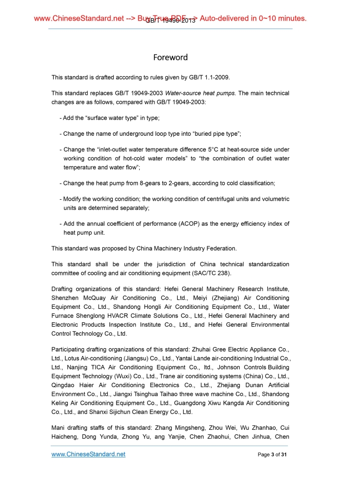 Similar standardsGB/T 19409-2013: Water-source (ground-source) heat pumps---This is an excerpt. Full copy of true-PDF in English version (including equations, symbols, images, flow-chart, tables, and figures etc.), auto-downloaded/delivered in 9 seconds, can be purchased online: https://www.ChineseStandard.net/PDF.aspx/GBT19409-2013GB NATIONAL STANDARD OF THE PEOPLE’S REPUBLIC OF CHINA ICS 27.200 J 73 Replacing GB/T 19490-2003 Water source (ground-source) heat pumps Issued on: DECEMBER 17, 2013 Implemented on: OCTOBER 01, 2014 Issued by. General Administration of Quality Supervision, Inspection and Quarantine of the People’s Republic of China; Standardization Administration of the People’s Republic of China. Table of ContentsForeword... 3 1 Scope... 5 2 Normative references... 5 3 Terms and definitions... 6 4 Types and basic parameters... 7 5 Requirements... 9 6 Test method... 13 7 Inspection rules... 20 8 Mark, packaging, transportation and storage... 21 Annex A... 24 Annex B... 28ForewordThis standard is drafted according to rules given by GB/T 1.1-2009. This standard replaces GB/T 19049-2003 Water-source heat pumps. The main technical changes are as follows, compared with GB/T 19049-2003. - Add the “surface water type” in type; - Change the name of underground loop type into “buried pipe type”; - Change the “inlet-outlet water temperature difference 5°C at heat-source side under working condition of hot-cold water models” to “the combination of outlet water temperature and water flow”; - Change the heat pump from 8-gears to 2-gears, according to cold classification; - Modify the working condition; the working condition of centrifugal units and volumetric units are determined separately; - Add the annual coefficient of performance (ACOP) as the energy efficiency index of heat pump unit. This standard was proposed by China Machinery Industry Federation. This standard shall be under the jurisdiction of China technical standardization committee of cooling and air conditioning equipment (SAC/TC 238). Drafting organizations of this standard. Hefei General Machinery Research Institute, Shenzhen McQuay Air Conditioning Co., Ltd., Meiyi (Zhejiang) Air Conditioning Equipment Co., Ltd., Shandong Hongli Air Conditioning Equipment Co., Ltd., Water Furnace Shenglong HVACR Climate Solutions Co., Ltd., Hefei General Machinery and Electronic Products Inspection Institute Co., Ltd., and Hefei General Environmental Control Technology Co., Ltd. Participating drafting organizations of this standard. Zhuhai Gree Electric Appliance Co., Ltd., Lotus Air-conditioning (Jiangsu) Co., Ltd., Yantai Lande air-conditioning Industrial Co., Ltd., Nanjing TICA Air Conditioning Equipment Co., ltd., Johnson Controls Building Equipment Technology (Wuxi) Co., Ltd., Trane air conditioning systems (China) Co., Ltd., Qingdao Haier Air Conditioning Electronics Co., Ltd., Zhejiang Dunan Artificial Environment Co., Ltd., Jiangxi Tsinghua Taihao three wave machine Co., Ltd., Shandong Keling Air Conditioning Equipment Co., Ltd., Guangdong Xiwu Kangda Air Conditioning Co., Ltd., and Shanxi Sijichun Clean Energy Co., Ltd. Mani drafting staffs of this standard. Zhang Mingsheng, Zhou Wei, Wu Zhanhao, Cui Haicheng, Dong Yunda, Zhong Yu, ang Yanjie, Chen Zhaohui, Chen Jinhua, Chen Water source (ground-source) heat pumps1 ScopeThis standard specifies the terms and definitions, types and basic parameters, requirements, test methods, inspection rules, marking, packaging, transport and storage of water source (ground-source) heat pumps (hereinafter referred to as “UNIT”). This standard applies to water source heat pumps that use electromechanical compression cooling system and takes the water circulating in buried pipes or water in wells, lakes, rivers, oceans, sewage, industrial waste, or water in common pipelines as cold (hot) source.2 Normative referencesThe following documents are indispensable for application of this document. For the dated documents so quoted, only dated versions apply to this document. For the undated documents so quoted, the latest versions (including all modification sheets) apply to this document. GB/T 191 Packaging - Pictorial marking for handling of goods GB/T 3785-1983 Electric, sonic properties and measuring methods for sound level meters GB 4706.32 Safety of household and similar electrical appliances - Particular requirements for heat pumps, air-conditioner and dehumidifier GB/T 5226.1 Electrical equipment of industrial machines. Part 1.General requirements GB/T 6388 Transport package shipping mark GB/T 10870-2001 The methods of performance test for positive displacement and centrifugal water-chilling units and heat pump GB/T 13306 Plates GB/T 18430.1-2007 Water chilling (heat pump) packages using the vapor compression cycle - Household and similar water chilling (heat pump) packages GB/T 17758-2010 Unitary air conditioners GB/T 18836-2002 Ducted air-conditioning (heat pump) units 3.1.5 Ground-loop heat pumps The UNIT that uses water circulating in underground coil as cold (hot) source. 3.1.6 Surface-water heat pump The UNIT that uses water in lakes, rivers, oceans, sewage, industrial waste, or other surface water as cold (hot) source. 3.2 (ACOP) Annual Coefficient of Performance; ACOP The annual coefficient of performance obtained by comprehensively WEIGHTING the efficiency for water-source (ground-source) heat pumps when operating at full-load under nominal cooling conditions and nominal heating conditions WITH several office buildings in typical cities according to the ratio of cooling and heating time. Annual coefficient of performance ACOP = 0.56EER+0.44COP Note 1.EER is the energy efficiency of water (ground) heat pump when the UNIT runs at full capacity under rated cooling condition. Note 2.COP the energy efficiency of water (ground) heat pump when the UNIT runs at full capacity under rated heating condition. Note 3.The weighting coefficients, 0.56 and 0.44, are the proport