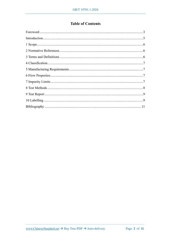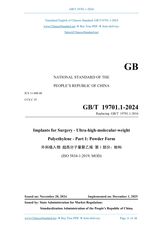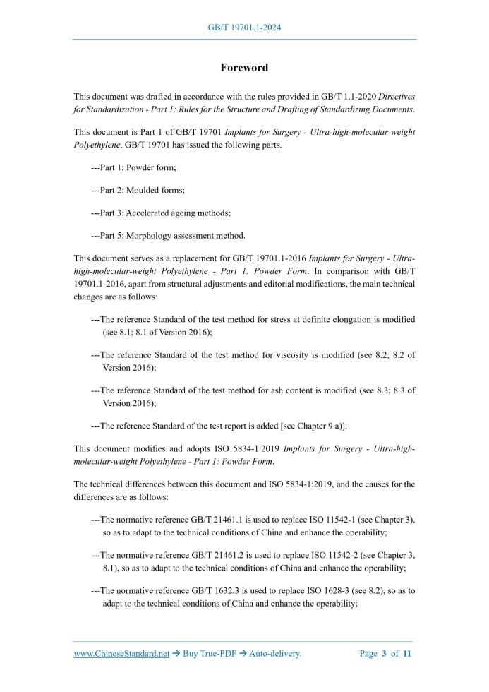 Similar standardsGB/T 19701.1-2024: Implants for surgery - Ultra-high-molecular-weight polyethylene - Part 1: Powder form---This is an excerpt. Full copy of true-PDF in English version (including equations, symbols, images, flow-chart, tables, and figures etc.), auto-downloaded/delivered in 9 seconds, can be purchased online: https://www.ChineseStandard.net/PDF.aspx/GBT19701.1-2024 GB NATIONAL STANDARD OF THE PEOPLE’S REPUBLIC OF CHINA ICS 11.040.40 CCS C 35 Replacing GB/T 19701.1-2016 Implants for Surgery - Ultra-high-molecular-weight Polyethylene - Part 1.Powder Form (ISO 5834-1.2019, MOD) Issued on: NOVEMBER 28, 2024 Implemented on: DECEMBER 1, 2025 Issued by. State Administration for Market Regulation; Standardization Administration of the People’s Republic of China. Table of ContentsForeword... 3 Introduction... 5 1 Scope... 6 2 Normative References... 6 3 Terms and Definitions... 6 4 Classification... 7 5 Manufacturing Requirements... 7 6 Flow Properties... 7 7 Impurity Limits... 7 8 Test Methods... 8 9 Test Report... 9 10 Labelling... 9 Bibliography... 11ForewordThis document was drafted in accordance with the rules provided in GB/T 1.1-2020 Directives for Standardization - Part 1.Rules for the Structure and Drafting of Standardizing Documents. This document is Part 1 of GB/T 19701 Implants for Surgery - Ultra-high-molecular-weight Polyethylene. GB/T 19701 has issued the following parts. ---Part 1.Powder form; ---Part 2.Moulded forms; ---Part 3.Accelerated ageing methods; ---Part 5.Morphology assessment method. This document serves as a replacement for GB/T 19701.1-2016 Implants for Surgery - Ultra- high-molecular-weight Polyethylene - Part 1.Powder Form. In comparison with GB/T 19701.1-2016, apart from structural adjustments and editorial modifications, the main technical changes are as follows. ---The reference Standard of the test method for stress at definite elongation is modified (see 8.1; 8.1 of Version 2016); ---The reference Standard of the test method for viscosity is modified (see 8.2; 8.2 of Version 2016); ---The reference Standard of the test method for ash content is modified (see 8.3; 8.3 of Version 2016); ---The reference Standard of the test report is added [see Chapter 9 a)]. This document modifies and adopts ISO 5834-1.2019 Implants for Surgery - Ultra-high- molecular-weight Polyethylene - Part 1.Powder Form. The technical differences between this document and ISO 5834-1.2019, and the causes for the differences are as follows. ---The normative reference GB/T 21461.1 is used to replace ISO 11542-1 (see Chapter 3), so as to adapt to the technical conditions of China and enhance the operability; ---The normative reference GB/T 21461.2 is used to replace ISO 11542-2 (see Chapter 3, 8.1), so as to adapt to the technical conditions of China and enhance the operability; ---The normative reference GB/T 1632.3 is used to replace ISO 1628-3 (see 8.2), so as to adapt to the technical conditions of China and enhance the operability; Implants for Surgery - Ultra-high-molecular-weight Polyethylene - Part 1.Powder Form1 ScopeThis document specifies the requirements for ultra-high-molecular-weight polyethylene (PE- UHMW) powders for surgical implants and describes the corresponding test methods. This document does not apply to products made from powders.2 Normative ReferencesThe contents of the following documents constitute indispensable clauses of this document through the normative references in the text. In terms of references with a specified date, only versions with a specified date are applicable to this document. In terms of references without a specified date, the latest version (including all the modifications) is applicable to this document. GB/T 1632.3 Plastics - Determination of the Viscosity of Polymers in Dilute Solution Using Capillary Viscometer - Part 3.Polyethylenes and Polypropylenes (GB/T 1632.3-2010, ISO 1628-3.2001, MOD) GB/T 9345.1 Plastics - Determination of Ash - Part 1.General Methods (GB/T 9345.1-2008, ISO 3451-1.1997, IDT) GB/T 21461.1 Plastics - Ultra-high-molecular-weight Polyethylene (PE-UHMW) Moulding and Extrusion Materials - Part 1.Designation System and Basis for Specifications (GB/T 21461.1-2023, ISO 21304-1.2019, MOD) GB/T 21461.2 Plastics - Ultra-high-molecular-weight Polyethylene (PE-UHMW) Moulding and Extrusion Materials - Part 2.Preparation of Test Specimens and Determination of Properties (GB/T 21461.2-2023, ISO 21304-2.2021, MOD) DIN 53474 Testing of Plastics, Rubber and Elastomers - Determination of the Chlorine Content (Wickbold-combustion)3 Terms and DefinitionsThe terms and definitions defined in GB/T 21461.1 and GB/T 21461.2 are applicable to this document. The URLs of the terminology databases for standardization maintained by ISO and IEC are as ......Source: Above contents are excerpted from the full-copy PDF -- translated/reviewed by: www.ChineseStandard.net / Wayne Zheng et al. Tips & Frequently Asked Questions:Question 1: How long will the true-PDF of English version of GB/T 19701.1-2024 be delivered?Answer: The full copy PDF of English version of GB/T 19701.1-2024 can be downloaded in 9 seconds, and it will also be emailed to you in 9 seconds (double mechanisms to ensure the delivery reliably), with PDF-invoice.Question 2: Can I share the purchased PDF of GB/T 19701.1-2024_English with my colleagues?Answer: Yes. The purchased PDF of GB/T 19701.1-2024_English will be deemed to be sold to your employer/organization who actually paid for it, including your colleagues and your employer's intranet.Question 3: Does the price include tax/VAT?Answer: Yes. Our tax invoice, downloaded/delivered in 9 seconds, includes all tax/VAT and complies with 100+ countries' tax regulations (tax exempted in 100+ countries) -- See Avoidance of Double Taxation Agreements (DTAs): List of DTAs signed between Singapore and 100+ countriesQuestion 4: Do you accept my currency other than USD?Answer: Yes. www.ChineseStandard.us -- GB/T 19701.1-2024 --