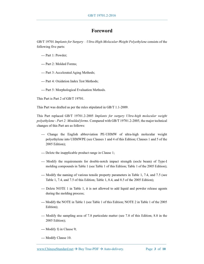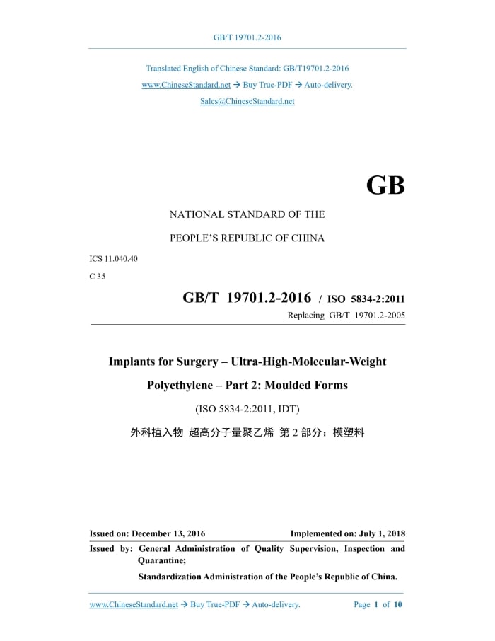 Similar standardsGB/T 19701.2-2016: Implants for surgery -- Ultra-high-molecular-weight polyethylene -- Part 2: Moulded forms---This is an excerpt. Full copy of true-PDF in English version (including equations, symbols, images, flow-chart, tables, and figures etc.), auto-downloaded/delivered in 9 seconds, can be purchased online: https://www.ChineseStandard.net/PDF.aspx/GBT19701.2-2016 GB NATIONAL STANDARD OF THE PEOPLE’S REPUBLIC OF CHINA ICS 11.040.40 C 35 GB/T 19701.2-2016 / ISO 5834-2.2011 Replacing GB/T 19701.2-2005 Implants for Surgery – Ultra-High-Molecular-Weight Polyethylene – Part 2.Moulded Forms (ISO 5834-2.2011, IDT) Issued on: DECEMBER 13, 2016 Implemented on: JULY 1, 2018 Issued by. General Administration of Quality Supervision, Inspection and Quarantine; Standardization Administration of the People’s Republic of China. Table of ContentsForeword... 3 1 Scope... 5 2 Normative References... 5 3 Classification... 5 4 Materials... 6 5 Manufacturing Requirements... 6 6 Requirements... 6 7 Test Methods... 7 8 Marking... 8 9 Inspection Certificate... 9 10 Labels... 9 Bibliography... 10ForewordGB/T 19701 Implants for Surgery – Ultra-High-Molecular-Weight Polyethylene consists of the following five parts. --- Part 1.Powder; --- Part 2.Molded Forms; --- Part 3.Accelerated Aging Methods; --- Part 4.Oxidation Index Test Methods; --- Part 5.Morphological Evaluation Methods. This Part is Part 2 of GB/T 19701. This Part was drafted as per the rules stipulated in GB/T 1.1-2009. This Part replaced GB/T 19701.2-2005 Implants for surgery Ultra-high molecular weight polyethylene - Part 2.Moulded forms. Compared with GB/T 19701.2-2005, the major technical changes of this Part are as follows. --- Change the English abbreviation PE-UHMW of ultra-high molecular weight polyethylene into UHMWPE (see Clauses 1 and 4 of this Edition; Clauses 1 and 5 of the 2005 Edition); --- Delete the inapplicable product range in Clause 1; --- Modify the requirements for double-notch impact strength (socle beam) of Type-I molding compounds in Table 1 (see Table 1 of this Edition; Table 1 of the 2005 Edition); --- Modify the naming of various tensile property parameters in Table 1, 7.4, and 7.5 (see Table 1, 7.4, and 7.5 of this Edition; Table 1, 8.4, and 8.5 of the 2005 Edition); --- Delete NOTE 1 in Table 1, it is not allowed to add liquid and powder release agents during the molding process; --- Modify the NOTE in Table 1 (see Table 1 of this Edition; NOTE 2 in Table 1 of the 2005 Edition); --- Modify the sampling area of 7.8 particulate matter (see 7.8 of this Edition; 8.8 in the 2005 Edition); --- Modify f) in Clause 9; --- Modify Clause 10. Implants for Surgery – Ultra-High-Molecular-Weight Polyethylene – Part 2.Moulded Forms1 ScopeThis Part of GB/T 19701 specifies the requirements and corresponding test methods for ultra- high molecular weight polyethylene (UHMWPE) molding compounds (such as plates, rods) for surgical implants. This Part does not apply to directly molded (near final form) products, irradiated products or final products, nor to products made from polyethylene containing additives or blends of different types of polyethylene.2 Normative ReferencesThe following documents are essential to the application of this Document. For the dated documents, only the versions with the dates indicated are applicable to this Document; for the undated documents, only the latest version (including all the amendments) is applicable to this Document. ISO 527-1 Plastics – Determination of tensile properties – Part 1.General Principles ISO 1183-1 Plastic – Methods for determining the density of no-cellular plastics – Part 1. Immersion method, Liquid pycnometer method and titration method ISO 3451-1.2008 Plastics – Determination of ash – Part 1.General methods ISO 5834-1 Implants for surgery – Ultra-high-molecular weight polyethylene – Part 1. Powder form ISO 11542-2.1992 Plastics – Ultra-high-molecular-weight polyethylene (PE-UHMW) moulding and extrusion materials – Part 2.Preparation of test specimens and determination of properties3 ClassificationMaterials for Type-1, Type-2, and Type-3 powder molding defined by ISO 5834-1 are accordingly divided into Type-1, Type-2, and Type-3 molding compounds.4 MaterialsThe molding compounds shall be molded from UHMWPE powder that meets the requirements of ISO 5834-1.5 Manufacturing RequirementsThe molding compound supplied with each order shall be marked with the batch number. NOTE. "Batch" refers to the material unit that has been tested and has independent test records. The molding compound should be stress-relieved and annealed in accordance with the agreement between the supplier and the purchaser. During the molding process, in order to avoid contamination, additive migration and molding defects, liquid or powdered release agents (such as those based on silicon or talc) shall not be used.6 Requirements6.1 Physical properties When tested according to the test methods in Table 1, the physical properties of the molding compound shall comply with the corresponding given values for each type of material in Table 1. Since subsequent manufacturing processes may affect the comparability of test results, the physical properties of cured and annealed materials shall be tested before further processing. 6.2 Particulate matter When inspected with normal or corrected vision without magnification, the number of visible particles on the surface of the sample shall not exceed 10 when prepared in accordance with 7.8. The ash shall be measured according to Method-A of ISO 3451-1.2008; take two portions of specimens to carry out parallel test under the condition of (700±50) °C. The average value of the test results of 2 specimen shall be no lower than the value given in Table 1. 7.4 Tensile yield stress The tensile yield stress σy shall be carried out according to the tensile test method stipulated in ISO 527-1; use the material tester to measure the stre