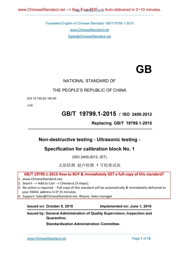 GB/T 19799.1-2015: Non-destructive testing -- Ultrasonic testing -- Specification for calibration block No.1 Delivery: 9 seconds. True-PDF full-copy in English & invoice will be downloaded + auto-delivered via email. See step-by-step procedure Status: Valid GB/T 19799.1: Historical versions