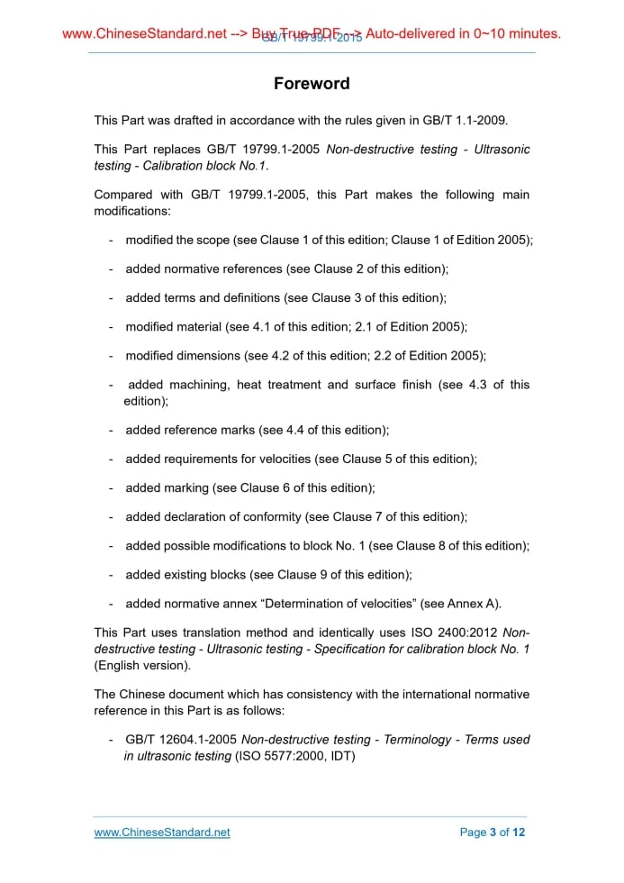 Similar standardsGB/T 19799.1-2015: Non-destructive testing -- Ultrasonic testing -- Specification for calibration block No.1---This is an excerpt. Full copy of true-PDF in English version (including equations, symbols, images, flow-chart, tables, and figures etc.), auto-downloaded/delivered in 9 seconds, can be purchased online: https://www.ChineseStandard.net/PDF.aspx/GBT19799.1-2015 GB NATIONAL STANDARD OF THE PEOPLE’S REPUBLIC OF CHINA ICS 19.100;25.160.40 J 04 GB/T 19799.1-2015 / ISO 2400.2012 Replacing GB/T 19799.1-2015 Non-destructive testing - Ultrasonic testing - Specification for calibration block No. 1 (ISO 2400.2012, IDT) Issued on: OCTOBER 9, 2015 Implemented on: JUNE 1, 2016 Issued by. General Administration of Quality Supervision, Inspection and Quarantine; Standardization Administration Committee. Table of ContentsForeword ... 3 1 Scope ... 5 2 Normative references ... 5 3 Terms and definitions ... 5 4 Manufacture ... 5 5 Velocities ... 8 6 Marking ... 9 7 Declaration of conformity ... 9 8 Possible modifications to block No. 1 ... 9 9 Existing blocks ... 11 Annex A (Normative) Determination of velocities ... 12ForewordThis Part was drafted in accordance with the rules given in GB/T 1.1-2009. This Part replaces GB/T 19799.1-2005 Non-destructive testing - Ultrasonic testing - Calibration block No.1. Compared with GB/T 19799.1-2005, this Part makes the following main modifications. - modified the scope (see Clause 1 of this edition; Clause 1 of Edition 2005); - added normative references (see Clause 2 of this edition); - added terms and definitions (see Clause 3 of this edition); - modified material (see 4.1 of this edition; 2.1 of Edition 2005); - modified dimensions (see 4.2 of this edition; 2.2 of Edition 2005); - added machining, heat treatment and surface finish (see 4.3 of this edition); - added reference marks (see 4.4 of this edition); - added requirements for velocities (see Clause 5 of this edition); - added marking (see Clause 6 of this edition); - added declaration of conformity (see Clause 7 of this edition); - added possible modifications to block No. 1 (see Clause 8 of this edition); - added existing blocks (see Clause 9 of this edition); - added normative annex “Determination of velocities” (see Annex A). This Part uses translation method and identically uses ISO 2400.2012 Non- destructive testing - Ultrasonic testing - Specification for calibration block No. 1 (English version). The Chinese document which has consistency with the international normative reference in this Part is as follows. - GB/T 12604.1-2005 Non-destructive testing - Terminology - Terms used in ultrasonic testing (ISO 5577.2000, IDT) This Part was proposed by and shall be under jurisdiction of National Technical Committee on Non-destructive Testing of Standardization Administration of China (SAC/TC 56). The drafting organizations of this Part. Shanghai Materials Research Institute, Shandong Ruixiang Mold Co., Ltd. (Shandong Jining Mold Factory), Wujiang Hongda Flaw Detection Equipment Co., Ltd., Luoyang LYC Bearing Co., Ltd., Shanghai COSCO Kawasaki Heavy Industries Steel Structure Co., Ltd., Shanghai Jianke Inspection Co., Ltd., Shanghai Heavy Machinery Factory Co., Ltd., Dehua Material Testing Co., Ltd. Main drafters of this Part. Xi Lifeng, Ding Jie, Jiang Wei, Jin Yufei, Wei Zhongrui, Chen Cuili, Shen Mingkui, Tian Ruibin, Fan Weidong, Yin Fei, Cai Xiao, Xu Hong, Xia Weilin, Hua Ruxi. Version of standard substituted by this Standard is. - GB/T 19799.1-2005. Non-destructive testing - Ultrasonic testing - Specification for calibration block No. 11 ScopeThis Part of GB/T 19799 specifies requirements for the dimensions, material and manufacture of a steel block for calibrating ultrasonic test equipment used in manual testing.2 Normative referencesThe following referenced documents are indispensable for the application of this document. For dated references, only the edition cited applies. For undated references, the latest edition of the referenced document (including any amendments) applies. ISO 5577, Non-destructive testing - Ultrasonic inspection - Vocabulary EN 1330-4, Non-destructive testing - Terminology - Part 4. Terms used in ultrasonic testing EN 10025-2, Hot rolled products of structural steels - Part 2. Technical delivery conditions for non-alloy structural steels3 Terms and definitionsFor the purposes of this document, the terms and definitions given in ISO 5577 and EN 1330-4 apply.4 Manufacture4.1 Steel Blocks shall be manufactured from steel grade S355J0, specified in EN 10025- 2, or from steel of an equivalent grade. 4.2 Dimensions The dimensions of calibration block No. 1 shall be as shown in Figure 1. ......Source: Above contents are excerpted from the full-copy PDF -- translated/reviewed by: www.ChineseStandard.net / Wayne Zheng et al. Tips & Frequently Asked Questions:Question 1: How long will the true-PDF of English version of GB/T 19799.1-2015 be delivered?Answer: The full copy PDF of English version of GB/T 19799.1-2015 can be downloaded in 9 seconds, and it will also be emailed to you in 9 seconds (double mechanisms to ensure the delivery reliably), with PDF-invoice.Question 2: Can I share the purchased PDF of GB/T 19799.1-2015_English with my colleagues?Answer: Yes. The purchased PDF of GB/T 19799.1-2015_English will be deemed to be sold to your employer/organization who actually paid for it, including your colleagues and your employer's intranet.Question 3: Does the price include tax/VAT?Answer: Yes. Our tax invoice, downloaded/delivered in 9 seconds, includes all tax/VAT and complies with 100+ countries' tax regulations (tax exempted in 100+ countries) -- See Avoidance of Double Taxation Agreements (DTAs): List of DTAs signed between Singapore and 100+ countriesQuestion 4: Do you accept my currency other than USD?Answer: Yes. www.ChineseStandard.us -- GB/T 19799.1-2015 -- Click this link and select your country/currency to pay, the exact amount in your curre