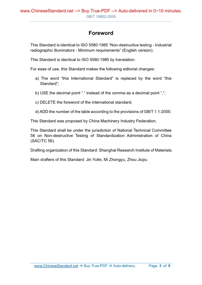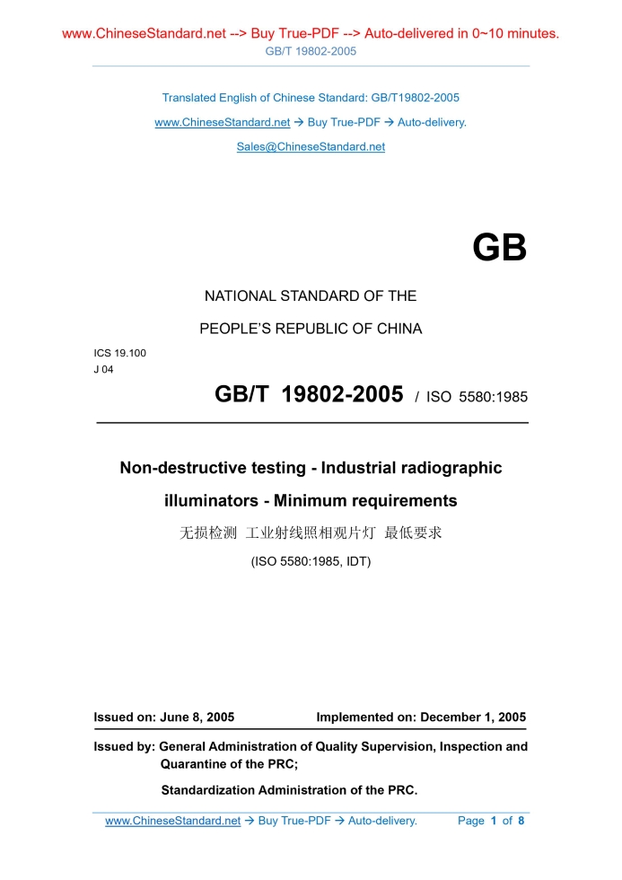GB/T 19802-2005: Non-destructive testing -- Industrial radiographic illuminators -- Minimum requirements Delivery: 9 seconds. True-PDF full-copy in English & invoice will be downloaded + auto-delivered via email. See step-by-step procedure Status: Valid
