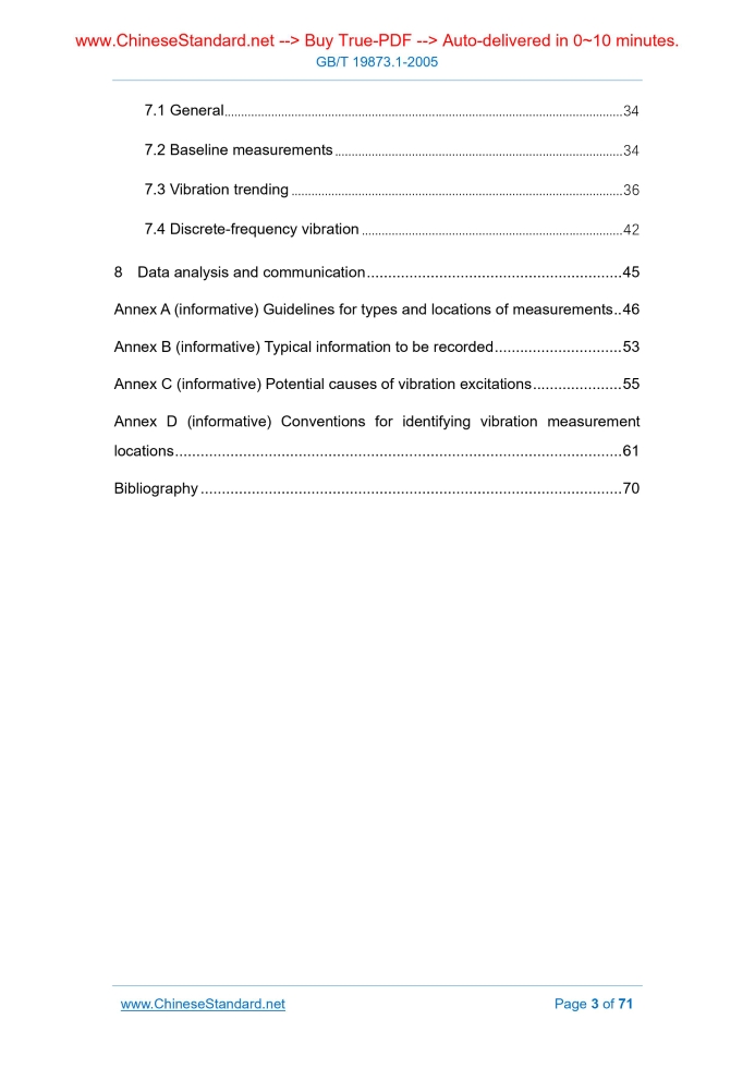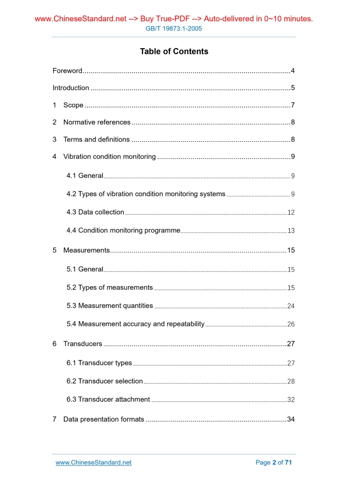 Similar standardsGB/T 19873.1-2005: Corrosion of Metals and Alloys -- Corrosion Test for Intergranular Corrosion Susceptibility of Low-Cr Ferritic Stainless Steel---This is an excerpt. Full copy of true-PDF in English version (including equations, symbols, images, flow-chart, tables, and figures etc.), auto-downloaded/delivered in 9 seconds, can be purchased online: https://www.ChineseStandard.net/PDF.aspx/GBT19873.1-2005 GB NATIONAL STANDARD OF THE PEOPLE’S REPUBLIC OF CHINA ICS 17.160 J 04 GB/T 19873.1-2005 / ISO 13373-1:2002 Condition monitoring and diagnostics of machines - Vibration condition monitoring – Part 1: General procedures (ISO 13373-1:2002, IDT) ISSUED ON: AUGUST 31, 2005 IMPLEMENTED ON: APRIL 1, 2001 Issued by: General Administration of Quality Supervision, Inspection and Quarantine of the People's Republic of China; Standardization Administration of the People's Republic of China. Table of ContentsForeword ... 4 Introduction ... 5 1 Scope ... 7 2 Normative references ... 8 3 Terms and definitions ... 8 4 Vibration condition monitoring ... 9 4.1 General ... 9 4.2 Types of vibration condition monitoring systems ... 9 4.3 Data collection ... 12 4.4 Condition monitoring programme ... 13 5 Measurements ... 15 5.1 General ... 15 5.2 Types of measurements ... 15 5.3 Measurement quantities ... 24 5.4 Measurement accuracy and repeatability ... 26 6 Transducers ... 27 6.1 Transducer types ... 27 6.2 Transducer selection ... 28 6.3 Transducer attachment ... 32 7 Data presentation formats ... 34 7.1 General ... 34 7.2 Baseline measurements ... 34 7.3 Vibration trending ... 36 7.4 Discrete-frequency vibration ... 42 8 Data analysis and communication ... 45 Annex A (informative) Guidelines for types and locations of measurements .. 46 Annex B (informative) Typical information to be recorded ... 53 Annex C (informative) Potential causes of vibration excitations ... 55 Annex D (informative) Conventions for identifying vibration measurement locations ... 61 Bibliography ... 70ForewordGB/T 19873 consists of the following 2 parts, under the general title “Condition monitoring and diagnostics of machines - Vibration condition monitoring”: - Part 1: General procedures; - Part 2: Data processing, analysis, diagnostics, display and general vibration. This Part is Part 1 of GB/T 19873 “Condition monitoring and diagnostics of machines - Vibration condition monitoring”. This Part identically adopts the International Standard ISO 13373-1:2002 “Condition monitoring and diagnostics of machines - Vibration condition monitoring - Part 1: General procedures” (English version). Attention is drawn to the possibility that some of the elements of this Part may be the subject of patent rights. Issuing organizations of this Part shall not be held responsible for identifying any or all such patent rights. Annexes A, B, C and D of this Part are informative annexes. This Part is proposed by China Machinery Industry Federation. This Part is under the jurisdiction of National Technical Committee on Mechanical Vibration and Shock of the Standardization Administration of China (SAC/TC 53). Drafting organizations of this Part: Zhengzhou Machinery Research Institute, Yangzi Petrochemical Corporation, Xi'an Thermal Engineering Research Institute Co., Ltd., Wuhan University of Technology. Main drafters of this Part: Jiang Yuanfeng, Song Yingjian, Zhang Xueyan, Wu Qing and Shi Yonghua. Condition monitoring and diagnostics of machines - Vibration condition monitoring – Part 1: General procedures1 ScopeThis Part provides general guidelines for the measurement and data collection functions of machinery vibration for condition monitoring. It is intended to promote consistency of measurement procedures and practices, which usually concentrate on rotating machines. Because of the diversity of approaches to condition monitoring, recommendations specific to a particular kind of monitoring programme will be addressed in additional Part. This Part is a basic document which presents recommendations of a general nature, encompassing - measurement methods, - measurement parameters, - transducer selection, - transducer location, - transducer attachment, - data collection, - machine operating conditions, - vibration monitoring systems, - signal conditioning systems, - interfaces with data-processing systems, - continuous monitoring, and - periodic monitoring. ......Source: Above contents are excerpted from the full-copy PDF -- translated/reviewed by: www.ChineseStandard.net / Wayne Zheng et al. Tips & Frequently Asked Questions:Question 1: How long will the true-PDF of English version of GB/T 19873.1-2005 be delivered?Answer: The full copy PDF of English version of GB/T 19873.1-2005 can be downloaded in 9 seconds, and it will also be emailed to you in 9 seconds (double mechanisms to ensure the delivery reliably), with PDF-invoice.Question 2: Can I share the purchased PDF of GB/T 19873.1-2005_English with my colleagues?Answer: Yes. The purchased PDF of GB/T 19873.1-2005_English will be deemed to be sold to your employer/organization who actually paid for it, including your colleagues and your employer's intranet.Question 3: Does the price include tax/VAT?Answer: Yes. Our tax invoice, downloaded/delivered in 9 seconds, includes all tax/VAT and complies with 100+ countries' tax regulations (tax exempted in 100+ countries) -- See Avoidance of Double Taxation Agreements (DTAs): List of DTAs signed between Singapore and 100+ countriesQuestion 4: Do you accept my currency other than USD?Answer: Yes. www.ChineseStandard.us -- GB/T 19873.1-2005 -- Click this link and select your country/currency to pay, the exact amount in your currency will be printed on the invoice. Full PDF will also be downloaded/emailed in 9 seconds.How to buy and download a true PDF of English version of GB/T 19873.1-2005?A step-by-step guide to download PDF of GB/T 19873.1-2005_EnglishStep 1: Visit website https://www.ChineseStandard.net (Pay in USD), 