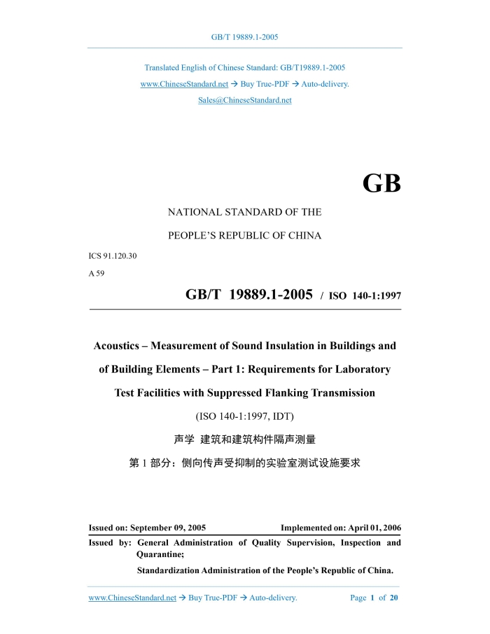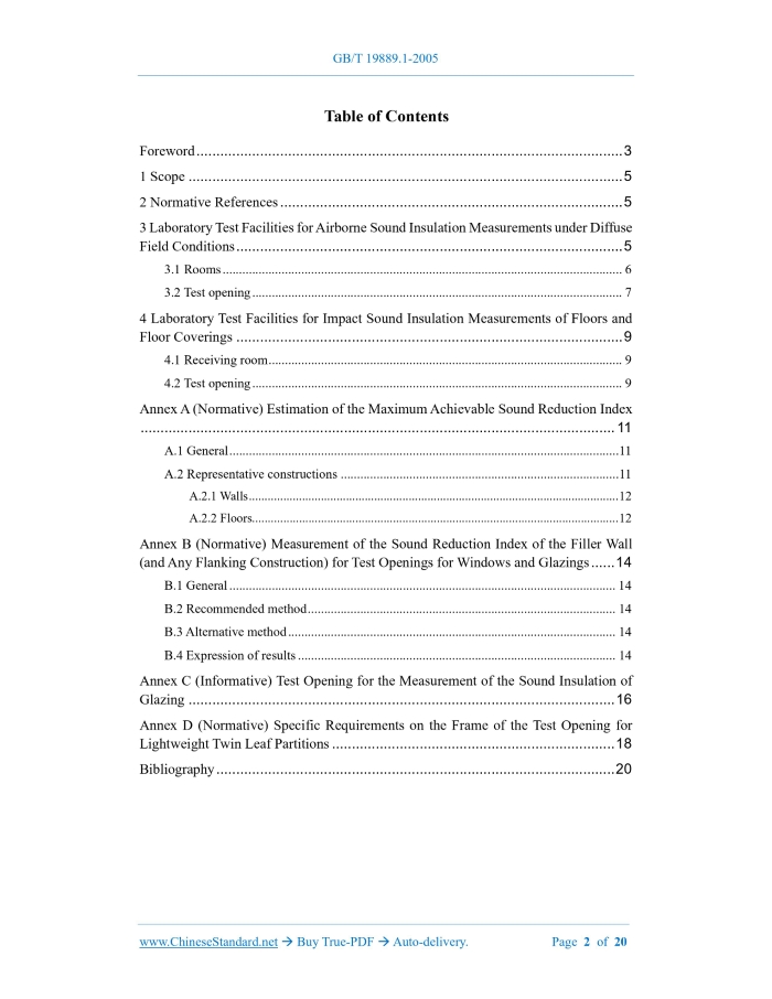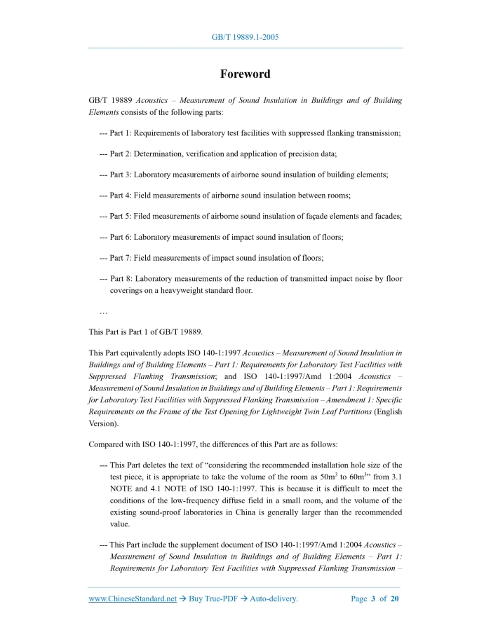 Similar standardsGB/T 19889.1-2005: Acoustics -- Measurement of sound insulation in buildings and of building elements -- Part 1: Requirements for laboratory test facilities with suppressed flanking transmission---This is an excerpt. Full copy of true-PDF in English version (including equations, symbols, images, flow-chart, tables, and figures etc.), auto-downloaded/delivered in 9 seconds, can be purchased online: https://www.ChineseStandard.net/PDF.aspx/GBT19889.1-2005 GB NATIONAL STANDARD OF THE PEOPLE’S REPUBLIC OF CHINA ICS 91.120.30 A 59 GB/T 19889.1-2005 / ISO 140-1:1997 Acoustics – Measurement of Sound Insulation in Buildings and of Building Elements – Part 1: Requirements for Laboratory Test Facilities with Suppressed Flanking Transmission (ISO 140-1:1997, IDT) ISSUED ON: SEPTEMBER 09, 2005 IMPLEMENTED ON: APRIL 01, 2006 Issued by: General Administration of Quality Supervision, Inspection and Quarantine; Standardization Administration of the People’s Republic of China. Table of ContentsForeword ... 3 1 Scope ... 5 2 Normative References ... 5 3 Laboratory Test Facilities for Airborne Sound Insulation Measurements under Diffuse Field Conditions ... 5 3.1 Rooms ... 6 3.2 Test opening ... 7 4 Laboratory Test Facilities for Impact Sound Insulation Measurements of Floors and Floor Coverings ... 9 4.1 Receiving room ... 9 4.2 Test opening ... 9 Annex A (Normative) Estimation of the Maximum Achievable Sound Reduction Index ... 11 A.1 General ... 11 A.2 Representative constructions ... 11 A.2.1 Walls ... 12 A.2.2 Floors... 12 Annex B (Normative) Measurement of the Sound Reduction Index of the Filler Wall (and Any Flanking Construction) for Test Openings for Windows and Glazings ... 14 B.1 General ... 14 B.2 Recommended method ... 14 B.3 Alternative method ... 14 B.4 Expression of results ... 14 Annex C (Informative) Test Opening for the Measurement of the Sound Insulation of Glazing ... 16 Annex D (Normative) Specific Requirements on the Frame of the Test Opening for Lightweight Twin Leaf Partitions ... 18 Bibliography ... 20ForewordGB/T 19889 Acoustics – Measurement of Sound Insulation in Buildings and of Building Elements consists of the following parts: --- Part 1: Requirements of laboratory test facilities with suppressed flanking transmission; --- Part 2: Determination, verification and application of precision data; --- Part 3: Laboratory measurements of airborne sound insulation of building elements; --- Part 4: Field measurements of airborne sound insulation between rooms; --- Part 5: Filed measurements of airborne sound insulation of façade elements and facades; --- Part 6: Laboratory measurements of impact sound insulation of floors; --- Part 7: Field measurements of impact sound insulation of floors; --- Part 8: Laboratory measurements of the reduction of transmitted impact noise by floor coverings on a heavyweight standard floor. This Part is Part 1 of GB/T 19889. This Part equivalently adopts ISO 140-1:1997 Acoustics – Measurement of Sound Insulation in Buildings and of Building Elements – Part 1: Requirements for Laboratory Test Facilities with Suppressed Flanking Transmission; and ISO 140-1:1997/Amd 1:2004 Acoustics – Measurement of Sound Insulation in Buildings and of Building Elements – Part 1: Requirements for Laboratory Test Facilities with Suppressed Flanking Transmission – Amendment 1: Specific Requirements on the Frame of the Test Opening for Lightweight Twin Leaf Partitions (English Version). Compared with ISO 140-1:1997, the differences of this Part are as follows: --- This Part deletes the text of “considering the recommended installation hole size of the test piece, it is appropriate to take the volume of the room as 50m3 to 60m3” from 3.1 NOTE and 4.1 NOTE of ISO 140-1:1997. This is because it is difficult to meet the conditions of the low-frequency diffuse field in a small room, and the volume of the existing sound-proof laboratories in China is generally larger than the recommended value. --- This Part include the supplement document of ISO 140-1:1997/Amd 1:2004 Acoustics – Measurement of Sound Insulation in Buildings and of Building Elements – Part 1: Requirements for Laboratory Test Facilities with Suppressed Flanking Transmission – Acoustics – Measurement of Sound Insulation in Buildings and of Building Elements – Part 1: Requirements for Laboratory Test Facilities with Suppressed Flanking Transmission1 ScopeThis Part lays down specifications concerning laboratory test facilities for sound insulation measurements of building elements. It applies to laboratory test facilities with suppressed radiation from flanking elements; and/ or structural isolation between source and receiving rooms.2 Normative ReferencesThe provisions in following documents become the provisions of this Part of GB/T 19889 through reference in this Standard. For dated references, the subsequent amendments (excluding corrigendum) or revisions do not apply to this Standard, however, parties who reach an agreement based on this Standard are encouraged to study if the latest versions of these documents are applicable. For undated references, the latest edition of the referenced document applies. GB/T 19889.3-2005 Acoustics - Measurement of sound insulation in buildings and of building elements - Part 3: Laboratory measurements of airborne sound insulation of building elements (ISO 140-3:1995, IDT) ISO 140-8:1997 Acoustics - Measurement of sound insulation in buildings and of building elements – Part 8: Laboratory measurements of the reduction of transmitted impact noise by floor coverings on a heavyweight standard floor 3 Laboratory Test Facilities for Airborne Sound Insulation Measurements under Diffuse Field Conditions The laboratory test facility consists of two adjacent reverberant rooms with a test opening between them in which the test specimen is inserted. types B and C, flanking includes paths Ff, Fd, and Df which are all influenced by the mass 