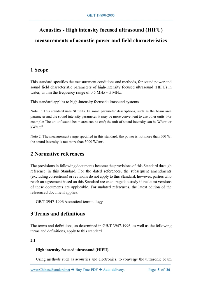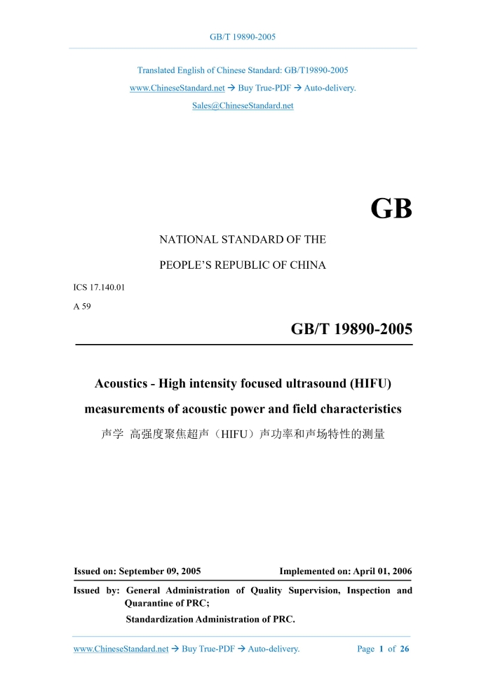 GB/T 19890-2005: Acoustics - High intensity focused ultrasound (HIFU) measurements of acoustic power and field characteristics Delivery: 9 seconds. True-PDF full-copy in English & invoice will be downloaded + auto-delivered via email. See step-by-step procedure Status: Valid
