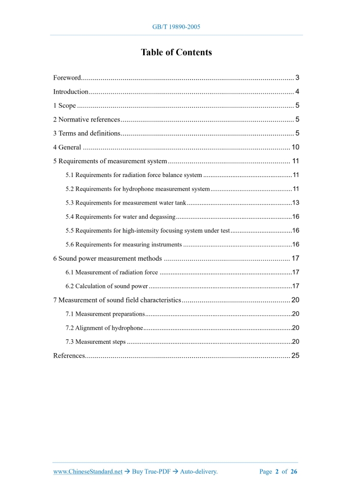 Similar standardsGB/T 19890-2005: Acoustics - High intensity focused ultrasound (HIFU) measurements of acoustic power and field characteristics---This is an excerpt. Full copy of true-PDF in English version (including equations, symbols, images, flow-chart, tables, and figures etc.), auto-downloaded/delivered in 9 seconds, can be purchased online: https://www.ChineseStandard.net/PDF.aspx/GBT19890-2005 NATIONAL STANDARD OF THE PEOPLE’S REPUBLIC OF CHINA ICS 17.140.01 A 59 Acoustics - High intensity focused ultrasound (HIFU) measurements of acoustic power and field characteristics ISSUED ON: SEPTEMBER 09, 2005 IMPLEMENTED ON: APRIL 01, 2006 Issued by: General Administration of Quality Supervision, Inspection and Quarantine of PRC; Standardization Administration of PRC. Table of ContentsForeword ... 3 Introduction ... 4 1 Scope ... 5 2 Normative references ... 5 3 Terms and definitions... 5 4 General ... 10 5 Requirements of measurement system ... 11 5.1 Requirements for radiation force balance system ... 11 5.2 Requirements for hydrophone measurement system ... 11 5.3 Requirements for measurement water tank ... 13 5.4 Requirements for water and degassing ... 16 5.5 Requirements for high-intensity focusing system under test ... 16 5.6 Requirements for measuring instruments ... 16 6 Sound power measurement methods ... 17 6.1 Measurement of radiation force ... 17 6.2 Calculation of sound power ... 17 7 Measurement of sound field characteristics ... 20 7.1 Measurement preparations ... 20 7.2 Alignment of hydrophone ... 20 7.3 Measurement steps ... 20 References ... 25 Acoustics - High intensity focused ultrasound (HIFU) measurements of acoustic power and field characteristics1 ScopeThis standard specifies the measurement conditions and methods, for sound power and sound field characteristic parameters of high-intensity focused ultrasound (HIFU) in water, within the frequency range of 0.5 MHz ~ 5 MHz. This standard applies to high-intensity focused ultrasound systems. Note 1: This standard uses SI units. In some parameter descriptions, such as the beam area parameter and the sound intensity parameter, it may be more convenient to use other units. For example: The unit of sound beam area can be cm2; the unit of sound intensity can be W/cm2 or kW/cm2. Note 2: The measurement range specified in this standard: the power is not more than 500 W; the sound intensity is not more than 5000 W/cm2.2 Normative referencesThe provisions in following documents become the provisions of this Standard through reference in this Standard. For the dated references, the subsequent amendments (excluding corrections) or revisions do not apply to this Standard; however, parties who reach an agreement based on this Standard are encouraged to study if the latest versions of these documents are applicable. For undated references, the latest edition of the referenced document applies. GB/T 3947-1996 Acoustical terminology3 Terms and definitionsThe terms and definitions, as determined in GB/T 3947-1996, as well as the following terms and definitions, apply to this standard. 3.1 High intensity focused ultrasound (HIFU) Using methods such as acoustics and electronics, to converge the ultrasonic beam5 Requirements of measurement system5.1 Requirements for radiation force balance system 5.1.1 Target requirements This standard recommends the use of an absorbing target: the sound pressure reflection coefficient is required to be ≤ 5%; the sound pressure transmission coefficient is less than 10%. The area of the target is large enough, that its diameter or minimum dimension is greater than 1.5 times the -26 dB beam width, in the intercepted plane. 5.1.2 Requirements for target support (or suspension) system The support of the target shall have sufficient stability; the horizontal displacement of the target during the measurement shall be small enough, to not affect the measurement results. Keep the target surface perpendicular to the beam axis. 5.1.3 Force measuring system The force measuring system can use an electronic balance or a force measuring sensor system. The measurement precision is required to be better than 10-3 N. 5.2 Requirements for hydrophone measurement system 5.2.1 Requirements for hydrophones 5.2.1.1 Requirements for hydrophone sensitivity The free-field voltage sensitivity, at the end of the hydrophone cable, is not less than 10 nV/Pa. 5.2.1.2 Bandwidth requirements for hydrophones The fluctuation of the hydrophone's sensitivity shall be within ±6 dB, when changing in the 2-octave range of the acoustic operating frequency. 5.2.1.3 Directivity requirements for hydrophones At the acoustic operating frequency, the main beam width of sound pressure -6 dB in the direction of the acoustic axis is ≥ 70°. 5.2.1.4 Determination of effective radius of hydrophone Measure θ-3 dB and θ-6 dB. Use formulas (2) and (3), to calculate α-3 dB and α-6 dB. Use formula (4), to calculate the arithmetic mean of the two, which is the effective radius α Figure 4 -- Configuration of the HIFU sound field with beam down, as measured by the hydrophone method 5.4 Requirements for water and degassing 5.4.1 Water quality requirements It is required to use purified water or tap water after purification. 5.4.2 Degassing requirements The water in the water tank must be degassed, to meet the requirement of oxygen content ≤ 4 mg/L. Note: The water after degassing shall be strictly prevented from shaking, stirring, spraying, or other operations, during the filling process, so as to avoid the re- dissolving of air causing the oxygen content to exceed the standard. 5.4.3 Water temperature requirements The water in the water tank is kept at (23 ± 3) °C. 5.5 Requirements for high-intensity focusing system under test 5.5.1 Requirements for the frequency stability of the high-intensity focusing system under test After preheating for 15 min, the frequency stability reaches 10-4/4 h. 5.5.2 Requirements for the electrical power stability of 