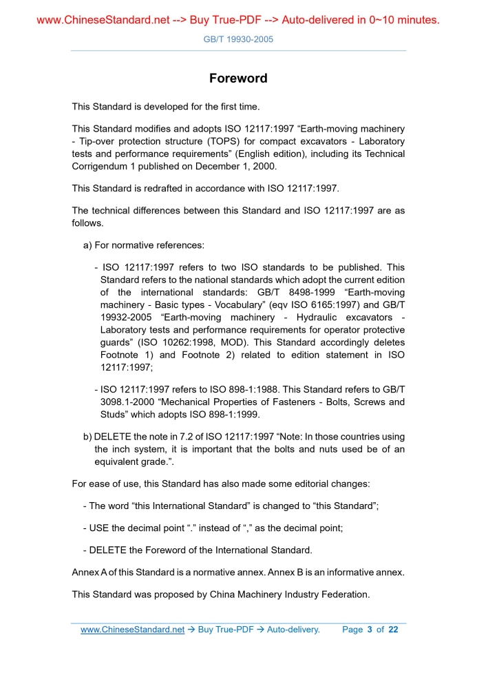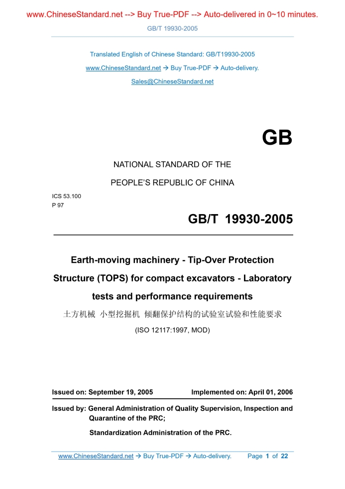 GB/T 19930-2005: Earth-moving machinery -- Tip-Over Protection Structure (TOPS) for compact excavators -- Laboratory tests and performance requirements Delivery: 9 seconds. True-PDF full-copy in English & invoice will be downloaded + auto-delivered via email. See step-by-step procedure Status: Valid