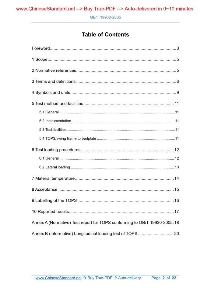 Similar standardsGB/T 19930-2005: Earth-moving machinery -- Tip-Over Protection Structure (TOPS) for compact excavators -- Laboratory tests and performance requirements---This is an excerpt. Full copy of true-PDF in English version (including equations, symbols, images, flow-chart, tables, and figures etc.), auto-downloaded/delivered in 9 seconds, can be purchased online: https://www.ChineseStandard.net/PDF.aspx/GBT19930-2005 GB NATIONAL STANDARD OF THE PEOPLE’S REPUBLIC OF CHINA ICS 53.100 P 97 Earth-moving machinery - Tip-Over Protection Structure (TOPS) for compact excavators - Laboratory tests and performance requirements (ISO 12117.1997, MOD) Issued on: SEPTEMBER 19, 2005 Implemented on: APRIL 01, 2006 Issued by. General Administration of Quality Supervision, Inspection and Quarantine of the PRC; Standardization Administration of the PRC. Table of ContentsForeword ... 3 1 Scope ... 5 2 Normative references ... 5 3 Terms and definitions ... 6 4 Symbols and units ... 9 5 Test method and facilities ... 11 5.1 General ... 11 5.2 Instrumentation ... 11 5.3 Test facilities ... 11 5.4 TOPS/swing frame to bedplate ... 11 6 Test loading procedures ... 12 6.1 General ... 12 6.2 Lateral loading ... 13 7 Material temperature ... 14 8 Acceptance ... 15 9 Labelling of the TOPS ... 16 10 Reported results ... 17 Annex A (Normative) Test report for TOPS conforming to GB/T 19930-2005 . 18 Annex B (Informative) Longitudinal loading test of TOPS ... 20ForewordThis Standard is developed for the first time. This Standard modifies and adopts ISO 12117.1997 “Earth-moving machinery - Tip-over protection structure (TOPS) for compact excavators - Laboratory tests and performance requirements” (English edition), including its Technical Corrigendum 1 published on December 1, 2000. This Standard is redrafted in accordance with ISO 12117.1997. The technical differences between this Standard and ISO 12117.1997 are as follows. a) For normative references. - ISO 12117.1997 refers to two ISO standards to be published. This Standard refers to the national standards which adopt the current edition of the international standards. GB/T 8498-1999 “Earth-moving machinery - Basic types - Vocabulary” (eqv ISO 6165.1997) and GB/T 19932-2005 “Earth-moving machinery - Hydraulic excavators - Laboratory tests and performance requirements for operator protective guards” (ISO 10262.1998, MOD). This Standard accordingly deletes Footnote 1) and Footnote 2) related to edition statement in ISO 12117.1997; - ISO 12117.1997 refers to ISO 898-1.1988. This Standard refers to GB/T 3098.1-2000 “Mechanical Properties of Fasteners - Bolts, Screws and Studs” which adopts ISO 898-1.1999. b) DELETE the note in 7.2 of ISO 12117.1997 “Note. In those countries using the inch system, it is important that the bolts and nuts used be of an equivalent grade.”. For ease of use, this Standard has also made some editorial changes. - The word “this International Standard” is changed to “this Standard”; - USE the decimal point “.” instead of “,” as the decimal point; - DELETE the Foreword of the International Standard. Annex A of this Standard is a normative annex. Annex B is an informative annex. This Standard was proposed by China Machinery Industry Federation. Earth-moving machinery - Tip-Over Protection Structure (TOPS) for compact excavators - Laboratory tests and performance requirements1 ScopeThis Standard establishes a consistent and reproducible means of evaluating the load-carrying characteristics of tip-over protective structures (TOPS) under static loading, and prescribes performance requirements of a representative specimen under such loading. This Standard applies to TOPS of compact excavators (as defined in GB/T 8498) with swing type boom, having an operating mass of 1000 kg~6000 kg.2 Normative referencesThe following documents contain the provisions which, through reference in this Standard, become the provisions of this Standard. For the dated references, their subsequent amendments (excluding corrections) or revisions do not apply to this Standard. However, the parties who enter into agreement based on this Standard are encouraged to investigate whether the latest editions of these documents are applicable. For undated reference documents, the latest editions apply to this Standard. GB/T 229 Metallic Materials - Charpy Pendulum Impact Test Method (GB/T 229-1994, eqv ISO 148.1983) GB/T 3098.1 Mechanical Properties of Fasteners - Bolts, Screws and Studs (GB/T 3098.1-2000, idt ISO 898-1.1999) GB/T 3098.2 Mechanical properties of fasteners - Nuts - Coarse thread (GB/T 3098.2-2000, idt ISO 898-2.1992) GB/T 6572.1-1997 Hydraulic excavators - Terminology (eqv ISO 7135.1993) GB/T 8498 Earth-moving machinery - Basic types - Vocabulary (GB/T 8498- 1999, eqv ISO 6165.1997) GB/T 17772-1999 Earth-moving machinery - Laboratory evaluations of protective structures - Specifications for deflection-limiting volume (idt ISO 3164.1995) GB/T 17921-1999 Earth-moving machinery - Seat belts and seat belt anchorages (idt ISO 6683.1981) GB/T 19932 Earth-moving machinery - Hydraulic excavators - Laboratory tests and performance requirements for operator protective guards (GB/T 19932-2005, ISO 10262.1998, MOD) JB/T 7690 Engineering machinery - Unit and measurement accuracy for dimension and performance (JB/T 7690-1995, eqv ISO 9248.1992)3 Terms and definitionsThe following terms and definitions apply to this Standard. 3.1 Tip-over protective structure (TOPS) System of structural members whose primary purpose is to reduce the possibility of an operator, held by a seat belt system (3.5), being crushed should a machine tip-over. Note. Structural members include any subframe, bracket, mounting, socket, bolt, pin, suspension, flexible shock absorber used to secure the system to the swing frame; but exclude mounting provisions that are integral with the swing frame. 3.1.1 Cabin type TOPS TOPS for machines with a cabin. 3.1.2 Canopy type 