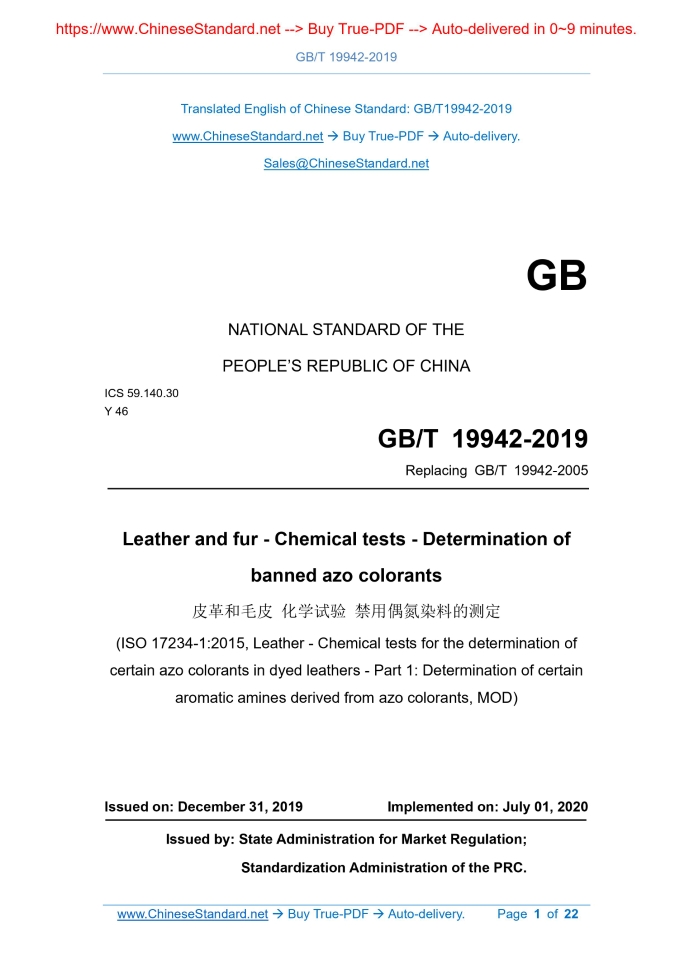 GB/T 19942-2019: Leather and fur - Chemical tests - Determination of banned azo colorants Delivery: 9 seconds. True-PDF full-copy in English & invoice will be downloaded + auto-delivered via email. See step-by-step procedure Status: Valid GB/T 19942: Historical versions