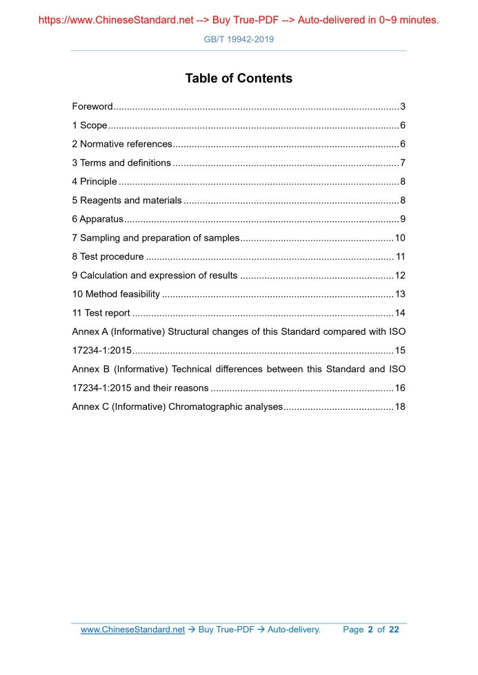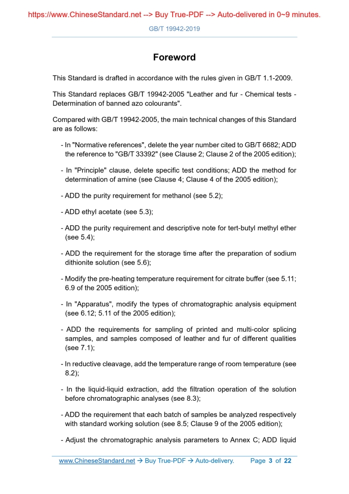 Similar standardsGB/T 19942-2019: Leather and fur - Chemical tests - Determination of banned azo colorants---This is an excerpt. Full copy of true-PDF in English version (including equations, symbols, images, flow-chart, tables, and figures etc.), auto-downloaded/delivered in 9 seconds, can be purchased online: https://www.ChineseStandard.net/PDF.aspx/GBT19942-2019GB NATIONAL STANDARD OF THE PEOPLE’S REPUBLIC OF CHINA ICS 59.140.30 Y 46 Replacing GB/T 19942-2005 Leather and fur - Chemical tests - Determination of banned azo colorants (ISO 17234-1.2015, Leather - Chemical tests for the determination of certain azo colorants in dyed leathers - Part 1.Determination of certain aromatic amines derived from azo colorants, MOD) Issued on. DECEMBER 31, 2019 Implemented on. JULY 01, 2020 Issued by. State Administration for Market Regulation; Standardization Administration of the PRC. Table of ContentsForeword... 3 1 Scope... 6 2 Normative references... 6 3 Terms and definitions... 7 4 Principle... 8 5 Reagents and materials... 8 6 Apparatus... 9 7 Sampling and preparation of samples... 10 8 Test procedure... 11 9 Calculation and expression of results... 12 10 Method feasibility... 13 11 Test report... 14 Annex A (Informative) Structural changes of this Standard compared with ISO 17234-1.2015... 15 Annex B (Informative) Technical differences between this Standard and ISO 17234-1.2015 and their reasons... 16 Annex C (Informative) Chromatographic analyses... 18ForewordThis Standard is drafted in accordance with the rules given in GB/T 1.1-2009. This Standard replaces GB/T 19942-2005 "Leather and fur - Chemical tests - Determination of banned azo colourants". Compared with GB/T 19942-2005, the main technical changes of this Standard are as follows. - In "Normative references", delete the year number cited to GB/T 6682; ADD the reference to "GB/T 33392" (see Clause 2; Clause 2 of the 2005 edition); - In "Principle" clause, delete specific test conditions; ADD the method for determination of amine (see Clause 4; Clause 4 of the 2005 edition); - ADD the purity requirement for methanol (see 5.2); - ADD ethyl acetate (see 5.3); - ADD the purity requirement and descriptive note for tert-butyl methyl ether (see 5.4); - ADD the requirement for the storage time after the preparation of sodium dithionite solution (see 5.6); - Modify the pre-heating temperature requirement for citrate buffer (see 5.11; 6.9 of the 2005 edition); - In "Apparatus", modify the types of chromatographic analysis equipment (see 6.12; 5.11 of the 2005 edition); - ADD the requirements for sampling of printed and multi-color splicing samples, and samples composed of leather and fur of different qualities (see 7.1); - In reductive cleavage, add the temperature range of room temperature (see 8.2); - In the liquid-liquid extraction, add the filtration operation of the solution before chromatographic analyses (see 8.3); - ADD the requirement that each batch of samples be analyzed respectively with standard working solution (see 8.5; Clause 9 of the 2005 edition); - Adjust the chromatographic analysis parameters to Annex C; ADD liquid chromatographic parameters (see Annex C; 10.1 of the 2005 edition); - Modify the symbols in the calculation formula (see Clause 9; Clause 11 of the 2005 edition); - Adjust "Method feasibility" to Clause 10; ADD descriptions of aromatic amines numbered 5, 6 and 22 (see Clause 10; 8.4 of the 2005 edition); - Modify the content of test report (see Clause 11; Clause 12 of the 2005 edition). This Standard uses the redraft law to modify and adopt ISO 17234-1.2015 "Leather - Chemical tests for the determination of certain azo colorants in dyed leathers - Part 1.Determination of certain aromatic amines derived from azo colorants". Compared with ISO 17234-1.2015, this Standard has many adjustments in structure. Annex A lists the comparison table for clause-subclause number of this Standard and ISO 17234-1.2015. Compared with ISO 17234-1.2015, this Standard has technical differences. Annex B gives a list of corresponding technical differences and their reasons. For ease of use, this Standard has also made the following editorial changes. - CHANGE the standard name to "Leather and fur - Chemical tests - Determination of banned azo colorants"; - Delete the example of the material model in the note of ISO 17234-1.2015 "6.5 Extraction column"; ADD the note that commodity columns can be purchased; - ADD a note to ISO 17234-1.2015 "7.2 Tert-butyl methyl ether"; - ADD a note "the content exceeds 30 mg/kg; then the sample is deemed to have used banned azo colorants during processing and treatment" to 9.2; - ADD the GC/MS total ion chromatogram of aromatic amine standard substance to ISO 17234-1.2015, Annex A; - Delete Annex B and Annex C in ISO 17234-1.2015. This Standard was proposed by China National Light Industry Council. This Standard shall be under the jurisdiction of National Technical Committee 252 on Leather Industry of Standardization Administration of China (SAC/TC 252). Drafting organizations of this Standard. Jiaxing Fur and Footwear Industry Research Institute, Chongqing Testing and Certification (Group) Co., Ltd., State Center of Supervision and Test for Leather (Zhejiang), Guangzhou Quality Supervision and Testing Institute, Jihua 3514 Leather and Footware Co., Ltd., Sungoal (Dongguan) Advanced Materials Tech Co., Ltd., Saturday Co., Ltd. Main drafters of this Standard. Jiang Sujie, Zhang Li, Shen Yun, Zhong Xihao, Huo Jianchun, Li Xiaolong, Zeng Hao, Sun Dong, Li Li, Zhao Xiangxu. The previous editions of the standard replaced by this Standard were released as follows. - GB/T 19942-2005. Leather and fur - Chemical tests - Determination of banned azo colorants WARNING - The personnel using this Standard shall have practical experience in regular laboratory work. The aromatic amines are classified as substances known to be or suspected to be human carcinogens. This Standard does not point out all possible safety 