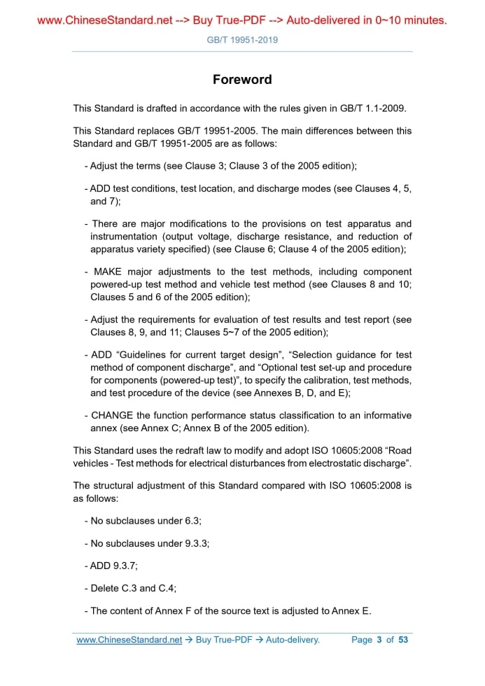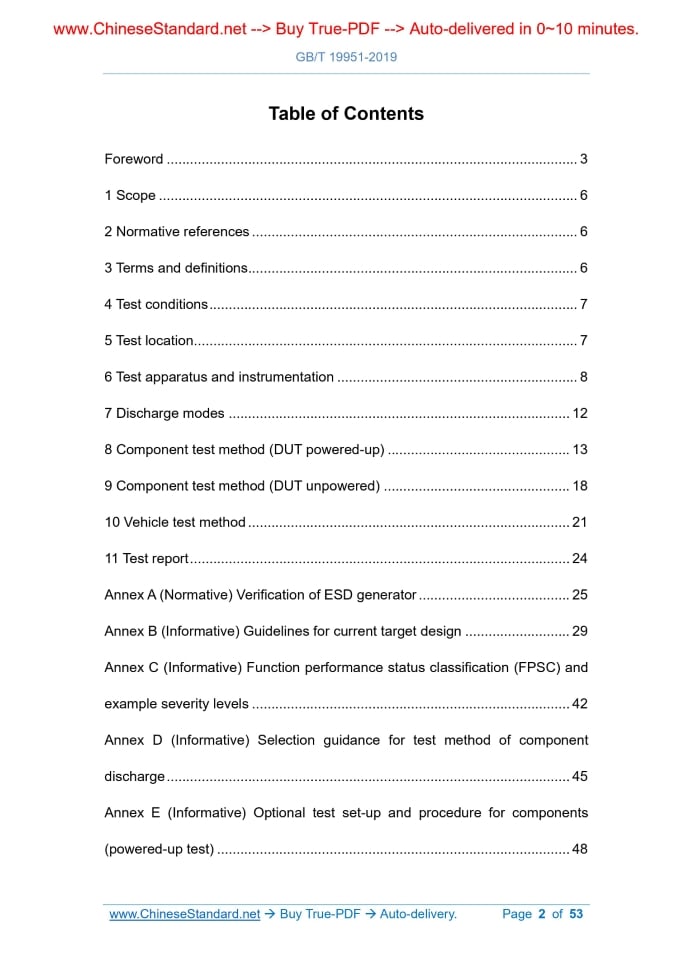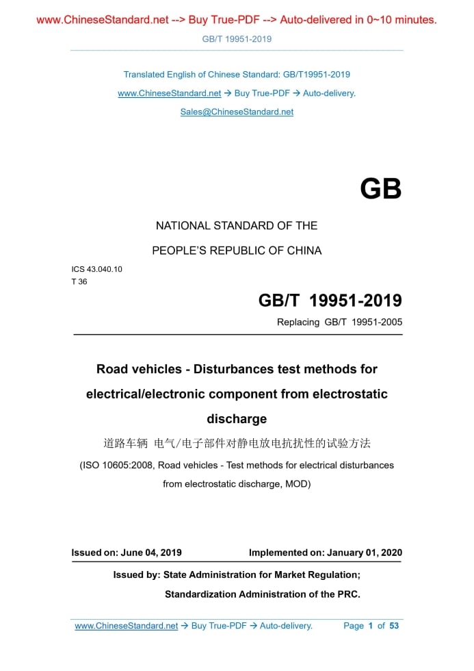 Similar standardsGB/T 19951-2019: Road vehicles - Disturbances test methods for electrical/electronic component from electrostatic discharge---This is an excerpt. Full copy of true-PDF in English version (including equations, symbols, images, flow-chart, tables, and figures etc.), auto-downloaded/delivered in 9 seconds, can be purchased online: https://www.ChineseStandard.net/PDF.aspx/GBT19951-2019 NATIONAL STANDARD OF THE PEOPLE’S REPUBLIC OF CHINA ICS 43.040.10 T 36 Replacing GB/T 19951-2005 Road vehicles - Disturbances test methods for electrical/electronic component from electrostatic discharge (ISO 10605.2008, Road vehicles - Test methods for electrical disturbances from electrostatic discharge, MOD) Issued on. JUNE 04, 2019 Implemented on. JANUARY 01, 2020 Issued by. State Administration for Market Regulation; Standardization Administration of the PRC. Table of ContentsForeword... 3 1 Scope... 6 2 Normative references... 6 3 Terms and definitions... 6 4 Test conditions... 7 5 Test location... 7 6 Test apparatus and instrumentation... 8 7 Discharge modes... 12 8 Component test method... 13 9 Component test method... 18 10 Vehicle test method... 21 11 Test report... 24 Annex A (Normative) Verification of ESD generator... 25 Annex B (Informative) Guidelines for current target design... 29 Annex C (Informative) Function performance status classification and example severity levels... 42 Annex D (Informative) Selection guidance for test method of component discharge... 45 Annex E (Informative) Optional test set-up and procedure for components... 48ForewordThis Standard is drafted in accordance with the rules given in GB/T 1.1-2009. This Standard replaces GB/T 19951-2005.The main differences between this Standard and GB/T 19951-2005 are as follows. - Adjust the terms (see Clause 3; Clause 3 of the 2005 edition); - ADD test conditions, test location, and discharge modes (see Clauses 4, 5, and 7); - There are major modifications to the provisions on test apparatus and instrumentation (output voltage, discharge resistance, and reduction of apparatus variety specified) (see Clause 6; Clause 4 of the 2005 edition); - MAKE major adjustments to the test methods, including component powered-up test method and vehicle test method (see Clauses 8 and 10; Clauses 5 and 6 of the 2005 edition); - Adjust the requirements for evaluation of test results and test report (see Clauses 8, 9, and 11; Clauses 5~7 of the 2005 edition); - ADD “Guidelines for current target design”, “Selection guidance for test method of component discharge”, and “Optional test set-up and procedure for components (powered-up test)”, to specify the calibration, test methods, and test procedure of the device (see Annexes B, D, and E); - CHANGE the function performance status classification to an informative annex (see Annex C; Annex B of the 2005 edition). This Standard uses the redraft law to modify and adopt ISO 10605.2008 “Road vehicles - Test methods for electrical disturbances from electrostatic discharge”. The structural adjustment of this Standard compared with ISO 10605.2008 is as follows. - No subclauses under 6.3; - No subclauses under 9.3.3; - ADD 9.3.7; - Delete C.3 and C.4; - The content of Annex F of the source text is adjusted to Annex E. There are technical differences between this Standard and ISO 10605.2008. The clauses involved in these differences have been marked by a vertical single line (|) at the blank of the outer margin. The technical differences between this Standard and ISO 10605.2008 and their reasons are as follows. - About normative references, this Standard has made adjustments with technical differences, to adapt to the technical conditions of China. The adjustments are reflected in Clause 2 “Normative references”, as follows. Delete ISO 7637-1 and ISO 11452-1; ADD a reference to GB/T 29259-2012. - GB/T 29259-2012 has included the terms of electrostatic discharge, human ESD model, reference plane, and electrostatic discharge simulator (generator), so delete the 3.5, 3.6, 3.7, and 3.10 contents of the source text. - In order to clearly describe the contact discharge current waveform, and to facilitate understanding of the meanings of t1 and t2 in Table 2, with reference to the relevant standard, below Table 2, ADD Figure 3 “Schematic diagram for contact discharge mode waveform parameters”. The subsequent figure numbers change in order. - ADD the functional requirements after component test, as post-test result judgement, see 9.3.7. - The 6.3.2 content of the source text is unnecessary statement, and is easy to cause misunderstanding, so it is deleted. This Standard makes the following editorial changes. - Modify the standard name; - INCORPORATE the amendments of ISO 10605.2008/Amd 1.2014 and ISO 10605.2008/Cor. 1.2010.The clauses involved in these amendments have been marked by a vertical double line (ǁ) at the blank of the outer margin; - For ease of understanding, GIVE a note to the current/test voltage (A/kV) in Table 2; - The description of test voltage in 8.4.5 of the source text is the same as that in 8.3.6.This Standard does not repeat the description but refers to 8.3.6 instead. 9.3.3, 9.3.4, 9.3.5, 9.3.6, 10.3.3 are all treated in this way; - Delete the comment for “1” in Figure B.1c) “Cut side view” in Annex B of the source text and change “1” to “M3 screw hole”; - In order to maintain the unification of expression and understanding of function performance status classification (FPSC) between several standards of electromagnetic immunity series, the content of function performance status classification (FPSC) of Annex C is directly referred to GB/T 33014.1; - The source text’s Annex E “Rationale for air discharge generator verification” is not directly related to the technical requirements and test methods of the standard, and the drafting is extremely non-standard and so deleted. This Standard was proposed by Ministry of Industry and Informa