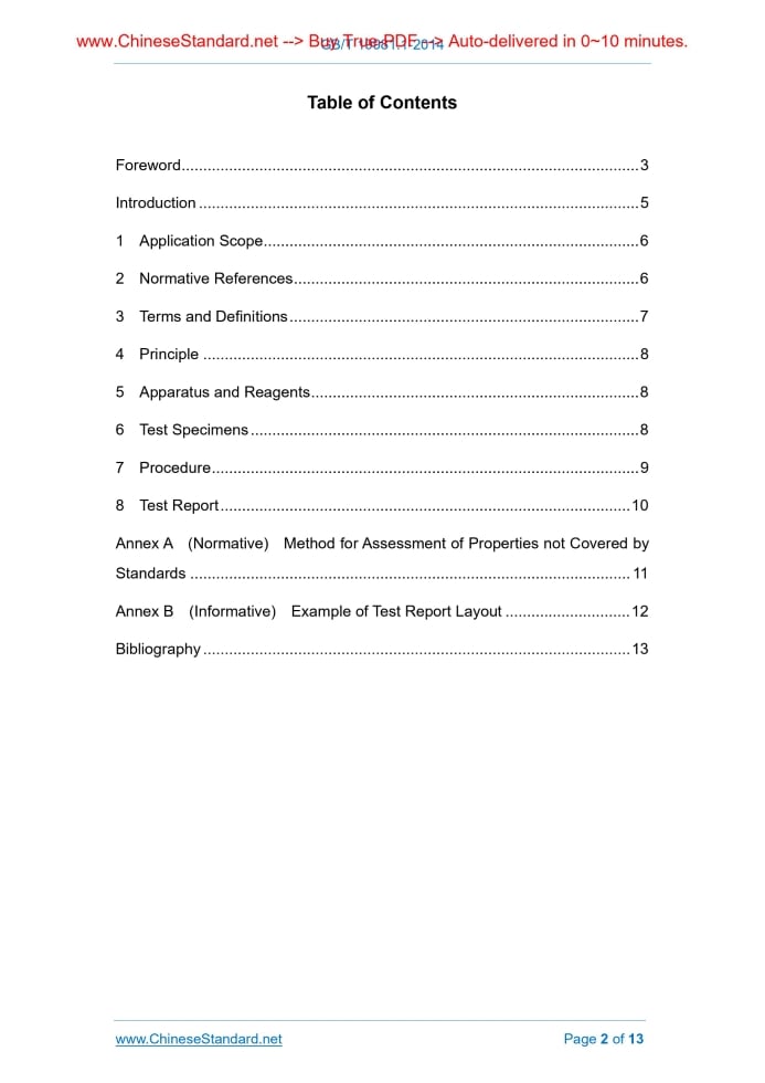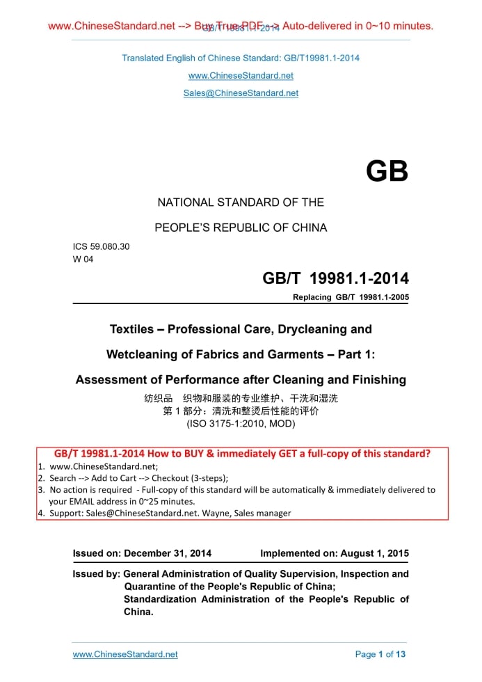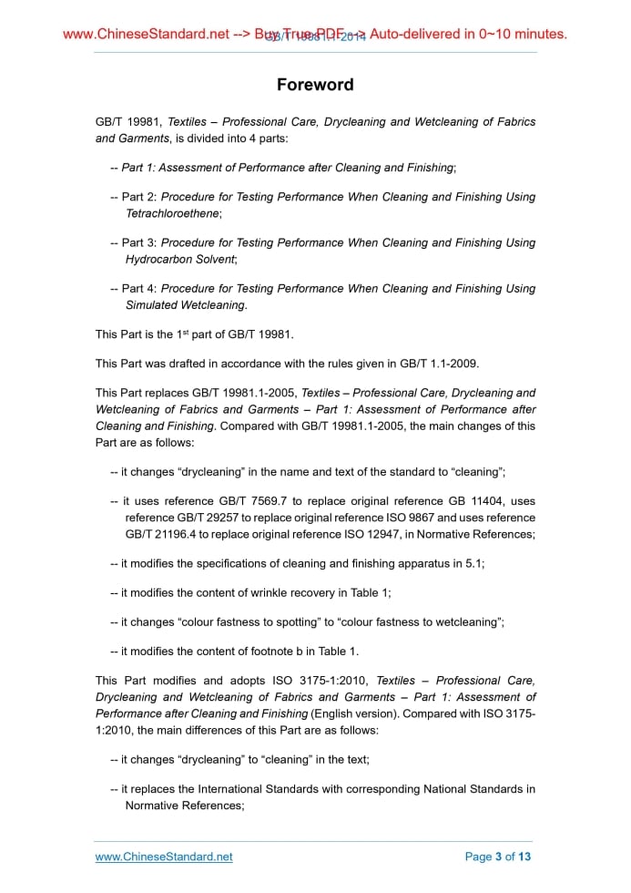 Similar standardsGB/T 19981.1-2014: Textiles -- Professional care, dry cleaning and wet cleaning of fabrics and garments -- Part 1: Assessment of performance after dry cleaning finishing---This is an excerpt. Full copy of true-PDF in English version (including equations, symbols, images, flow-chart, tables, and figures etc.), auto-downloaded/delivered in 9 seconds, can be purchased online: https://www.ChineseStandard.net/PDF.aspx/GBT19981.1-2014 GB NATIONAL STANDARD OF THE PEOPLE’S REPUBLIC OF CHINA ICS 59.080.30 W 04 Replacing GB/T 19981.1-2005 Textiles – Professional Care, Drycleaning and Wetcleaning of Fabrics and Garments – Part 1. Assessment of Performance after Cleaning and Finishing (ISO 3175-1.2010, MOD) Issued on: DECEMBER 31, 2014 Implemented on: AUGUST 1, 2015 Issued by. General Administration of Quality Supervision, Inspection and Quarantine of the People's Republic of China; Standardization Administration of the People's Republic of China. Table of ContentsForeword ... 3 Introduction ... 5 1 Application Scope ... 6 2 Normative References ... 6 3 Terms and Definitions ... 7 4 Principle ... 8 5 Apparatus and Reagents ... 8 6 Test Specimens ... 8 7 Procedure ... 9 8 Test Report ... 10 Annex A (Normative) Method for Assessment of Properties not Covered by Standards ... 11 Annex B (Informative) Example of Test Report Layout ... 12 Bibliography ... 13ForewordGB/T 19981, Textiles – Professional Care, Drycleaning and Wetcleaning of Fabrics and Garments, is divided into 4 parts. -- Part 1. Assessment of Performance after Cleaning and Finishing; -- Part 2. Procedure for Testing Performance When Cleaning and Finishing Using Tetrachloroethene; -- Part 3. Procedure for Testing Performance When Cleaning and Finishing Using Hydrocarbon Solvent; -- Part 4. Procedure for Testing Performance When Cleaning and Finishing Using Simulated Wetcleaning. This Part is the 1st part of GB/T 19981. This Part was drafted in accordance with the rules given in GB/T 1.1-2009. This Part replaces GB/T 19981.1-2005, Textiles – Professional Care, Drycleaning and Wetcleaning of Fabrics and Garments – Part 1. Assessment of Performance after Cleaning and Finishing. Compared with GB/T 19981.1-2005, the main changes of this Part are as follows. -- it changes “drycleaning” in the name and text of the standard to “cleaning”; -- it uses reference GB/T 7569.7 to replace original reference GB 11404, uses reference GB/T 29257 to replace original reference ISO 9867 and uses reference GB/T 21196.4 to replace original reference ISO 12947, in Normative References; -- it modifies the specifications of cleaning and finishing apparatus in 5.1; -- it modifies the content of wrinkle recovery in Table 1; -- it changes “colour fastness to spotting” to “colour fastness to wetcleaning”; -- it modifies the content of footnote b in Table 1. This Part modifies and adopts ISO 3175-1.2010, Textiles – Professional Care, Drycleaning and Wetcleaning of Fabrics and Garments – Part 1. Assessment of Performance after Cleaning and Finishing (English version). Compared with ISO 3175- 1.2010, the main differences of this Part are as follows. -- it changes “drycleaning” to “cleaning” in the text; -- it replaces the International Standards with corresponding National Standards in Normative References; Textiles – Professional Care, Drycleaning and Wetcleaning of Fabrics and Garments – Part 1. Assessment of Performance after Cleaning and Finishing1 Application ScopeThis part of GB/T 19981 specifies a method for assessing textile articles which have been tested according to GB/T 19981. Fabric and garment properties, which can change on cleaning and finishing, are identified and methods for assessing change using this part are given as appropriate. Other properties which are also important, but for which there are no Standards providing methods of assessment, are indicated in Annex A, together with advice on how to proceed on their assessment.2 Normative ReferencesThe following referenced documents are indispensable for the application of this document. For dated references, only the edition cited applies. For undated references, the latest edition of the referenced document (including any amendments) applies. GB/T 250, Textiles – Tests for Colour Fastness – Grey Scale for Assessing Change in Colour (GB/T 250-2008, ISO 105-A02.1993, IDT) GB/T 251, Textiles – Tests for Colour Fastness – Grey Scale for Assessing Staining (GB/T 251-2008, ISO 105-A03.1993, IDT) GB/T 4745, Textiles – Determination of Resistance to Surface Wetting of Fabrics – Spray Test (GB/T 4745-2012, ISO 4920.2012, MOD) GB/T 5711, Textiles – Tests for Colour Fastness – Colour Fastness to Dry-Cleaning (GB/T 5711-1997, eqv ISO 105-D01.1993) GB/T 6529, Textiles – Standard Atmospheres for Conditioning and Testing (GB/T 6529-2008, ISO 139.2005, MOD) GB/T 7568.7, Textiles – Tests for colour fastness – Standard adjacent fabrics – Part 7. Multifibre (GB/T 7568.7-2008, ISO 105-F10.1989, MOD) GB/T 8628, Textiles – Preparation, Marking and Measuring of Fabric Specimens and Garments in Tests for Determination of Dimensional Change (GB/T 8628-2013, ISO 3759.2011, MOD) GB/T 12490, Textiles – Tests for Colour Fastness – Colour Fastness to Domestic and Commercial Laundering (GB/T 12490, ISO 105-C06.2010, MOD) GB/T 13769, Textiles – Test Method for Assessing the Smoothness Appearance of Fabrics after Cleansing (GB/T 13769-2009, ISO 7768.2006, MOD) GB/T 13770, Textiles – Test Method for Assessing the Appearance of Creases in Fabrics after Cleansing (GB/T 13770-2009, ISO 7769.2006, MOD) GB/T 13771, Textiles – Test Method for Assessing the Smoothness Appearance of Seams in Fabrics after Cleansing (GB/T 13771-2009, ISO 7770.2006, MOD) GB/T 19881.2, Textiles – Professional Care, Drycleaning and Wetcleaning of Fabrics and Garments – Part 2. Procedure for Testing Performance When Cleaning and Finishing Using Tetrachloroethene (GB/