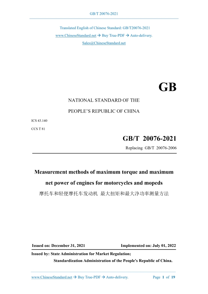 GB/T 20076-2021: Measurement methods of maximum torque and maximum net power of engines for motorcycles and mopeds Delivery: 9 seconds. True-PDF full-copy in English & invoice will be downloaded + auto-delivered via email. See step-by-step procedure Status: Valid GB/T 20076: Historical versions