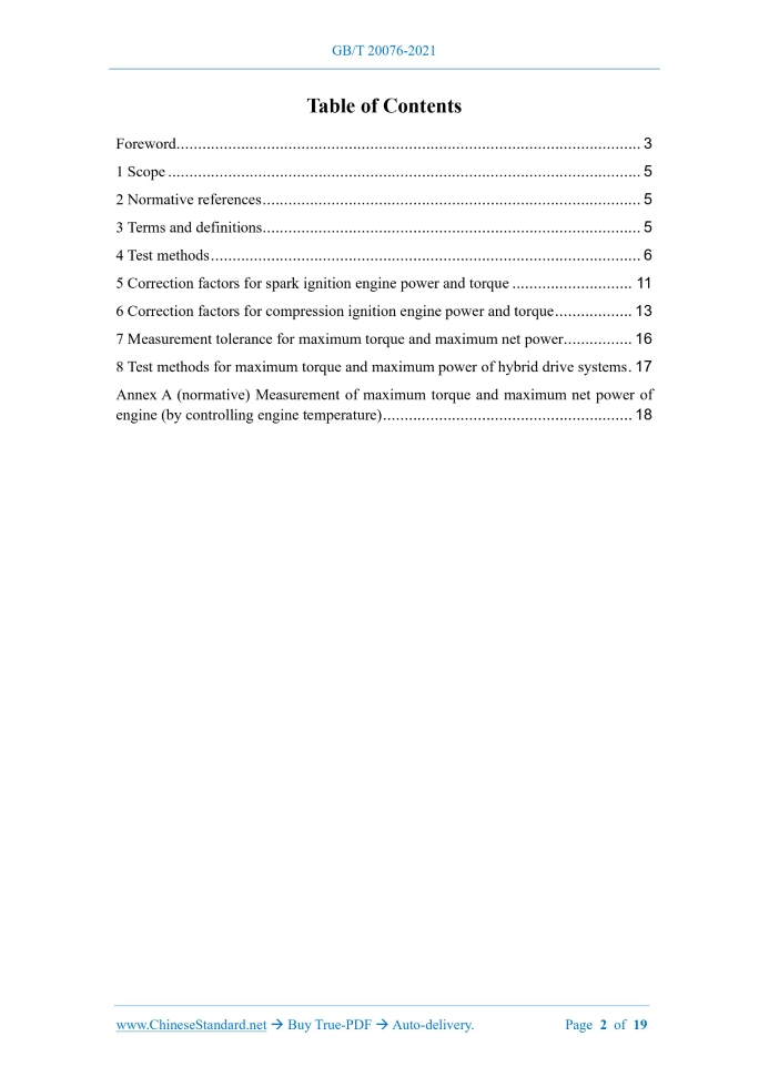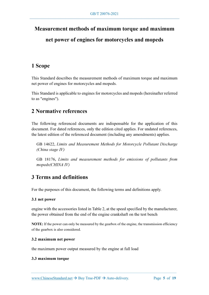Similar standardsGB/T 20076-2021: Measurement methods of maximum torque and maximum net power of engines for motorcycles and mopeds---This is an excerpt. Full copy of true-PDF in English version (including equations, symbols, images, flow-chart, tables, and figures etc.), auto-downloaded/delivered in 9 seconds, can be purchased online: https://www.ChineseStandard.net/PDF.aspx/GBT20076-2021 NATIONAL STANDARD OF THE PEOPLE’S REPUBLIC OF CHINA ICS 43.140 CCS T 81 Replacing GB/T 20076-2006 Measurement methods of maximum torque and maximum net power of engines for motorcycles and mopeds ISSUED ON: DECEMBER 31, 2021 IMPLEMENTED ON: JULY 01, 2022 Issued by: State Administration for Market Regulation; Standardization Administration of the People's Republic of China. Table of ContentsForeword ... 3 1 Scope ... 5 2 Normative references ... 5 3 Terms and definitions... 5 4 Test methods ... 6 5 Correction factors for spark ignition engine power and torque ... 11 6 Correction factors for compression ignition engine power and torque ... 13 7 Measurement tolerance for maximum torque and maximum net power ... 16 8 Test methods for maximum torque and maximum power of hybrid drive systems . 17 Annex A (normative) Measurement of maximum torque and maximum net power of engine (by controlling engine temperature) ... 18 Measurement methods of maximum torque and maximum net power of engines for motorcycles and mopeds1 ScopeThis Standard describes the measurement methods of maximum torque and maximum net power of engines for motorcycles and mopeds. This Standard is applicable to engines for motorcycles and mopeds (hereinafter referred to as "engines").2 Normative referencesThe following referenced documents are indispensable for the application of this document. For dated references, only the edition cited applies. For undated references, the latest edition of the referenced document (including any amendments) applies. GB 14622, Limits and Measurement Methods for Motorcycle Pollutant Discharge (China stage IV) GB 18176, Limits and measurement methods for emissions of pollutants from mopeds(CHINA IV)3 Terms and definitionsFor the purposes of this document, the following terms and definitions apply. 3.1 net power engine with the accessories listed in Table 2, at the speed specified by the manufacturer, the power obtained from the end of the engine crankshaft on the test bench NOTE: If the power can only be measured by the gearbox of the engine, the transmission efficiency of the gearbox is also considered. 3.2 maximum net power the maximum power output measured by the engine at full load 3.3 maximum torque 2) If V2< 120km/h and/or ϕ< 0.25m2, the minimum test conditions cannot be met. The test stand cooling system shall be improved. In this case, the test shall be carried out in accordance with the method in Annex A and approved by the manufacturer. The method specified in this clause is not used for the moped engines and compression ignition engines. 4.3.5 The engine intake air temperature (ambient air) shall be measured within 0.15m of the front end of the air filter intake direction. If there is no air filter, measure within 0.15m from the air inlet. Thermometers and thermocouples are protected against radiation and fuel vapors and inserted directly into the air flow. To obtain a representative average intake air temperature, an appropriate number of measurement points shall be set. 4.3.6 The torque, speed and temperature shall remain stable for at least 30s before starting the measurement. 4.3.7 The speed variation of each measurement point of spark ignition engine for mopeds shall not exceed ±2%. The deviation between the measured speed of the motorcycle engine and the selected speed shall not exceed ±1% or ±10r/min. Take the higher of the two. 4.3.8 Dynamometer load and intake air temperature shall be recorded simultaneously. Its value shall be the average of two stable recordings taken consecutively. The difference between the two values of the dynamometer load shall not exceed 2%. 4.3.9 The coolant temperature at the engine coolant outlet shall be maintained within ±5K of the upper limit temperature of the thermostat given by the manufacturer. If there is no factory given value, the temperature is 353K ± 5K. For air-cooled engines, the temperature at the manufacturer's specified point shall be maintained between of the maximum manufacturer's specified temperature under standard conditions. 4.3.10 The fuel temperature shall be measured at the carburetor inlet or the fuel injection system inlet and the fuel consumption meter. Its value shall be within the range given by the manufacturer. 4.3.11 The lube oil temperature shall be measured at the crankcase or oil cooler outlet. Its value shall be within the range given by the manufacturer. 4.3.12 The compression ignition engine temperature shall be maintained within the limits of 4.3.8 ~ 4.3.10, otherwise an additional adjustment device shall be used. 4.3.13 The exhaust temperature shall be measured at an angle perpendicular to the airflow at the exhaust manifold, exhaust manifold, or exhaust pipe vent. 4.3.14 If an automatic trigger device is used to measure speed and fuel consumption, the measurement duration is at least 10s. If using manual device, the duration is at least 20s. 4.3.15 During the type test, the reference fuel that meets the requirements of GB 14622 and GB 18176 shall be used. 4.3.16 During the test, parameters such as torque, rotational speed, intake air temperature, atmospheric pressure, humidity, oil temperature, fuel temperature, and exhaust temperature shall be collected and recorded in the original record. 4.4 Tests Tests shall be carried out at multiple speed points between the manufacturer's recommended minimum and maximum speeds in order to correctly define the power curve. The distribution of RPM points shall include the corresponding RPMs for maximum net engine power and maximum torque. The determination of each rotational s