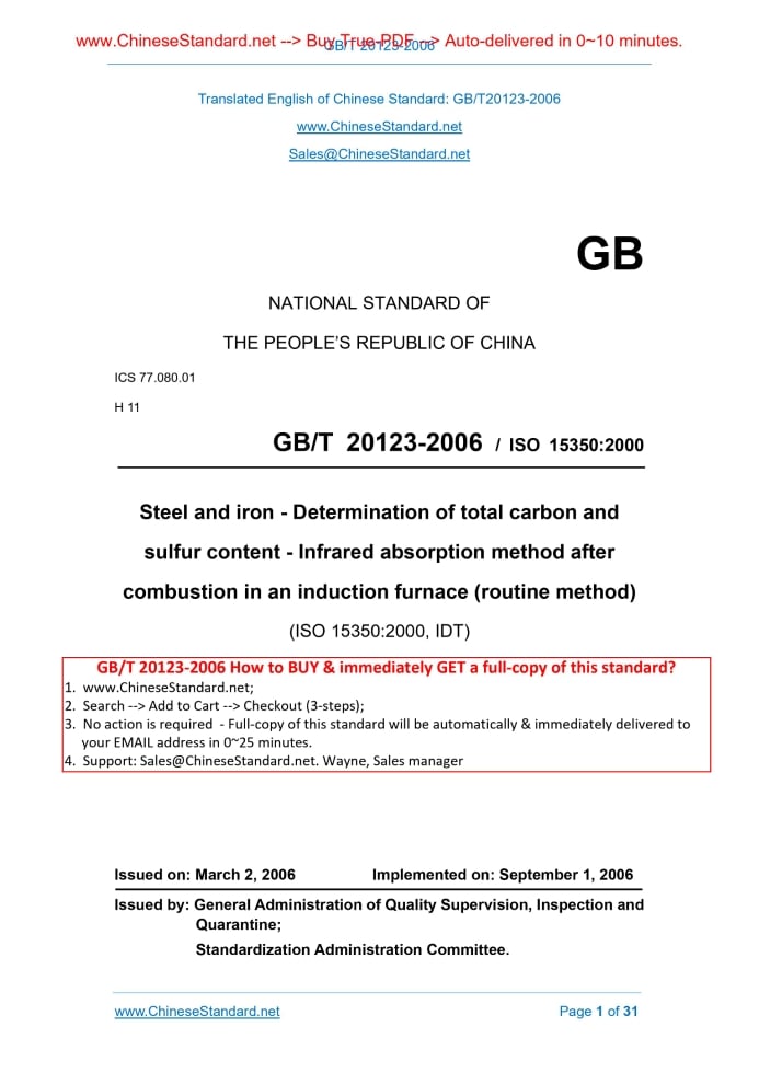 GB/T 20123-2006: Steel and iron -- Determination of total carbon and sulfur content Infrared absorption method after combustion in an induction furnace (routine method) Delivery: 9 seconds. True-PDF full-copy in English & invoice will be downloaded + auto-delivered via email. See step-by-step procedure Status: Valid