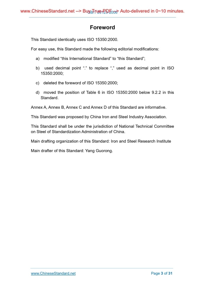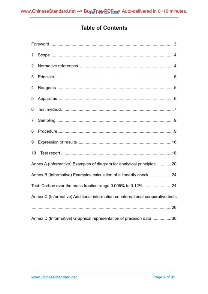Similar standardsGB/T 20123-2006: Steel and iron -- Determination of total carbon and sulfur content Infrared absorption method after combustion in an induction furnace (routine method)---This is an excerpt. Full copy of true-PDF in English version (including equations, symbols, images, flow-chart, tables, and figures etc.), auto-downloaded/delivered in 9 seconds, can be purchased online: https://www.ChineseStandard.net/PDF.aspx/GBT20123-2006 GB NATIONAL STANDARD OF THE PEOPLE’S REPUBLIC OF CHINA ICS 77.080.01 H 11 GB/T 20123-2006 / ISO 15350.2000 Steel and iron - Determination of total carbon and sulfur content - Infrared absorption method after combustion in an induction furnace (routine method) (ISO 15350.2000, IDT) Issued on. MARCH 2, 2006 Implemented on. SEPTEMBER 1, 2006 Issued by. General Administration of Quality Supervision, Inspection and Quarantine; Standardization Administration Committee. Table of ContentsForeword... 3 1 Scope... 4 2 Normative references... 4 3 Principle... 5 4 Reagents... 5 5 Apparatus... 6 6 Test method... 7 7 Sampling... 9 8 Procedure... 9 9 Expression of results... 16 10 Test report... 18 Annex A (Informative) Examples of diagram for analytical principles... 20 Annex B (Informative) Examples calculation of a linearity check... 24 Test. Carbon over the mass fraction range 0.005% to 0.12%... 24 Annex C (Informative) Additional information on international cooperative tests ... 26 Annex D (Informative) Graphical representation of precision data... 30ForewordThis Standard identically uses ISO 15350.2000. For easy use, this Standard made the following editorial modifications. a) modified “this International Standard” to “this Standard”; b) used decimal point “.” to replace “,” used as decimal point in ISO 15350.2000; c) deleted the foreword of ISO 15350.2000; d) moved the position of Table 6 in ISO 15350.2000 below 9.2.2 in this Standard. Annex A, Annex B, Annex C and Annex D of this Standard are informative. This Standard was proposed by China Iron and Steel Industry Association. This Standard shall be under the jurisdiction of National Technical Committee on Steel of Standardization Administration of China. Main drafting organization of this Standard. Iron and Steel Research Institute Main drafter of this Standard. Yang Guorong. Steel and iron - Determination of total carbon and sulfur content - Infrared absorption method after combustion in an induction furnace (routine method)1 ScopeThis Standard specifies an infrared absorption method, after combustion in an induction furnace, for the determination of the total carbon and sulfur content in steel and iron.2 Normative referencesThe following normative documents contain provisions which, through reference in this text, constitute provisions of this Standard. For dated references, subsequent amendments to, or revisions of, any of these publications do not apply. However, parties to agreements based on this Standard are encouraged to investigate the possibility of applying the most recent editions of the normative documents indicated below.3 PrincipleThe sulfur is converted to sulfur dioxide by combustion in a stream of oxygen. Measurement is by infrared absorption of the sulfur dioxide carried by a current of oxygen.4 ReagentsAn oxidation catalyst [copper(II) oxide or platinum] tube heated to 600 C followed by suitable carbon dioxide and water absorbents shall be used when the presence of organic contaminants is suspected in the oxygen.5 ApparatusOrdinary laboratory equipment plus the following shall be used.6 Test methodThis test method is written for use with commercial analysers, equipped to carry out the included operations automatically and calibrated using steels and irons of known carbon and sulfur contents. During specimen combustion, the flow of CO2 with its oxygen gas carrier is routed through the measuring chamber (see 5.1) while oxygen alone passes through the reference chamber.7 SamplingCarry out sampling in accordance with ISO 14284 or appropriate national standards for iron and steel.8 ProcedureAssemble the apparatus and prepare it for operation according to the manufacturer's instructions. Test the furnace and analyser to ensure the absence of leaks. Make a minimum of five determinations using a specimen with measurable concentrations of carbon and sulfur and accelerator as directed in 8.3 before attempting to calibrate the system or determine the blank.9 Expression of resultsA planned trial of this method was carried out by 31 laboratories, at 20 levels of carbon, each laboratory making three determinations of carbon content at each level. The data obtained showed a logarithmic relationship between sulfur content and repeatability (r) and reproducibility (R and Rw) of the test results (see note 3 of 8.2.1) as summarized in Table 6.The graphical representation of the figures is given in annex D.10 Test reportThe test report shall include the following information.Annex A(Informative) Examples of diagram for analytical principlesAnnex B(Informative) Examples calculation of a linearity check Test. Carbon over the mass fraction range 0.005% to 0.12% Reference materials.Annex C(Informative) Additional information on international cooperative tests Tables 5 and 6 were derived from the results of international analytical trials carried out in 1995 on 20 steel samples in 13 countries involving 31 laboratories. The results of the trials were reported in document ISO/TC 17/SC 1 N 1177, revised in 1998.Annex D(Informative) Graphical representation of precision data ......Source: Above contents are excerpted from the full-copy PDF -- translated/reviewed by: www.ChineseStandard.net / Wayne Zheng et al. Tips & Frequently Asked Questions:Question 1: How long will the true-PDF of English version of GB/T 20123-2006 be delivered?Answer: The full copy PDF of English version of GB/T 20123-2006 can be downloaded in 9 seconds, and it will also be emailed to you in 9 seconds (double mechanisms to
