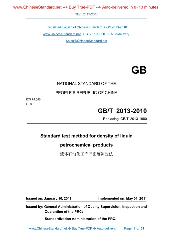 GB/T 2013-2010: Standard test method for density of liquid petrochemical products Delivery: 9 seconds. True-PDF full-copy in English & invoice will be downloaded + auto-delivered via email. See step-by-step procedure Status: Valid GB/T 2013: Historical versions