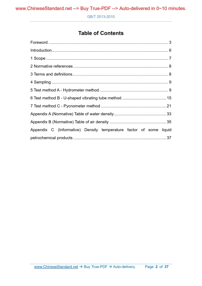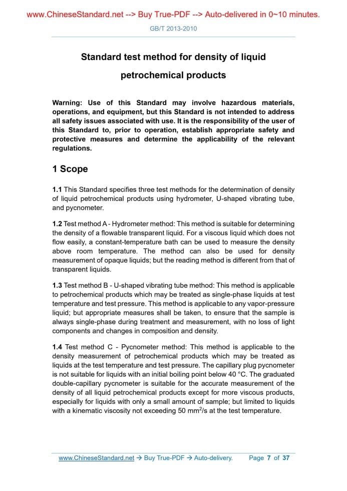 Similar standardsGB/T 2013-2010: Standard test method for density of liquid petrochemical products---This is an excerpt. Full copy of true-PDF in English version (including equations, symbols, images, flow-chart, tables, and figures etc.), auto-downloaded/delivered in 9 seconds, can be purchased online: https://www.ChineseStandard.net/PDF.aspx/GBT2013-2010NATIONAL STANDARD OF THE PEOPLE’S REPUBLIC OF CHINA ICS 75.080 E 30 Replacing GB/T 2013-1980 Standard test method for density of liquid petrochemical products ISSUED ON: JANUARY 10, 2011 IMPLEMENTED ON: MAY 01, 2011 Issued by: General Administration of Quality Supervision, Inspection and Quarantine of the PRC; Standardization Administration of the PRC. Table of ContentsForeword ... 3 Introduction ... 6 1 Scope ... 7 2 Normative references ... 8 3 Terms and definitions ... 8 4 Sampling ... 9 5 Test method A - Hydrometer method ... 9 6 Test method B - U-shaped vibrating tube method ... 15 7 Test method C - Pycnometer method ... 21 Appendix A (Normative) Table of water density ... 33 Appendix B (Normative) Table of air density ... 35 Appendix C (Informative) Density temperature factor of some liquid petrochemical products ... 37 Standard test method for density of liquid petrochemical products Warning: Use of this Standard may involve hazardous materials, operations, and equipment, but this Standard is not intended to address all safety issues associated with use. It is the responsibility of the user of this Standard to, prior to operation, establish appropriate safety and protective measures and determine the applicability of the relevant regulations.1 Scope1.1 This Standard specifies three test methods for the determination of density of liquid petrochemical products using hydrometer, U-shaped vibrating tube, and pycnometer. 1.2 Test method A - Hydrometer method: This method is suitable for determining the density of a flowable transparent liquid. For a viscous liquid which does not flow easily, a constant-temperature bath can be used to measure the density above room temperature. The method can also be used for density measurement of opaque liquids; but the reading method is different from that of transparent liquids. 1.3 Test method B - U-shaped vibrating tube method: This method is applicable to petrochemical products which may be treated as single-phase liquids at test temperature and test pressure. This method is applicable to any vapor-pressure liquid; but appropriate measures shall be taken, to ensure that the sample is always single-phase during treatment and measurement, with no loss of light components and changes in composition and density. 1.4 Test method C - Pycnometer method: This method is applicable to the density measurement of petrochemical products which may be treated as liquids at the test temperature and test pressure. The capillary plug pycnometer is not suitable for liquids with an initial boiling point below 40 °C. The graduated double-capillary pycnometer is suitable for the accurate measurement of the density of all liquid petrochemical products except for more viscous products, especially for liquids with only a small amount of sample; but limited to liquids with a kinematic viscosity not exceeding 50 mm2/s at the test temperature. Note: The unit is kilograms per cubic meter (kg/m3) or grams per cubic centimeter (g/cm3). 3.4 Density temperature factor; γ The change in liquid density for each change (rise or decrease) of temperature of 1 °C. Note: The unit is kg/(m3 • °C).4 SamplingSAMPLE according to the method specified in the product standard. When there is no requirement in the product standard, samples are taken according to the provisions of GB/T 4756 and GB/T 6680.5 Test method A - Hydrometer method5.1 Method summary PLACE the sample at a specified temperature and pour it into a density metering cylinder with approximately the same temperature. PLACE the appropriate hydrometer into the temperature-adjusted sample and let it stand still. When the temperature reaches equilibrium, read the hydrometer reading and sample temperature and convert the density or standard density as needed. If necessary, the density metering cylinder containing the sample can be placed in a constant-temperature bath, to avoid excessive temperature fluctuations during the measurement. 5.2 Sample preparation 5.2.1 Sample preparation MIX the sample so that the loss of light components of the sample is minimized and the sample integrity is maintained. 5.2.1.1 Volatile petrochemical products To reduce light component losses, the sample shall be mixed in the original container and the closed system. Note: Mixing volatile samples in open containers will result in loss of light components and will affect the measured density values. 5.4 Apparatus verification 5.4.1 The hydrometer shall be periodically verified using a standard hydrometer traceable to national standards or the density of traceable reference materials and re-verified at least once every five years. 5.4.2 The thermometer shall be periodically verified using a standard thermometer traceable to national standards. 5.5 Apparatus preparation 5.5.1 CHECK the hydrometer’s reference point to determine if the hydrometer scale is in the correct position in the main. If the scale has moved, it shall discard the hydrometer. 5.5.2 The temperature of the density metering cylinder and hydrometer is brought close to the sample temperature. 5.6 Test procedure 5.6.1 At the test temperature, transfer the sample to a temperature-stable and clean density metering cylinder, to prevent the sample from splashing and generating bubbles and to reduce the volatilization of light components. 5.6.2 USE a clean piece of filter paper to remove all bubbles formed on the sample surface. 5.6.3 PLACE the cylinder containing the sample vertically in a place where there is no air flow. Throughout the test, the ambient temperature change shall not exceed 2 °C. When the ambient temperature changes by