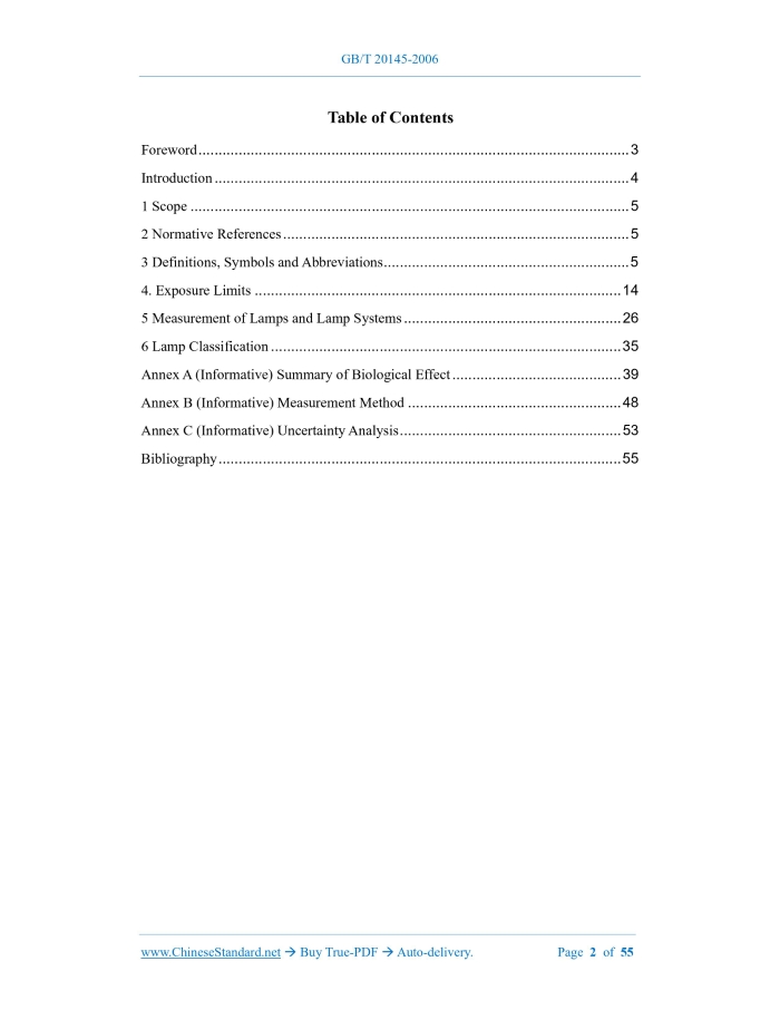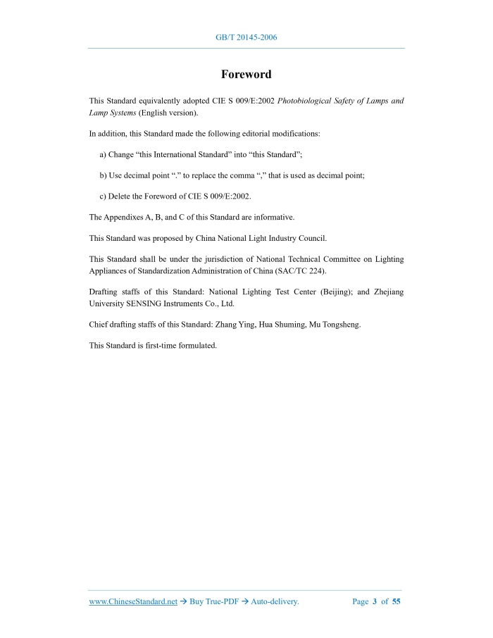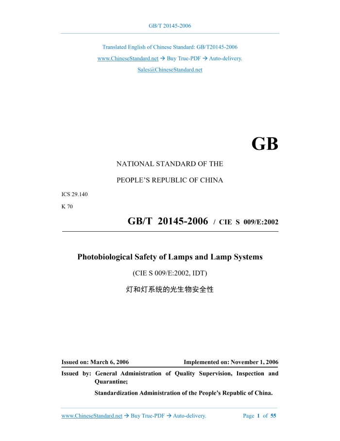 Similar standardsGB/T 20145-2006: Photobiological safety of lamps and lamp systems---This is an excerpt. Full copy of true-PDF in English version (including equations, symbols, images, flow-chart, tables, and figures etc.), auto-downloaded/delivered in 9 seconds, can be purchased online: https://www.ChineseStandard.net/PDF.aspx/GBT20145-2006GB NATIONAL STANDARD OF THE PEOPLE’S REPUBLIC OF CHINA ICS 29.140 K 70 GB/T 20145-2006 / CIE S 009/E.2002 Photobiological Safety of Lamps and Lamp Systems (CIE S 009/E.2002, IDT) Issued on. MARCH 6, 2006 Implemented on. NOVEMBER 1, 2006 Issued by. General Administration of Quality Supervision, Inspection and Quarantine; Standardization Administration of the People’s Republic of China. Table of ContentsForeword... 3 Introduction... 4 1 Scope... 5 2 Normative References... 5 3 Definitions, Symbols and Abbreviations... 5 4.Exposure Limits... 14 5 Measurement of Lamps and Lamp Systems... 26 6 Lamp Classification... 35 Annex A (Informative) Summary of Biological Effect... 39 Annex B (Informative) Measurement Method... 48 Annex C (Informative) Uncertainty Analysis... 53 Bibliography... 55ForewordThis Standard equivalently adopted CIE S 009/E.2002 Photobiological Safety of Lamps and Lamp Systems (English version). In addition, this Standard made the following editorial modifications. a) Change “this International Standard” into “this Standard”; b) Use decimal point “.” to replace the comma “,” that is used as decimal point; c) Delete the Foreword of CIE S 009/E.2002. The Appendixes A, B, and C of this Standard are informative. This Standard was proposed by China National Light Industry Council. This Standard shall be under the jurisdiction of National Technical Committee on Lighting Appliances of Standardization Administration of China (SAC/TC 224). Drafting staffs of this Standard. National Lighting Test Center (Beijing); and Zhejiang University SENSING Instruments Co., Ltd. Chief drafting staffs of this Standard. Zhang Ying, Hua Shuming, Mu Tongsheng. This Standard is first-time formulated.1 ScopeThis Standard gives guidance for evaluating the photobiological safety of lamps and lamp systems including luminaires. Specifically, it specifies the exposure limits, reference measurement technique and classification scheme for the evaluation and control of photobiological hazards from all electrically powered incoherent broadband sources of optical radiation, including LEDs but excluding lasers, in the wavelength range from 200 nm through 3000 nm.2 Normative ReferencesThe provisions in following documents become the provisions of this Standard through reference in this Standard. For dated references, the subsequent amendments (excluding corrigendum) or revisions do not apply to this Standard, however, parties who reach an agreement based on this Standard are encouraged to study if the latest versions of these documents are applicable. For undated references, the latest edition of the referenced document applies. CIE 17.4.1987 International lighting vocabulary (ILV) – Joint publication IEC/CIE3 Definitions, Symbols and AbbreviationsFor the purposes of this standard, the following definitions, symbols and abbreviations apply. Visual angle subtended by the apparent source at the eye of an observer or at the point of measurement. In this Standard, subtended angles are denoted by the full included angle, not the half angle. 4.Exposure Limits The exposure limits in this standard apply to continuous sources where the exposure duration is not less than 0.01 ms and not more than any 8-hour period, and should be used as guides in the control of exposure. The values should not be regarded as precisely defined lines between safe and unsafe levels.5 Measurement of Lamps and Lamp SystemsThe measurement of optical radiation for the purpose of computing photobiological radiation values poses significant challenges for the radiometrist. Typical photobiological action spectra such as SUV(λ) have rapidly changing values with slight change in wavelength. Operation of the test lamp shall be provided in accordance with the appropriate IEC lamp standard. If no standard for the lamp type exists, the lamp manufacturer’s recommendation for operation should be used.6 Lamp ClassificationThe classification of this Standard was developed by reference of the provisions of CIE TC 6- 47.This joint effort was deemed important so that issues concerning risk group classification and distance at which the photobiological hazard values due to lamp radiation are reported could be agreed upon.Annex A(Informative) Summary of Biological Effect Bioeffect datasheet #1.Infrared cataractAnnex B(Informative) Measurement Method Modern broadband detectors, when calibrated against the appropriate action spectrum, and with appropriate precaution, may be used. When faced with short duration pulsed or low intensity sources, they are convenient to use. Broadband hazard sensors normally attempt to match the weighting spectra by the use of filters.Annex C(Informative) Uncertainty Analysis The analysis of uncertainty requires that all sources of uncertainty be quantitatively evaluated. The first step in uncertainty analysis is identifying the various uncertainty sources. Below is a list that can be the start of the evaluation of uncertainty for measurements used in classifying lamps and lamp systems. See further details in CIE 53.1982 Methods of characterizing the performance of radiometers and photometers. ......Source: Above contents are excerpted from the full-copy PDF -- translated/reviewed by: www.ChineseStandard.net / Wayne Zheng et al. Tips & Frequently Asked Questions:Question 1: How long will the true-PDF of English version of GB/T 20145-2006 be delivered?Answer: The full copy PDF of English version of GB/T 20145-2006 can be downloaded in 9 seconds, and it will also be emailed to you in 9 seconds (double mechanisms to ensure the delivery reliably), with PDF-invoice.Question 2: Can I s