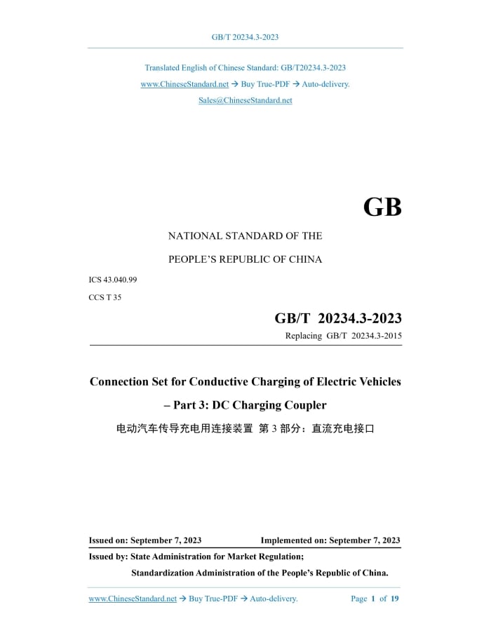 GB/T 20234.3-2023: Connection set for conductive charging of electric vehicles - Part 3: DC charging coupler Delivery: 9 seconds. True-PDF full-copy in English & invoice will be downloaded + auto-delivered via email. See step-by-step procedure Status: Valid GB/T 20234.3: Historical versions