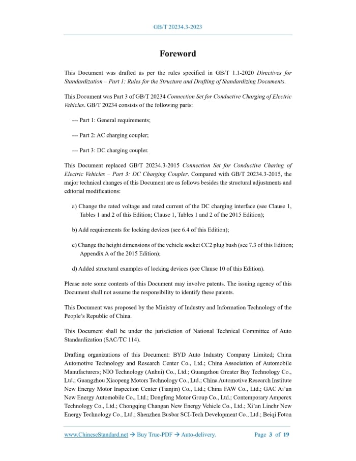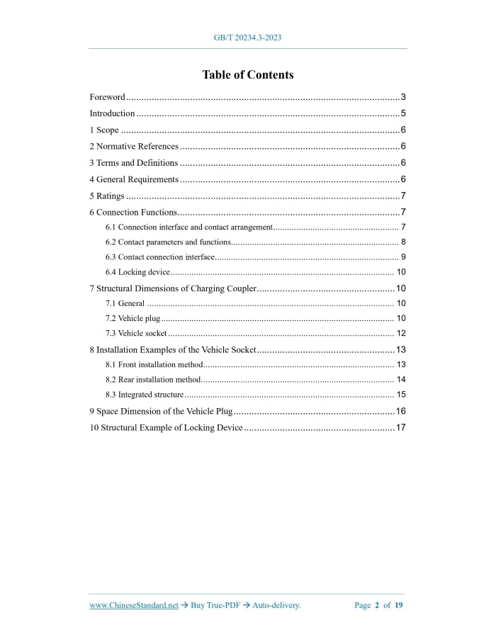 Similar standardsGB/T 20234.3-2023: Connection set for conductive charging of electric vehicles - Part 3: DC charging coupler---This is an excerpt. Full copy of true-PDF in English version (including equations, symbols, images, flow-chart, tables, and figures etc.), auto-downloaded/delivered in 9 seconds, can be purchased online: https://www.ChineseStandard.net/PDF.aspx/GBT20234.3-2023 GB NATIONAL STANDARD OF THE PEOPLE’S REPUBLIC OF CHINA ICS 43.040.99 CCS T 35 Replacing GB/T 20234.3-2015 Connection Set for Conductive Charging of Electric Vehicles – Part 3.DC Charging Coupler Issued on: SEPTEMBER 7, 2023 Implemented on: SEPTEMBER 7, 2023 Issued by. State Administration for Market Regulation; Standardization Administration of the People’s Republic of China. Table of ContentsForeword... 3 Introduction... 5 1 Scope... 6 2 Normative References... 6 3 Terms and Definitions... 6 4 General Requirements... 6 5 Ratings... 7 6 Connection Functions... 7 6.1 Connection interface and contact arrangement... 7 6.2 Contact parameters and functions... 8 6.3 Contact connection interface... 9 6.4 Locking device... 10 7 Structural Dimensions of Charging Coupler... 10 7.1 General... 10 7.2 Vehicle plug... 10 7.3 Vehicle socket... 12 8 Installation Examples of the Vehicle Socket... 13 8.1 Front installation method... 13 8.2 Rear installation method... 14 8.3 Integrated structure... 15 9 Space Dimension of the Vehicle Plug... 16 10 Structural Example of Locking Device... 17ForewordThis Document was drafted as per the rules specified in GB/T 1.1-2020 Directives for Standardization – Part 1.Rules for the Structure and Drafting of Standardizing Documents. This Document was Part 3 of GB/T 20234 Connection Set for Conductive Charging of Electric Vehicles. GB/T 20234 consists of the following parts. --- Part 1.General requirements; --- Part 2.AC charging coupler; --- Part 3.DC charging coupler. This Document replaced GB/T 20234.3-2015 Connection Set for Conductive Charing of Electric Vehicles – Part 3.DC Charging Coupler. Compared with GB/T 20234.3-2015, the major technical changes of this Document are as follows besides the structural adjustments and editorial modifications. a) Change the rated voltage and rated current of the DC charging interface (see Clause 1, Tables 1 and 2 of this Edition; Clause 1, Tables 1 and 2 of the 2015 Edition); b) Add requirements for locking devices (see 6.4 of this Edition); c) Change the height dimensions of the vehicle socket CC2 plug bush (see 7.3 of this Edition; Appendix A of the 2015 Edition); d) Added structural examples of locking devices (see Clause 10 of this Edition). Please note some contents of this Document may involve patents. The issuing agency of this Document shall not assume the responsibility to identify these patents. This Document was proposed by the Ministry of Industry and Information Technology of the People’s Republic of China. This Document shall be under the jurisdiction of National Technical Committee of Auto Standardization (SAC/TC 114). Drafting organizations of this Document. BYD Auto Industry Company Limited; China Automotive Technology and Research Center Co., Ltd.; China Association of Automobile Manufacturers; NIO Technology (Anhui) Co., Ltd.; Guangzhou Greater Bay Technology Co., Ltd.; Guangzhou Xiaopeng Motors Technology Co., Ltd.; China Automotive Research Institute New Energy Motor Inspection Center (Tianjin) Co., Ltd.; China FAW Co., Ltd.; GAC Ai’an New Energy Automobile Co., Ltd.; Dongfeng Motor Group Co., Ltd.; Contemporary Amperex Technology Co., Ltd.; Chongqing Changan New Energy Vehicle Co., Ltd.; Xi’an Linchr New Energy Technology Co., Ltd.; Shenzhen Busbar SCI-Tech Development Co., Ltd.; Beiqi FotonIntroductionConductive charging is the basic way to realize electric energy supply for electric vehicles. GB/T 20234 aims to standardize the technical requirements and test methods of charging connection devices and unify the interface type and structural size of charging interfaces, thereby realizing the interconnection between electric vehicles and charging infrastructure. GB/T 20234 is planned to consist of the following 4 parts. --- Part 1.General requirements. It aims to establish the general performance requirements for charging connection devices and ensure the functionality and reliability of the product. --- Part 2.AC charging coupler. It aims to establish the contact definition, contact connection interface, structural dimensions, etc. of the AC charging coupler to achieve the interchangeability of the AC charging coupler. --- Part 3.DC charging coupler. It aims to establish the contact definition, contact connection interface, structural dimensions, etc. of the DC charging coupler (including high-power charging) to achieve the interchangeability of the DC charging coupler. --- Part 4.High-power DC charging coupler. It aims to establish the composition, coupler function and layout, cable requirements, thermal management system, technical requirements, test methods, etc. of the DC charging connection device, as well as the definition, technical requirements, test methods, inspection rules, etc. of the adapter. In order to cover more charging scenarios, it is necessary to expand the rating of the DC charging coupler to meet the use requirements of high-power DC charging and low-power DC charging, respectively. As the physical connection interface between electric vehicles and charging infrastructure, the charging coupler needs to maintain compatibility and interchangeability with already produced electric vehicles and built charging equipment. Connection Set for Conductive Charging of Electric Vehicles – Part 3.DC Charging Coupler1 ScopeThis Document specifies the general requirements, ratings, connection interface, contact arrangement, contact function, model, structural dimensions and other requirements for the DC charging coupler for conductive charging of electric vehicles. This Document applies to DC charging c